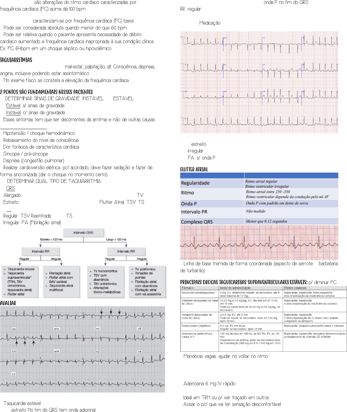 Taquiarritmias TAQUICARDIAS: são alterações do ritmo cardíaco caracterizadas por frequência cardíaca (FC) acima de 100 bpm BRADICARDIAS: caracterizam-se por frequência cardíaca (FC) baixa. • Pode ser considerada absoluta quando menor do que 60 bpm • Pode ser relativa quando o paciente apresenta necessidade de débito cardíaco aumentado e frequência cardíaca inapropriada à sua condição clínica Ex: FC 64bpm em um choque séptico ou hipovolêmico • Podem ser sintomas variáveis: mal-estar, palpitação, alt. Consciência, dispneia, angina, inclusive podendo estar assintomático • No exame físico se constata a elevação da frequência cardíaca 1º: DETERMINAR SINAIS DE GRAVIDADE (INSTÁVEL OU ESTÁVEL) - PCT ↝ Estável: s/ sinais de gravidade ↝ Instável: c/ sinais de gravidade • Esses sintomas tem que ser decorrentes da arritmia e não de outras causas Critérios de Instabilidade - Hipotensão / choque hemodinâmico - Rebaixamento do nível de consciência (má perfusão cerebral) - Dor torácica de característica cardíaca (dor anginosa) - Síncope / pré-síncope - Dispnéia (congestão pulmonar) • Realizar cardioversão elétrica: pct acordado, deve fazer sedação e fazer de forma sincronizada (dar o choque no momento certo) 2º: DETERMINAR QUAL TIPO DE TAQUIARRITMIA - ECG ↝ QRS • Alargado: feixe por outra via, despolarizando + demorado, <120ms, TV • Estreito: feixe despolarizando uniforme, <120ms, Flutter Atrial, TSV, TS ↝ RR • Regular: TSV Reentrada (TRN), TS (Taquicardia Sinusal) • Irregular: FA (Fibrilação atrial) FC: última linha (D2) Cada QRS ocupa 10seg x 6 = FC - Taquicardia estavel QRS: estreito No fim do QRS tem onda adicional (TRN – reg. do Nó AV e despolariza o ventrículo e átrio juntos, vê onda P no fim do QRS) RR: regular Dx: TS: deve conseguir ver onda P Conduta: Medicação FC: taquicardia estável QRS: estreito RR: irregular Dx: FA: s/ onda P (linha da base tremida) • Linha de base tremida de forma coordenada (aspecto de serrote – barbatana de turbarão) p/ diminuir FC • Manobras vagais: ajudar nó voltar no ritmo - Massagem seio carotídeo (nào fazer em idoso) - Valsalva (sobrar dorso da mão) - Gelo na testa • Adenosina 6 mg IV rápido (que deixa o pct por seg s/ batimentos cardíacos p/ voltar ao ritmo e ver qual é a arritmia - Ideal em TRN ou p/ ver traçado em outros - Avisar o pct que vai ter sensação desconfortável (não precisa fazer sedação) nael8 Realce nael8 Realce nael8 Realce nael8 Realce nael8 Realce nael8 Realce nael8 Realce nael8 Realce nael8 Realce nael8 Realce nael8 Realce nael8 Realce nael8 Realce nael8 Realce nael8 Realce nael8 Realce nael8 Realce nael8 Realce nael8 Realce nael8 Realce nael8 Realce nael8 Realce nael8 Realce nael8 Realce nael8 Realce nael8 Realce nael8 Realce nael8 Realce nael8 Realce nael8 Realce nael8 Realce nael8 Realce nael8 Realce nael8 Realce nael8 Realce nael8 Realce nael8 Realce nael8 Realce nael8 Realce nael8 Realce nael8 Realce nael8 Realce nael8 Realce nael8 Realce nael8 Realce nael8 Realce nael8 Realce nael8 Realce nael8 Realce nael8 Realce nael8 Realce nael8 Realce nael8 Realce nael8 Realce nael8 Realce nael8 Realce nael8 Realce nael8 Realce nael8 Realce nael8 Realce nael8 Realce nael8 Realce nael8 Realce nael8 Realce nael8 Realce nael8 Realce nael8 Realce nael8 Realce nael8 Realce nael8 Realce nael8 Realce QRS: alargado Dx: TV monomórfica (c/ pulso), DC inadequado (geralmente instável) Conduta: Cardioversão Sempre (Instável ou Estável - pode usar medicamento) Bradiarritmias Podem ter várias causas IMPORTANTES: medicamentosa, doença do nó sinusal (idoso), hipotireoidismo descompensado, hipotermia FUNDAMENTAL DETERMINAR SE É INSTÁVEL OU ESTÁVEL ↝ Estável: s/ sinais de gravidade ↝ Instável: c/ sinais de gravidade - Hipotensão / choque hemodinâmico - Rebaixamento do nível de consciência (que ocorre pela má perfusão cerebral) - Dor torácica de característica cardíaca (dor anginosa) - Síncope / pré-síncope - Dispnéia (devido desenvolvimento de congestão pulmonar) Conduta: medicamento ou marca-passo FC: baixa Vê onda P antes de QRS com intervalo PR normal º º - grave FC: baixa, Entre Onda P e QRS a distancia é maior e regular (PR alargado) º º + grave Entre onda P e QRS tem maior distância e algumas s/ QRS Avisa que vai acontecer: as ondas P vão se afastando aos poucos até não ter º º ++ grave Entre onda P e QRS tem maior distância e algumas s/ QRSNão visa que vai acontecer: as ondas P, é aleatório nael8 Realce nael8 Realce nael8 Realce nael8 Realce nael8 Realce nael8 Realce nael8 Realce nael8 Realce nael8 Realce nael8 Realce nael8 Realce nael8 Realce nael8 Realce nael8 Realce nael8 Realce nael8 Realce nael8 Realce nael8 Realce nael8 Realce nael8 Realce nael8 Realce nael8 Realce nael8 Realce nael8 Realce nael8 Realce nael8 Realce nael8 Realce nael8 Realce nael8 Realce nael8 Realce nael8 Realce nael8 Realce nael8 Realce nael8 Realce nael8 Realce nael8 Realce nael8 Realce nael8 Realce nael8 Realce nael8 Realce nael8 Realce nael8 Realce nael8 Realce nael8 Realce nael8 Realce nael8 Realce nael8 Realce nael8 Realce nael8 Realce nael8 Realce nael8 Realce nael8 Realce nael8 Realce nael8 Realce nael8 Realce nael8 Realce nael8 Realce nael8 Realce nael8 Realce nael8 Realce nael8 Realce nael8 Realce º • Dissociação completa do átrio e ventrículo (por conta própria) FC + baixa (20-25) • QRS deformado, alargado, onda P no seu ritmo próprio e QRS tbm c/ seu ritmo próprio (cada um em um ritmo), ineficaz p/ bomba. Geralmente instável ESTÁVEL: investigar causa INSTÁVEL: investigar causa e conduta • Atropina: p/ aumentar FC - Se não melhorar: avaliar se precisa de marcapasso de urgência (transcutâneo pelo desfibrilador ou transvenoso central c/ fio guia até entrar no ventrículo) • Dar antídotos p/ causa - Bloqueador Ca: Ca - Betabloqueador: Glucagon - Digoxina: Ac antidigoxina • Droga vasoativa: Adrenal