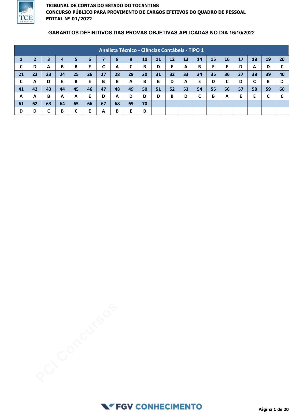 pcimarkpci MjgwNDowMWIxOjQxODM6N2Q4NDowYzhiOmQ1NzI6MDkzNzo3M2Qx:TW9uLCAwMSBKdWwgMjAyNCAxNjowNzoxNiAtMDMwMA== www.pciconcursos.com.br TRIBUNAL DE CONTAS DO ESTADO DO TOCANTINS CONCURSO PÚBLICO PARA PROVIMENTO DE CARGOS EFETIVOS DO QUADRO DE PESSOAL EDITAL Nº 01/2022 GABARITOS DEFINITIVOS DAS PROVAS OBJETIVAS APLICADAS NO DIA 16/10/2022 Página 1 de 20 Analista Técnico - Ciências Contábeis - TIPO 1 1 2 3 4 5 6 7 8 9 10 11 12 13 14 15 16 17 18 19 20 C D A B B E C A C B D E A B E E D A D C 21 22 23 24 25 26 27 28 29 30 31 32 33 34 35 36 37 38 39 40 C A D E B E B B A B B D A E D C D C B D 41 42 43 44 45 46 47 48 49 50 51 52 53 54 55 56 57 58 59 60 A A B A A E D A D D D B D C B A E E C C 61 62 63 64 65 66 67 68 69 70 D D C B C E A B E B pcimarkpci MjgwNDowMWIxOjQxODM6N2Q4NDowYzhiOmQ1NzI6MDkzNzo3M2Qx:TW9uLCAwMSBKdWwgMjAyNCAxNjowNzoxNiAtMDMwMA== www.pciconcursos.com.br TRIBUNAL DE CONTAS DO ESTADO DO TOCANTINS CONCURSO PÚBLICO PARA PROVIMENTO DE CARGOS EFETIVOS DO QUADRO DE PESSOAL EDITAL Nº 01/2022 GABARITOS DEFINITIVOS DAS PROVAS OBJETIVAS APLICADAS NO DIA 16/10/2022 Página 2 de 20 Analista Técnico - Direito - TIPO 1 1 2 3 4 5 6 7 8 9 10 11 12 13 14 15 16 17 18 19 20 C D A B B E C A C B D E A B E E D A D C 21 22 23 24 25 26 27 28 29 30 31 32 33 34 35 36 37 38 39 40 C A D E B C A B A C E C D E E A C C B B 41 42 43 44 45 46 47 48 49 50 51 52 53 54 55 56 57 58 59 60 D B E A E C D E B D A C B E A D B C D C 61 62 63 64 65 66 67 68 69 70 B A E D C A B D E C pcimarkpci MjgwNDowMWIxOjQxODM6N2Q4NDowYzhiOmQ1NzI6MDkzNzo3M2Qx:TW9uLCAwMSBKdWwgMjAyNCAxNjowNzoxNiAtMDMwMA== www.pciconcursos.com.br TRIBUNAL DE CONTAS DO ESTADO DO TOCANTINS CONCURSO PÚBLICO PARA PROVIMENTO DE CARGOS EFETIVOS DO QUADRO DE PESSOAL EDITAL Nº 01/2022 GABARITOS DEFINITIVOS DAS PROVAS OBJETIVAS APLICADAS NO DIA 16/10/2022 Página 3 de 20 Analista Técnico - Enfermagem - TIPO 1 1 2 3 4 5 6 7 8 9 10 11 12 13 14 15 16 17 18 19 20 C D A B B E C A C B D E A B E E D A D C 21 22 23 24 25 26 27 28 29 30 31 32 33 34 35 36 37 38 39 40 C A D E B E B B A B B D A E D B B E D D 41 42 43 44 45 46 47 48 49 50 51 52 53 54 55 56 57 58 59 60 C C C B * A D C B A D C D D D A B D D D 61 62 63 64 65 66 67 68 69 70 B C D E A E C B C B (*) questão anulada pcimarkpci MjgwNDowMWIxOjQxODM6N2Q4NDowYzhiOmQ1NzI6MDkzNzo3M2Qx:TW9uLCAwMSBKdWwgMjAyNCAxNjowNzoxNiAtMDMwMA== www.pciconcursos.com.br TRIBUNAL DE CONTAS DO ESTADO DO TOCANTINS CONCURSO PÚBLICO PARA PROVIMENTO DE CARGOS EFETIVOS DO QUADRO DE PESSOAL EDITAL Nº 01/2022 GABARITOS DEFINITIVOS DAS PROVAS OBJETIVAS APLICADAS NO DIA 16/10/2022 Página 4 de 20 Analista Técnico - Fisioterapia - TIPO 1 1 2 3 4 5 6 7 8 9 10 11 12 13 14 15 16 17 18 19 20 C D A B B E C A C B D E A B E E D A D C 21 22 23 24 25 26 27 28 29 30 31 32 33 34 35 36 37 38 39 40 C A D E B E B B A B B D A E D C D C B E 41 42 43 44 45 46 47 48 49 50 51 52 53 54 55 56 57 58 59 60 D C D B A E C D A B D D E D C C D A B E 61 62 63 64 65 66 67 68 69 70 C E E A B C E A D E pcimarkpci MjgwNDowMWIxOjQxODM6N2Q4NDowYzhiOmQ1NzI6MDkzNzo3M2Qx:TW9uLCAwMSBKdWwgMjAyNCAxNjowNzoxNiAtMDMwMA== www.pciconcursos.com.br TRIBUNAL DE CONTAS DO ESTADO DO TOCANTINS CONCURSO PÚBLICO PARA PROVIMENTO DE CARGOS EFETIVOS DO QUADRO DE PESSOAL EDITAL Nº 01/2022 GABARITOS DEFINITIVOS DAS PROVAS APLICADAS NO DIA 16/10/2022 Página 5 de 20 Analista Técnico - Letras - TIPO 1 1 2 3 4 5 6 7 8 9 10 11 12 13 14 15 16 17 18 19 20 C D A B B E C A C B D E A B E E D A D C 21 22 23 24 25 26 27 28 29 30 31 32 33 34 35 36 37 38 39 40 C A D E B E B B A B B D A E D C D B C E 41 42 43 44 45 46 47 48 49 50 51 52 53 54 55 56 57 58 59 60 B A A C E D B D A D B C C C D E D B C E 61 62 63 64 65 66 67 68 69 70 A B C A E D B D C D pcimarkpci MjgwNDowMWIxOjQxODM6N2Q4NDowYzhiOmQ1NzI6MDkzNzo3M2Qx:TW9uLCAwMSBKdWwgMjAyNCAxNjowNzoxNiAtMDMwMA== www.pciconcursos.com.br TRIBUNAL DE CONTAS DO ESTADO DO TOCANTINS CONCURSO PÚBLICO PARA PROVIMENTO DE CARGOS EFETIVOS DO QUADRO DE PESSOAL EDITAL Nº 01/2022 GABARITOS DEFINITIVOS DAS PROVAS APLICADAS NO DIA 16/10/2022 Página 6 de 20 Analista Técnico - Medicina - TIPO 1 1 2 3 4 5 6 7 8 9 10 11 12 13 14 15 16 17 18 19 20 C D A B B E C A C B D E A B E E D A D C 21 22 23 24 25 26 27 28 29 30 31 32 33 34 35 36 37 38 39 40 C A D E B E B B A B B D A E D * E E B E 41 42 43 44 45 46 47 48 49 50 51 52 53 54 55 56 57 58 59 60 C C B B C A D A D D E E B D E B B D A E 61 62 63 64 65 66 67 68 69 70 D C E E A E A E B D (*) questão anulada pcimarkpci MjgwNDowMWIxOjQxODM6N2Q4NDowYzhiOmQ1NzI6MDkzNzo3M2Qx:TW9uLCAwMSBKdWwgMjAyNCAxNjowNzoxNiAtMDMwMA== www.pciconcursos.com.br TRIBUNAL DE CONTAS DO ESTADO DO TOCANTINS CONCURSO PÚBLICO PARA PROVIMENTO DE CARGOS EFETIVOS DO QUADRO DE PESSOAL EDITAL Nº 01/2022 GABARITOS DEFINITIVOS DAS PROVAS APLICADAS NO DIA 16/10/2022 Página 7 de 20 Analista Técnico - Nível Superior - TIPO 1 1 2 3 4 5 6 7 8 9 10 11 12 13 14 15 16 17 18 19 20 C D A B B E C A C B D E A B E E D A D C 21 22 23 24 25 26 27 28 29 30 31 32 33 34 35 36 37 38 39 40 C A D E B E B B A B B D A E D C A B D C 41 42 43 44 45 46 47 48 49 50 51 52 53 54 55 56 57 58 59 60 E B C A E C C C E A C B E D D E D C D E 61 62 63 64 65 66 67 68 69 70 B D A B A B A E B C pcimarkpci MjgwNDowMWIxOjQxODM6N2Q4NDowYzhiOmQ1NzI6MDkzNzo3M2Qx:TW9uLCAwMSBKdWwgMjAyNCAxNjowNzoxNiAtMDMwMA== www.pciconcursos.com.br TRIBUNAL DE CONTAS DO ESTADO DO TOCANTINS CONCURSO PÚBLICO PARA PROVIMENTO DE CARGOS EFETIVOS DO QUADRO DE PESSOAL EDITAL Nº 01/2022 GABARITOS DEFINITIVOS DAS PROVAS APLICADAS NO DIA 16/10/2022 Página 8 de 20 Analista Técnico - Odontologia - TIPO 1 1 2 3 4 5 6 7 8 9 10 11 12 13 14 15 16 17 18 19 20 C D A B B E C A C B D E A B E E D A D C 21 22 23 24 25 26 27 28 29 30 31 32 33 34 35 36 37 38 39 40 C A D E B E B B A B B D A E D C A D E B 41 42 43 44 45 46 47 48 49 50 51 52 53 54 55 56 57 58 59 60 B E D E C E B D C A C B C E A E E * C D 61 62 63 64 65 66 67 68 69 70 E E C D E A B C D C (*) questão anulada pcimarkpci MjgwNDowMWIxOjQxODM6N2Q4NDowYzhiOmQ1NzI6MDkzNzo3M2Qx:TW9uLCAwMSBKdWwg