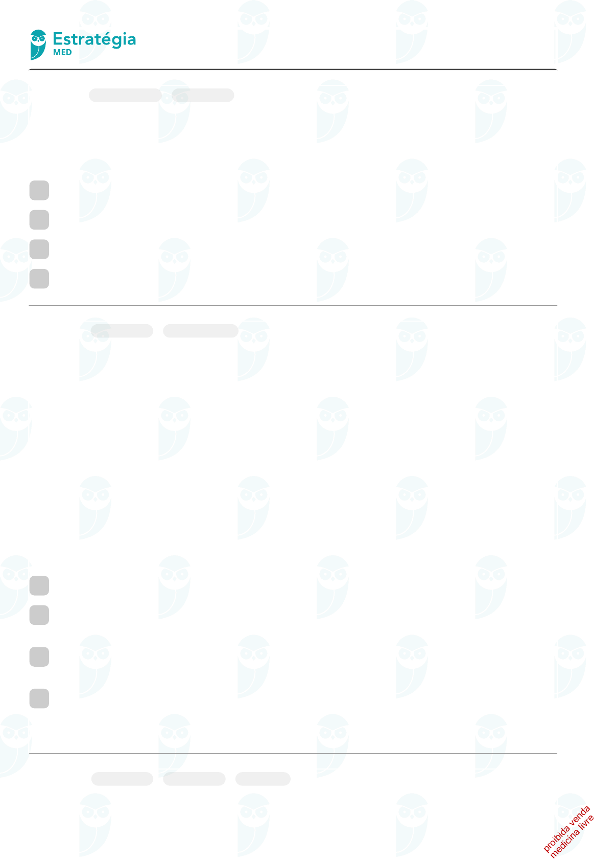 Hanseníase At.me/medicinalivre cessar Lista Questão 1 Reação do tipo 1 Dermatologia Homem, 40 anos, em tratamento de hanseníase dimorfa com poliquimioterapia multibacilar (PQT MB) há 2 meses, apresenta edema e aumento das lesões de pele, além de aparecimento de lesões ao redor das lesões prévias há 15 dias. Em associação, relata dor intensa na região de fossa cubital direita e piora do formigamento na mão ipsilateral. Não apresenta outras patologias ou alterações ao exame físico. Qual a conduta mais adequada? A Ultrassonografia de nervos e substituição para PQT alternativa. B Eletroneuromiografia e suspensão da PQT MB. C Talidomida e substituição para PQT alternativa. D Corticoterapia e manutenção da PQT MB. Essa questão possui comentário do professor no site 4000182155 Questão 2 Dermatologia Reação do tipo 2 Em seu turno de demanda espontânea na sua UBS, você atende Cleodécio, de 54 anos, que refere estar fazendo uma consulta de retorno. Ele relata que “o pé esquerdo está morto, o olho esquerdo está muito seco e há manchas na pele” e traz o resultado de um exame de baciloscopia de raspado intradérmico para pesquisa de BAAR que foi solicitado por outro médico. O resultado do exame é negativo. Em seu exame físico, apresenta face in ltrada e madarose. Há oito lesões papulares escuras, endurecidas, não dolorosas e não pruriginosas em tórax, dorso e membros inferiores. Em membro inferior esquerdo, você observa espessamento do nervo bular comum. O exame dermatoneurológico mostra alteração de sensibilidade em face, região medial do antebraço à direita, região lateral da perna esquerda e dorso de pé esquerdo. A avaliação de funções motoras evidencia garra ulnar à direita e perda da dorsiflexão de pé esquerdo. Próximo de concluir a PQT-U iniciada, Cleodécio procura novo atendimento. Ele relata início súbito de febre, artralgia múltipla, queda de estado geral, nódulos e placas eritematosos difusos dolorosos. Ele refere também episódios de “sensação de dor em choque nos nervos”, parestesia difusa e piora aguda de função motora. Em breve revisão de prontuário, está registrado que Cleodécio não possui comorbidades cardiovasculares, nem endócrino-metabólicas. Qual é a principal hipótese diagnóstica e qual conduta terapêutica? A Reação hansênica tipo 1. Não iniciar tratamento medicamentoso, mas encaminhar para centro de referência. B Reação hansênica tipo 2. Iniciar tratamento medicamentoso com metilprednisolona EV e encaminhar para centro de referência. C Reação hansênica tipo 1. Iniciar profilaxia para estrongilodíase, iniciar Prednisona 1mg/kg/dia, iniciar Amitriptilina 25mg/dia e aumento gradativo, se persistência de sintomas neurológicos. Encaminhar para centro de referência. D Reação hansênica tipo 2. Iniciar profilaxia para estrongilodíase, iniciar Prednisona 1mg/kg/dia, iniciar Amitriptilina 25mg/dia, com aumento gradativo, se persistência de sintomas neurológicos. Encaminhar para centro de referência. Essa questão possui comentário do professor no site 4000181391 Questão 3 Classif icação Dermatologia Tratamento Em seu turno de demanda espontânea na sua UBS, você atende Cleodécio, de 54 anos, que refere estar fazendo uma consulta de retorno. Ele relata que “o pé esquerdo está morto, o olho esquerdo está muito seco e há manchas na pele” e med ici na liv re pro ibi da ve nd a https://med.estrategia.com/cadernos-e-simulados/cadernos/4ecaebf8-2559-464f-94b1-5f18ff3c7aae traz o resultado de um exame de baciloscopia de raspado intradérmico para pesquisa de BAAR que foi solicitado por outro médico. O resultado do exame é negativo. Em seu exame físico, apresenta face in ltrada e madarose. Há oito lesões papulares escuras, endurecidas, não dolorosas e não pruriginosas em tórax, dorso e membros inferiores. Em membro inferior esquerdo, você observa espessamento do nervo bular comum. O exame dermatoneurológico mostra alteração de sensibilidade em face, região medial do antebraço à direita, região lateral da perna esquerda e dorso de pé esquerdo. A avaliação de funções motoras evidencia garra ulnar à direita e perda da dorsiflexão de pé esquerdo. Para ns de conduta terapêutica, qual classi cação funcional da Hanseníase de Cleodécio e por quanto tempo a Poliquimioterapia Única (PQT-U) deve ser adotada? A Multibacilar, pois há mais de cinco lesões de pele. O esquema terapêutico deve ser mantido por seis meses, tendo em vista a baciloscopia negativa. B Multibacilar, pois há mais de cinco lesões de pele. O esquema terapêutico deve ser mantido por doze meses, tendo em vista a classificação funcional. C Paucibacilar, pois a baciloscopia está negativa. O esquema terapêutico deve ser mantido por seis meses, tendo em vista a classificação funcional. D O esquema terapêutico deve ser mantido por doze meses, pois o paciente apresenta acometimento neural. Essa questão possui comentário do professor no site 4000181390 Questão 4 Reação do tipo 1 Paciente masculino, 42 anos, natural e procedente de Natal, morador da Zona Norte, vigilante, casado. Vem à consulta e informa surgimento, há 2 anos, de manchas hipocrômicas assintomáticas no abdome que, paulatinamente, atingiram o dorso, os braços e as pernas. Há um ano, refere presença de lesões eritemato-edematosas in ltradas, com bordas internas bem de nidas, mas as externas pouco de nidas; e agora acometem também a face. Elas têm dimensões distintas, variando de poucos centímetros a lesões muito grandes. Esporadicamente, elas tornam-se mais evidentes, vermelhas, edematosas e “quentes”. Nesses episódios agudos, associam- se a artralgias, febre medida, inapetência e cansaço físico. Na última piora, há um mês, surgiu também uma dor intensa no cotovelo esquerdo, que, ao ser apalpado, evidenciou o nervo ulnar espessado e doloroso. Além disso, notou-se perda da sensibilidade 