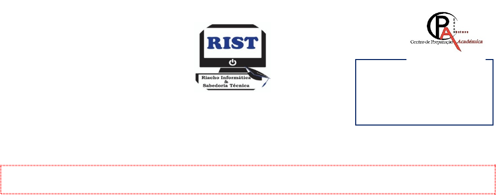 Classificação:_________ Assinatura:___________ Riacho Informática & Sabedoria Técnica Curso de Informática Básica EXAME ÚNICO Nome Completo: __________________________________________________. Data…../…./202… Leia as questões e responda de forma clara, incisiva e objectiva evitando rasuras, de modo a não prejudicar o seu resultado! O exame compreende duas partes: teórica e pratica! 1. O que é o computador?____________________________________________________________________ ________________________________________________________________________________________ a) Mencione quatro (4) características principais do computador. _____________________________________ ________________________________________________________________________________________ ________________________________________________________________________________________ b) Quais são as vantagens do uso do computador quanto a: i. Velocidade _____________________________________________________________________________ ii. Aumento de produtividade ________________________________________________________________ iii. Confiabilidade_________________________________________________________________________ iv. Versatilidade___________________________________________________________________________ c) Indique as quatro operações básica do computador. ________________________________________________________________________________________ d) Qual é a importância da informatica? ________________________________________________________ ________________________________________________________________________________________ e) Define hardware e dê cinco exemplos.________________________________________________________ ________________________________________________________________________________________ ________________________________________________________________________________________ f) Define Software e dê cinco exemplos de softwares.________ _____________________________________ ________________________________________________________________________________________ ________________________________________________________________________________________ 2. O que são dispositivos periféricos?__________________________________________________________ a) O que são dispositivos periféricos de entrada e dê quatro exemplos._______________________________ ________________________________________________________________________________________ ________________________________________________________________________________________ b) O que são dispositivos periféricos de saída e dê quatro exemplos__________________________________ ________________________________________________________________________________________ c) O que são dispositivos periféricos de entrada e saída, dê quatro exemplos___________________________ ________________________________________________________________________________________ ________________________________________________________________________________________ 3. Qual é o nome da tecla maior dos teclados do computador_______________________________________ a) Oque é uma memória? ___________________________________________________________________ b) Quais são os tipos de memórias que conhece?__________________________________________________ c) Diferencie as memórias mencionadas.________________________________________________________ ________________________________________________________________________________________ ________________________________________________________________________________________ 4.Quais são os programas que compõem o Microsoft Office?________________________________ _______ _______________________________________________________________________________________ a) Oque é Microsoft Word?__________________________________________________________ _______ b) Qual é a importância do Excel?_____________________________________________________ _______ ________________________________________________________________________________________ c) Oque entende por Excel?__________________________________________________________ _______ d) Qual é a importância do Excel?____________________________________________________________ ________________________________________________________________________________________ e) Oque entende por powerpoint?____________________________________________________________ ________________________________________________________________________________________ f) Qual é a importância do powerpoint?_______________________________________________________ ________________________________________________________________________________________ 5. Complete os espaços em brancos. A área de trabalho de uma folha de cálculo pode ser imaginada com uma tabela enorme dividida em ____________________________ e _______________________________________sendo as linhas identificadas por________________________________e as colunas por_____________________________, a intercepção de uma linha e uma coluna da origem a uma____________________________________. Cada célula é identificada por um ________________________________que resulta da junção da letra identificadora da coluna com o número identificador da linha, uma____________________________sempre começa com sinal = 6. Indique a função de cada atalhos: Ctrl + C ________Ctrl + S___________ Ctrl + g__________ Ctrl + V ____________Ctrl + I _____________ Ctrl + P ________ctrl + N ______________ + M ____________Ctrl + X ___________ _________ ____________ ____________ __________ 7. Fale do Historial da Internet, no máximo em 3 linhas. Não esquecer de indicar o surgimento, objectivos, importância, vantagens e desvantagens para os dias actuais. _____________________________________________________________________________________________________________________________________________________________________________________________________________________