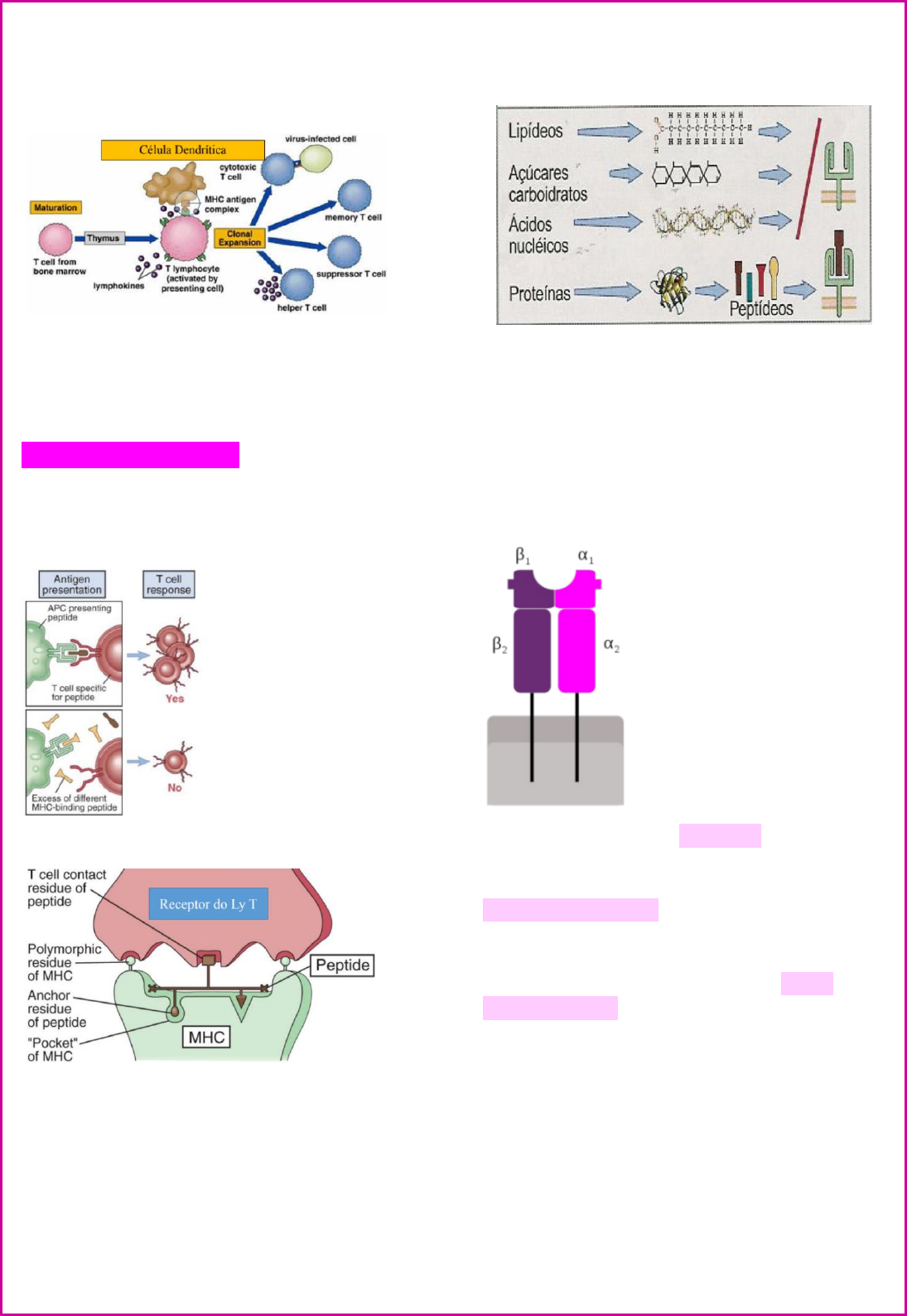 Complexo Principal de Histocompatibilidade (MHC) Importância do MHC • Expressão da proteína de membrana que é processada dentro da célula que vai levar o antígeno para o linfócito T • Essa proteína é “auxiliadora” para trazer o peptídeo que vai se ligar no receptor Restrição do linfócito T: Os receptores de células T só reconhecem estruturas semelhantes ao MHC → proteínas de membrana que exibem peptídeos ligados de forma estável sobre a superfície das células Complexo peptídeo-MC → Algumas estruturas que acomodam o peptídeo → O tamanho varia dependendo do tipo de MHC Resíduos polimórficos: serve para passar a mensagem Região de ancoragem do peptídeo: onde boa parte dos aminoácidos ficam alocados Bolso: leva sinais direcionados a presença de aminoácidos, se o MHC tiver em contato com o linfócito T, sua estrutura é mantida por meio dessa sinalização Moléculas de Classe I/II ligam-se apenas a peptídeos Propriedades gerais do MHC: • Moléculas constituídas por cadeias formando um heterotrímero – o que dá a função • Apresentam região de domínio semelhante a Ig (do anticorpo) - porém a fenda de ligação se liga a somente um antígeno por vez • Apresentam domínio transmembrana e citoplasmático • Citocinas, especialmente interferon-γ (“mestre”) podem aumentar o grau de expressão de MHC • Vírus podem diminuir o grau de expressão de MHC – tempestade de citocinas • Alguns tecidos possuem graus de expressão diferenciados de MHC (células do timo e células endoteliais na túnica intima dos vasos) – tecidos imunoprivilegiados (mais especializados) • Cada molécula de MHC tem apenas um único sítio ligante. Assim, diferentes peptídeos (antígenos) podem se ligar a uma mesma molécula de MHC, mas somente um de cada vez (“ligação degenerada”- pois se liga um antígeno por vez) Estrutura do MHC I • Cadeia α (pesada) associada à cadeia β2 microglobulina (polipeptídeo não polimórifico – não atravessa a membrana) • O sítio de ligação do peptídeo está localizado no topo da superfície da molécula e “encaixa” um peptídeo com 6-16 aminoácidos • “Fenda de ligação do peptídeo” – ligação degenerada Estrutura do MHC II • Cadeia alfa e beta. • Todos os domínios alfa e beta são externos com uma âncora citoplasmática a porção distal da molécula classe II, formada por α1 e β1 forma o sítio de “binding” do peptídeo (até 30 resíduos de aa ou mais) • Ligação mais forte • Correceptores pode ter apenas um lado se acoplando ou bilateralmente – linfócito TCD4 é mais versátil para desenvolver respostas mais efetoras Propriedades dos genes e proteínas do MHC • Todas as células nucleadas do nosso corpo expressam MHC classe I • Já a classe II é expressa pela célula B, células dendríticas e macrófago, além das células epiteliais do timo e as células endoteliais • É possível ter vários MHCs sendo gerados ao mesmo tempo, depende da carga viral e natureza do antígeno • Interferon-γ é o denominador em comum, e quando seu pico aumenta na corrente sanguínea rapidamente, tanto as células nucleadas quanto as APCs sabem que devem processar um grande número de moléculas em um pequeno período de tempo, quando a infecção reduz, o nível de citocinas cai e o processamento de MHC entra em declínio • Interferon-α e β são restritos das APCs RELEMBRANDO GENÉTICA... 1. O DNA está localizado nos cromossomos 2. No cromossomo, cada gene ocupa uma posição específica que é chamada de Lócus. 3. Alelos: São os genes unidos que determinam determinada característica e se encontram no mesmo lócus nos cromossomos homólogos. GENES DO MHC → MHC humano: - HLA; - Codominante; • Cada indivíduo expressa os alelos que são herdados de cada um de seus progenitores. Local de ligação ao correceptor CD8 Local de ligação ao correceptor CD4 Os genes do MHC humanos HLA: Antígeno Leucocitário Humano • Lócus do MHC contém 2 tipos de genes polimórficos (MHC classe I e classe II – proteínas distintas, mas homólogas), e outros genes não polimórficos MAPA DO MHC HUMANO • Genes: HLA-E; HLA-F, HLA-G e MIC → codificam moléculas para NK • Genes: C4, C2 e fator B → codificam moléculas para sistema complemento. • Genes: tapasina, DM, DO, DR, TAP e proteossoma → codificam moléculas para processamento de antígenos • Genes: LTα, LTβ, e TNF → codificam moléculas para citocinas. MHC CLASSE I • Proteínas do MHC são ligadas à membrana celular. • O reconhecimento pelos LT requer o contato célula- célula. • MHC classe I → Expressos em todas as células nucleadas → associam-se peptídeos do citosol → Reconhecimento pelos LT citotóxicos (CD8+). MHC e Resposta Imune • Complexos de antígenos peptídicos e moléculas MHC são formados por degradação antigênica por 2 processos diferentes. • O TCD8 trabalha com peptideos de baixo peso molecular. Como o vírus possui o seu tamanho reduzido, pode entrar livremente no macrofago. Já a bacteria, por ser maior, é internalizada pelas vesicula endocitica (endocitose) • Tanto o microrganismo proteico livre quanto o preso na vesicula endocítica, forma um aglomerado de estruturas que devem sofrer uma imunomarcação (proteinas ubiquitinas - ubiquitinação) • O proteossomo quebra as estruturas marcadas em tamanhos menores • Paralelamente, a cadeia do MHC classe I estava parcialmente pronta. As chaperonas fazem o dobramento e dão o ângulo da cadeia • Os fragmentos de peptideos quebrado pelo proteossomo entram no RE através da proteína TAP • Proteína ERAP captura o peptideo e o acomoda dentro da fenda (auxílio da proteina tapasina) • MHC segue para o complexo de golgi, onde é exocitadoe fundido à membrana MHC CLASSE II • Proteínas do MHC são ligadas à membrana celular. • Reconhecimento requer o contato célula-célula. • MHC classe II → Expressos 
