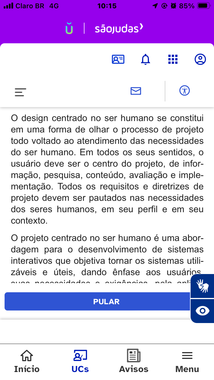 all Claro BR 4G 10:15 U n O design centrado no ser humano se constitui em uma forma de olhar o processo de projeto todo voltado ao atendimento das necessidades do ser humano. Em todos os seus sentidos, o usuário deve ser o centro do projeto, de infor- mação, pesquisa, conteúdo, avaliação e imple- mentação. Todos os requisitos e diretrizes de projeto devem ser pautados nas necessidades dos seres humanos, em seu perfil e em seu contexto. O projeto centrado no ser humano é uma labor- dagem para o desenvolvimento de sistemas interativos que objetiva tornar os sistemas utili- záveis e úteis, dando ênfase aos usuários PULAR Início UCs Avisos Menu