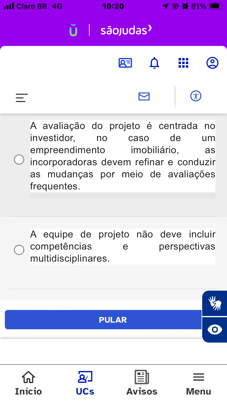 Claro BR 4G 10:20 81% U n A avaliação do projeto é centrada no investidor, no caso de um empreendimento imobiliário, as incorporadoras devem refinar e conduzir as mudanças por meio de avaliações frequentes. A equipe de projeto não deve incluir competências e perspectivas multidisciplinares. PULAR Ln & Início UCs Avisos Menu