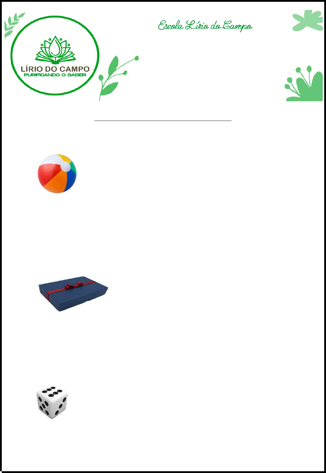 Nome:____________________________________________________________ Data: _____/_____/_____ Revisão de Matemática- Sólidos Geométricos 1. Luna foi à praia e lá comprou uma bola para se divertir com seu ir4mão mais velho. Observe a bola abaixo: A bola de Luna lembra qual sólido geométrico? a) Esfera. b) Cubo. c) Cilindro. d) Paralelepípedo. 2. Marta ganhou um presente de seu pai e ao ver a caixa, ela lembrou de um sólido geométrico. A caixa de presente é semelhante a qual sólido geométrico? a) Cubo. b) Cilindro. c) Esfera. d) Paralelepípedo. 3. Observe a figura abaixo: O dado se assemelha a qual sólido geométrico? a) Cubo. b) Cone. c) Esfera. d) Cilindro. 4. Veja abaixo o sorvete que Luiza comprou para refrescar seu dia: Qual sólido geométrico lembramos ao observar a casquinha do sorvete de Luiza? a) Cilindro. b) Retângulo. c) Cone. d) Pirâmide. 5. Veja o castelo que Miguel e Luana montaram com seus bloquinhos: Quantos cubos foram utilizados para conseguir construir esse castelo? a) 5 cubos. b) 3 cubos. c) 2 cubos. d) 1 cubo. Você é capaz! image4.png image5.png image6.png image1.png image2.png image3.png