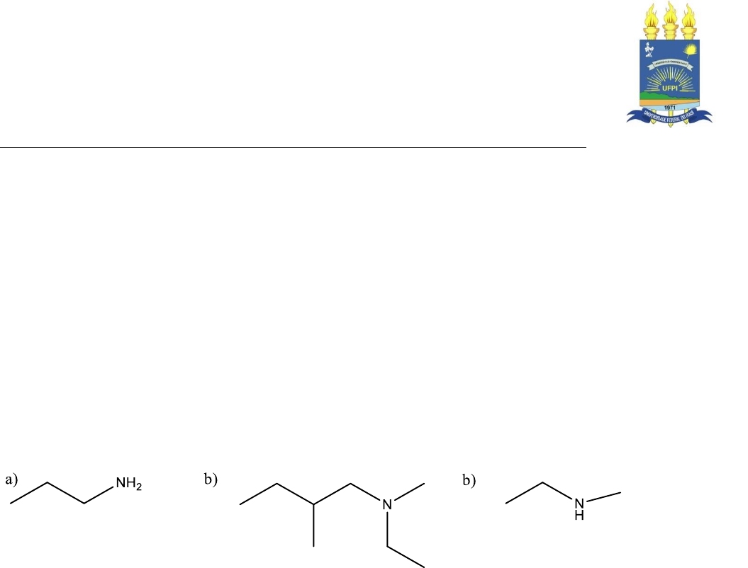 UNIVERSIDADE FEDERAL DO PIAUÍ DEPARTAMENTO DE QUÍMICA Disciplina: Química Orgânica I Ministrante: Prof. Dra. Sâmya D. Lima de Freitas Lista de Exercícios: Aminas 1-Escreva as fórmulas estruturais para cada um dos seguintes compostos: a) Benzilmetilamina b) N-etil-N-metilanilina c) m-toluidina d) 2-metilpirrol e) Indol f) Acetanilida g) Pirrolidina h) 4-metoxianilina i) Ácido p- aminobenzóico j) N-metilanilina k) Cloreto de tetrapropilamônio 2- Qual a classificação geral das aminas? Dê exemplos de cada tipo. 3-Dê os nomes sistemáticos ou não sistemáticos para cada um dos compostos: 4- Coloque os compostos a seguir em ordem crescente de basicidade: a) amônia, anilina, ciclo-hexilamina b) etilamina, 2-aminoetanol e 3-aminopropan-1-ol c) anilina, p-metoxianilina, p-nitroanilina 5- Compare o comportamento das três aminas: anilina, N-metilanilina e N,N-dimetilanilina com iodeto de metila 6- Descreva a sequência de reações necessárias para preparar os compostos abaixo, a partir de benzeno: a) anilina b) 3,5-dibromoanilina 7- Monte uma proposta sintética para a produção de aminas primárias. Mostre o mecanismo e os reagentes. 8- Quais as principais reações das aminas? Monte uma rota sintética com uma amina primária de reagente de partida. Mostre o mecanismo. 9. Como ocorre AS REAÇÕES: A) CH3-CH2-I (Excesso ) + NH3 B) CH3CH2CH2CH2CH2NH2 + iodeto de metila (excesso) /-OH