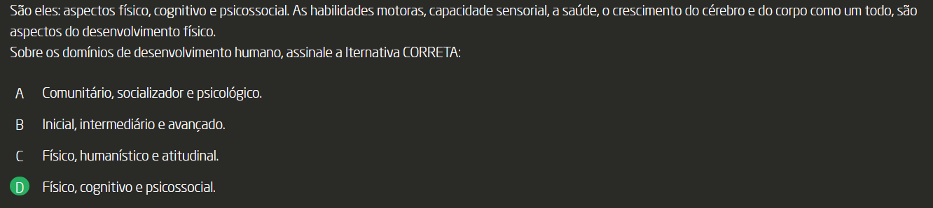 São eles: aspectos físico, cognitivo e psicossocial. As habilidades motoras, capacidade sensorial, a saúde, crescimento do cérebro e do corpo como um todo, são aspectos do desenvolvimento físico. Sobre os domínios de desenvolvimento humano, assinale a Iternativa CORRETA: A Comunitário, socializador e psicológico. B Inicial, intermediário e avançado. Físico, humanístico e atitudinal. D Físico, cognitivo e psicossocial.