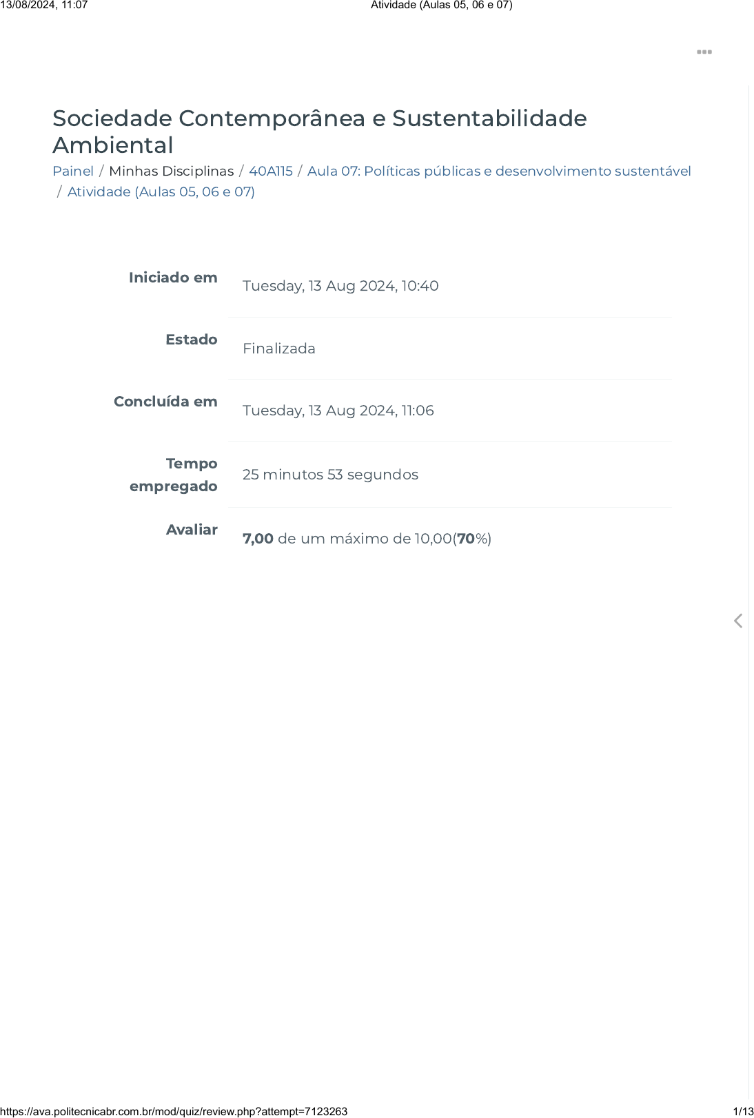 Painel / Minhas Disciplinas / 40A115 / Aula 07: Políticas públicas e desenvolvimento sustentável / Atividade (Aulas 05, 06 e 07) Sociedade Contemporânea e Sustentabilidade Ambiental Iniciado em Tuesday, 13 Aug 2024, 10:40 Estado Finalizada Concluída em Tuesday, 13 Aug 2024, 11:06 Tempo empregado 25 minutos 53 segundos Avaliar 7,00 de um máximo de 10,00(70%) 13/08/2024, 11:07 Atividade (Aulas 05, 06 e 07) https://ava.politecnicabr.com.br/mod/quiz/review.php?attempt=7123263 1/13 https://ava.politecnicabr.com.br/my/ https://ava.politecnicabr.com.br/my/ https://ava.politecnicabr.com.br/course/view.php?id=1057 https://ava.politecnicabr.com.br/course/view.php?id=1057#section-8 https://ava.politecnicabr.com.br/mod/quiz/view.php?id=33423 https://ava.politecnicabr.com.br/ Questão 1 Correto Atingiu 1,00 de 1,00 A respeito da ação do homem de forma negativa na natureza constatou-se que o ser humano podia intervir radicalmente no curso da natureza, a ponto de modi�car ou colocar em risco a existência do planeta. Porém algumas iniciativas foram tomadas entre elas um documento que previa que, se fosse mantido o ritmo de crescimento, os alimentos e a produção industrial iriam declinar até 2010, sendo inevitáveis o esgotamento dos recursos naturais, a poluição industrial e a diminuição da população. Que documento referi-se: Escolha uma opção: a. Relatório Meadows b. Clube de Roma c. Declaração de Cocoyok d. Protocolo de Kioto 13/08/2024, 11:07 Atividade (Aulas 05, 06 e 07) https://ava.politecnicabr.com.br/mod/quiz/review.php?attempt=7123263 2/13 https://ava.politecnicabr.com.br/ Questão 2 Correto Atingiu 1,00 de 1,00 De acordo com que foi estudado no capítulo Marque (V)verdadeiro ou (F) falso. ( ) Os ecossistemas, para Ernst Haeckel, abrangem todos os organismos que funcionam em conjunto em uma determinada área, as interações biológicas que eles estabelecem e todos os processos físico-químicos que sobre eles se re�etem. ( ) segundo Marcel Jollivet e Alain Pavé A noção de meio ambiente está relacionada a um objeto central e este objeto difere segundo as disciplinas cientí�cas. Ou seja, a noção de ambiente ou meio ambiente pressupõe a necessidade de um sujeito ou referencial central que percebe ou interage com o entorno. Ambiente ou meio ambiente, portanto, é aquilo que está em volta, mas necessariamente, de algo ou alguém. ( ) Embora a expressão meio ambiente seja complexa, polissêmica, mutável no tempo e no espaço, envolvendo fenômenos de características cientí�cas e técnicas difíceis de precisar, em geral tem sido usada como tudo aquilo que circunscreve os seres vivos e as coisas e a percepção e a intervenção do homem sobre o meio natural. ( ) A primeira Conferência sobre o Meio Ambiente em Estocolmo, foi lançado pelo canadense Maurice Strong. ( ) Desenvolvimento sustentável é aquele que atende às necessidades do presente sem comprometer a possibilidade as gerações futuras atenderem a suas próprias necessidades”. Escolha uma opção: a. V, F, F, F, V. b. V, V, F, V, V. 13/08/2024, 11:07 Atividade (Aulas 05, 06 e 07) https://ava.politecnicabr.com.br/mod/quiz/review.php?attempt=7123263 3/13 https://ava.politecnicabr.com.br/ Questão 3 Correto Atingiu 1,00 de 1,00 De acordo com cavalcanti o Progresso Econômico na sociedade moderna baseia-se: Escolha uma opção: c. F, V, V, V, V. d. V, V, V, F, V. e. V, V, V, V, V. a. No progresso humano, o meio pelo qual o homem se desprenderia das limitações impostas pela natureza e alcançaria a sua emancipação. b. Na insustentabilidade porque se baseia na acumulação de riqueza, e nas sociedades modernas ele se baseia na acumulação exponencial de riqueza. c. Nenhuma das alternativas. d. No crescimento e na percepção de que esse crescimento é ilimitado. Dessa forma, o desenvolvimento não �ui naturalmente porque as formas de desenvolvimento na natureza não se baseiam no crescimento, mas sim na evolução biológica, a qual comporta mudança e transformação homeostática. 13/08/2024, 11:07 Atividade (Aulas 05, 06 e 07) https://ava.politecnicabr.com.br/mod/quiz/review.php?attempt=7123263 4/13 https://ava.politecnicabr.com.br/ Questão 4 Incorreto Atingiu 0,00 de 1,00 Assine (V) Verdadeiro ou (F) Falso: ( ) Segundo SACHS ecodesenvolvimento é “um estilo de desenvolvimento que, em cada ecorregião, insiste nas soluções especí�cas de seus problemas particulares, levando em conta os dados ecológicos da mesma forma que os culturais, as necessidades imediatas como também aquelas a longo prazo.” ( ) No ano seguinte à primeira Conferência sobre o Meio Ambiente em Estocolmo, promovida pela Organização das Nações Unidas (ONU), o termo ecodesenvolvimento foi lançado pelo Americano Maurice Strong, em reunião realizada em Roma em junho de 1973. Mas o conceito, com princípios reformulados, foi consolidado e disseminado pelo economista francês Ignacy Sachs. ( ) A Declaração de Cocoyok, das Nações Unidas, introduz a análise da pobreza como causa da explosão demográ�ca e principal indutora da rápida deterioração dos recursos naturais. O modelo de consumo dos países industrializados também é apontado como fator de agravamento desse quadro, podendo-se, portanto, falar em limites máximos e mínimos de crescimento. ( ) O relatório internacional de Kyoto, teve a participação de políticos e pesquisadores de 48 países, complementa as recomendações de mudanças nas estruturas de propriedade rural e o repúdio às posturas governamentais dos países industrializados. Escolha uma opção: a. V, V, V, V. b. V, F, V, F. c. F, F, F, V. d. F, V, V, F. 13/08/2024, 11:07 Atividade (Aulas 05, 06 e 07) https://ava.politecnicabr.com.br/mod/quiz/review.php?attempt=7123263 5/13 https://ava.politecnicabr.com.br/ Questão 5 Correto Atingiu 1,00 de 1,00 Segundo Alain Touraine é correto a�rmar: Escolha uma opção: e. V, V, F, F. a. Na globalização existe um reconhecimento 