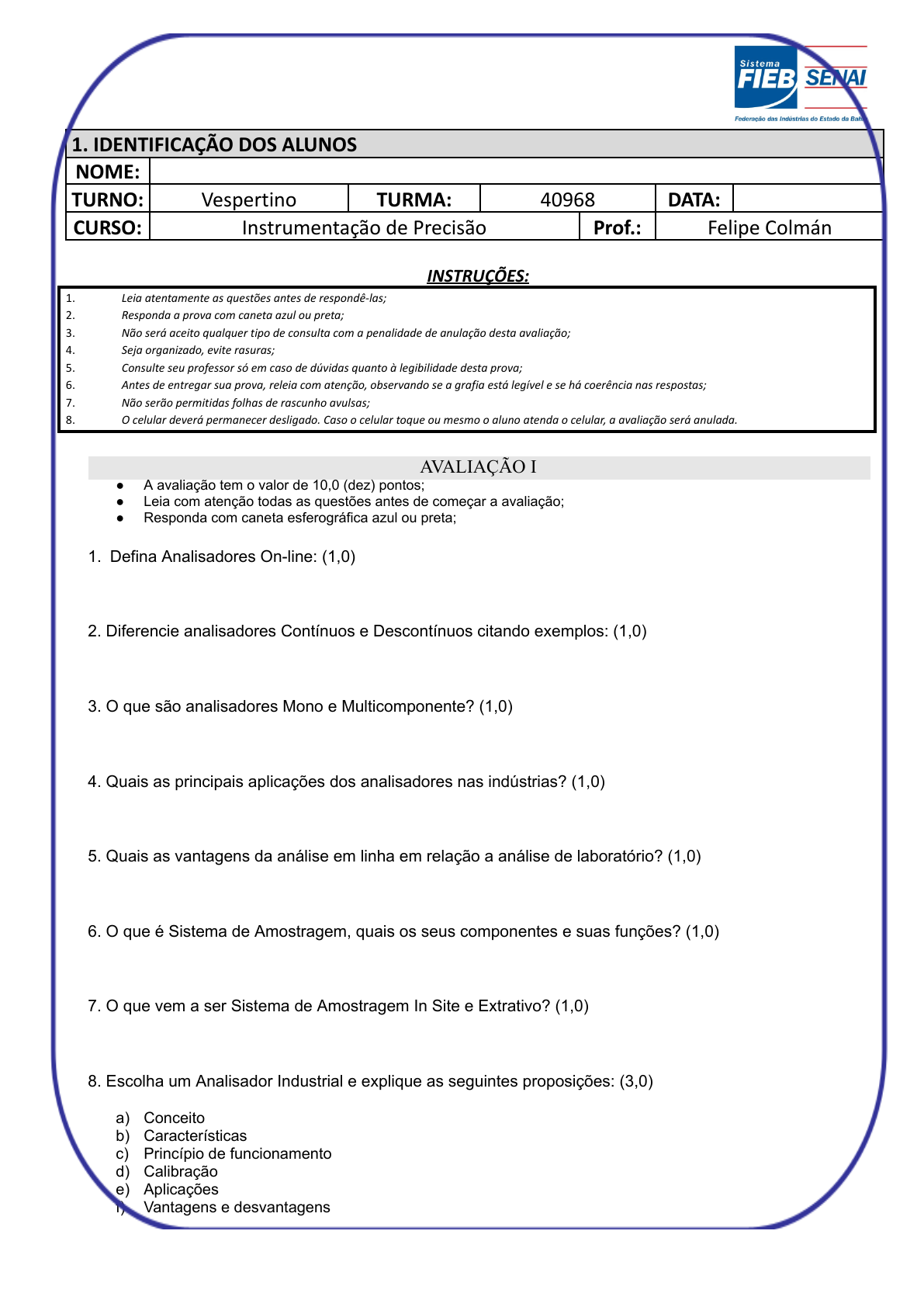 1. IDENTIFICAÇÃO DOS ALUNOS NOME: TURNO: Vespertino TURMA: 40968 DATA: CURSO: Instrumentação de Precisão Prof.: Felipe Colmán INSTRUÇÕES: 1. Leia atentamente as questões antes de respondê-las; 2. Responda a prova com caneta azul ou preta; 3. Não será aceito qualquer tipo de consulta com a penalidade de anulação desta avaliação; 4. Seja organizado, evite rasuras; 5. Consulte seu professor só em caso de dúvidas quanto à legibilidade desta prova; 6. Antes de entregar sua prova, releia com atenção, observando se a grafia está legível e se há coerência nas respostas; 7. Não serão permitidas folhas de rascunho avulsas; 8. O celular deverá permanecer desligado. Caso o celular toque ou mesmo o aluno atenda o celular, a avaliação será anulada. AVALIAÇÃO I ● A avaliação tem o valor de 10,0 (dez) pontos; ● Leia com atenção todas as questões antes de começar a avaliação; ● Responda com caneta esferográfica azul ou preta; 1. Defina Analisadores On-line: (1,0) 2. Diferencie analisadores Contínuos e Descontínuos citando exemplos: (1,0) 3. O que são analisadores Mono e Multicomponente? (1,0) 4. Quais as principais aplicações dos analisadores nas indústrias? (1,0) 5. Quais as vantagens da análise em linha em relação a análise de laboratório? (1,0) 6. O que é Sistema de Amostragem, quais os seus componentes e suas funções? (1,0) 7. O que vem a ser Sistema de Amostragem In Site e Extrativo? (1,0) 8. Escolha um Analisador Industrial e explique as seguintes proposições: (3,0) a) Conceito b) Características c) Princípio de funcionamento d) Calibração e) Aplicações f) Vantagens e desvantagens Página 1 de 1
