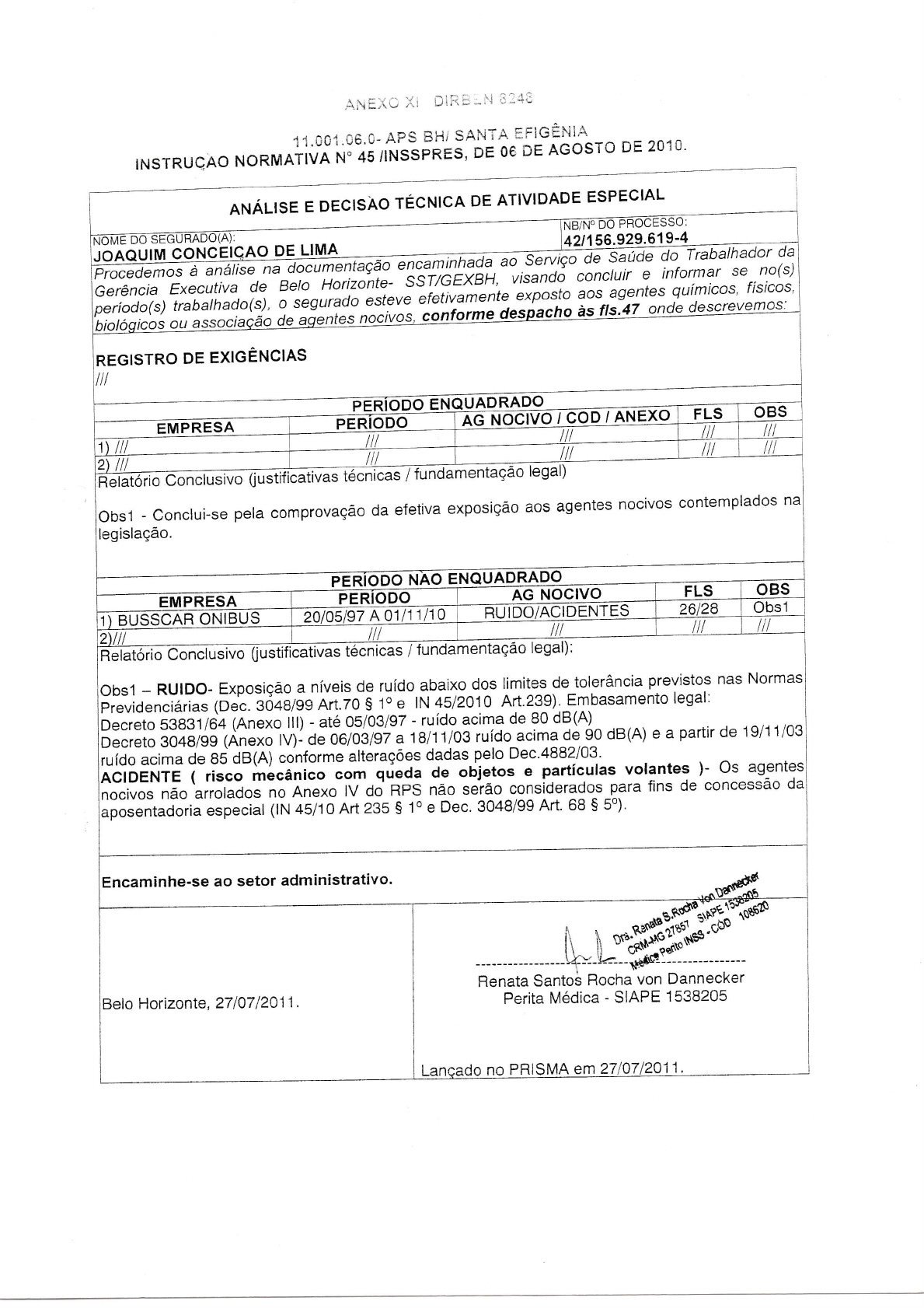 .,:\xÉ;{; xi Diíiil;li i?a! 11.s01.06.0- APS Bl-t/ sANr EFçrryr TNSTRUÇAo NoRMAriv; N;Js nxsspnàã; ó= 0ê DE AcosrCI DE 2018 ANALISE E DECISÀO TÉCNICA DE ATIVIDADE ESPECIAL 1 56. 929.619-4 DE LIMAIM CONCE no(s) T/GEXBH físicos, (s,) dada naanálisea seProcedemos informarSSHorizonte-elodeExecutiva uímicos,Gerência qaos agentesexpostoefetivamenteesÍeveo seguradotrabalhado ondes) .47às flsperíodo(' de DOEPE / ANEXO EMPRESA I o 1 UAD RADO OBSFLSNO REGISTRO DE EKGÊNCIAS obsl - conclui-se pela comprovação da efetiva exposiçáo aos agentes nocivos contemplados na Conclusivo legislaçáo. FLS EN 1 PE DO 7401 11il0 Écnicas / PE OBS Obsl AG NOCIVO ID EMPRESA ONIB obsl * RUIDO- Exposiçáo a níveis de ruído abaixo dos limites de tolerância previstos nas Normas previdenciárias (Dec. ãd+àleg Art.70 § 1o e lN 45/2010 Art.239). Embasamento legal: Decráto 53831/G; (Anexo lll) - até Osl1glgT - ruído acima de 80 dB(A) Decreto g048199 (Anexo lV)- de 06103197 a 18111i03 ruído acima Oà gO an(n) e a partir de 1 9/1 1/03 ruiJo a"im. de 85 dB(A) conforme alteraçóes dadas pelo Dec.4882103' ACIDENTE ( risco mecânico com queda de objetos e partículas volantes )- os agentes nocivos náo arrolados no Anexo lV do RpS náo seráo considerados para Íins de concessáo da áóãiántrooria especiat (tN 4sl10 Art 235 § 1o e Dec. 3048i99 Art. 68 § 50)' clusivo ( cas / Íundaméntaçáo legal) Encaminhe-sê ao setor administrativo' Horizonte, 2710712A11 Lan s§à' Rocha von DanneckerRenata PRiSMA em nl l27 Perita Médica - SIAPE 1538205 ao ecancluirvisando iltlll Z 26128DOiARU t\lll