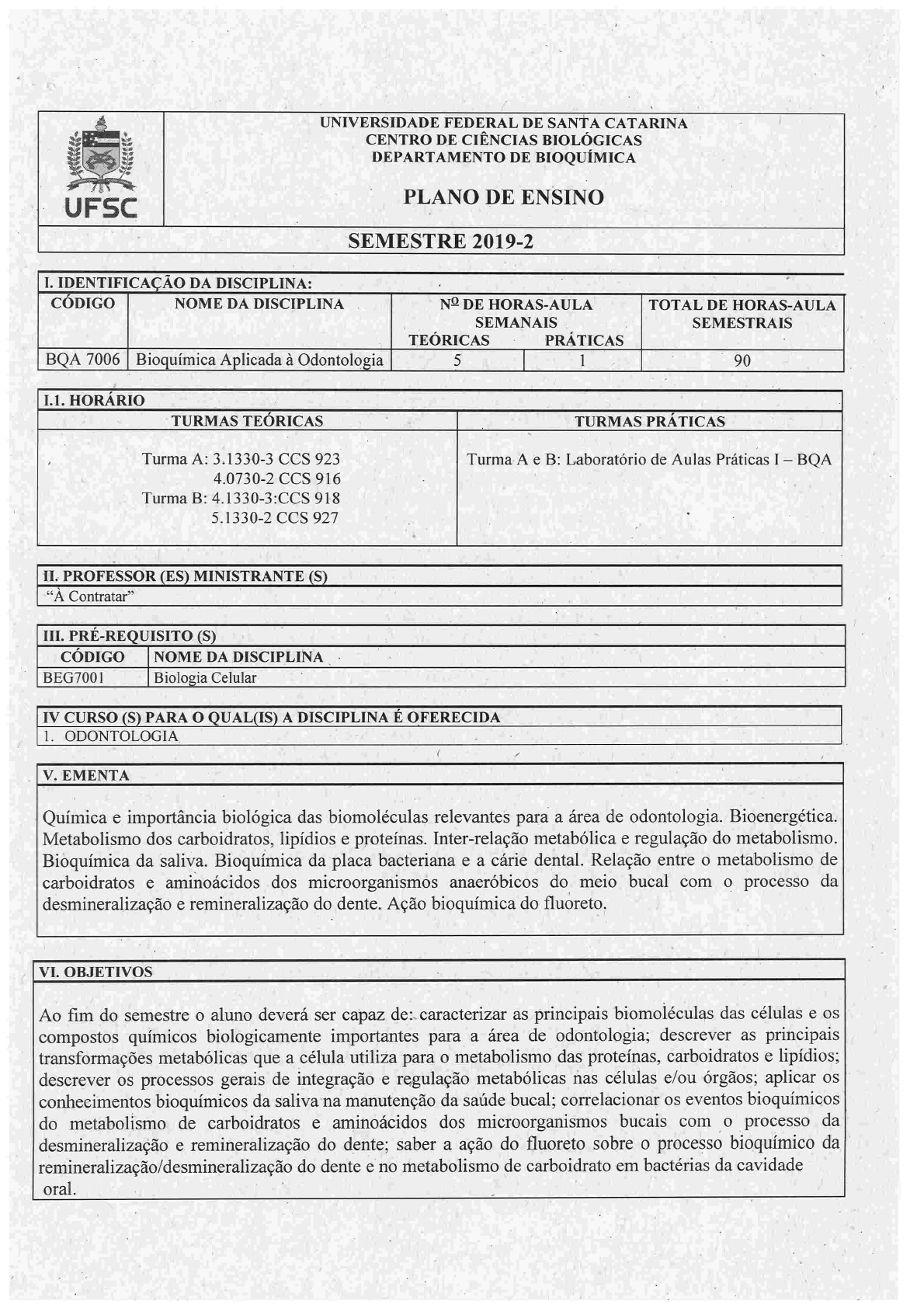 8 UFSC UNIVERSIDADE FEDERAL DE SA 'A CATARINA CENTRO DE CIÊNCIAS BIOLÓGICAS DEPARTAMENTO DE BIOQUÍMICA PLANO DE ENSINO SEMESTRE 2019-2 1. IDENTIFICAÇÃO DA DISCIPLINA CODIGO NOME DA DISCIPLINA NQ DE HORAS-AULA TOTAL DE HORAS-AULA SEMANAIS SEMESTRAIS PRATICASTEÓRICAS )BQA 7006 l Bioquímica Aplicada à Odgntologia 1.1. HORÁRIO TURMAS TEÓRICAS Turma A: 3. 1330-3 CCS 923 4.0730-2 CCS 916 Turma B: 4.1330-3:CCS 91: 8 5.1330-2 CCS 927 Turma.A e B: Laboratório de Aulas Práticas l BnA 11.. PROFESSOR MINISTRANTE (S Contratar" 111. PKÉ-KKQuiSiTO NOME DA DISCIPLINACODIGO Biologia CelularBEG700 PARA O QUAL(IS) A DISCIPLINA OFERECIDAIV CURSO ODONTOLOGIA/' V. EMENTA Química e importância biológica das biomoléculas relevantes para a área de odontologia. Bioenergética. Metabolismo dos carboidratos, lipídios e proteínas. Inter-relação metabólica e regulação do metabolismo Bioquímica da saliva. Bioquímica da placa bacteriana e a cárie dental. Relação entre o metabolismo de carboidratos e aminoácidos dos microorganismos anaeróbicos do meio bucal com o processo da desmineralização e remineralização do dente. Ação bioquímica do fluoreto VI. OBJETIVOS Ao Him do semestre o aluno deverá ser cal)az de:-caracterizar as principais biomoléculas das células e os compostos químicos biologicamente importantes para a área de odontologia; descrever as principais transformações metabólicas que a célula utiliza para o metabolismo das proteínas, carboidratos e lipídios; descrever os processos gerais de integração e regulação metabólicas has células e/ou órgãos; aplicar os conhecimentos bioquímicos da salivana manutenção da saúde bucal; correlacionam os eventos bioquímicos do metabolismo de carboidratos e aminoácidos dos microorganismos bucais com .o .processo da desmineralização e remineralização do dente; saber a ação do fluoreto sobre o processo bioquímico da remineralização/desmineralização do dente e no metabolismo de carboidrato em bactérias da cavidade oral VII. CONTEUDO PROGRAMÁTICO Objetivos Por IJnidade Conteúdos Unidade 1 - Química e importância biológica das biomoléculas OI. Principais biomoléculas e suas unidades fundamentais. Noções das principais funções químicas. Principais forças de atração. 02. Química de aminoácidos: conceito, importância biológica, estrutura, classificação conforme estrutura da cadeia lateral. Sistema tampão. 03.Química de proteínas: conceito, classiülcação quanto a conformação e composição, função biológica, níveis estruturais (conformação); desnaturação e principais fatores desnaturantes. 04. Enzimas: conceito, componentes de uma reação enzimática, coenzimas; favores que afetam a velocidade das reações enzimáticas. Inibição enzimática. Noções de enzimas alostéricas. 05. Vitaminas hidrossolúveis e coenzimas: estrutura e funções. Vitaminas lipossolúveis estrutura e papel fisiológico. 06. Química de carboidratos: conceito, classificação e importância biológica. Monossacarídeos: conceito, classificação, estruturas: Dissacarídeos: estruturas, ligação O-glícosídica. Polissacarídeos: classificação, fiinção e estrutura. Estrutura da parede bacteriana e ação da penicilina. 07. Química de lipídeos: conceito, estrutura, classificação e importância biológica. Ácidos graxos (ácidos graxos essenciais). Lipídeos simples (triacilgliceróis, terpenóides e asteróides). Lipídeos complexos(fosfoglicerídeos. Unidade ll - Bioenergétíca e Metabolismo dos carboidratos, lipídios -e proteínas. 08. Noções de energia livre de reações enzimáticas, conceito de potencial redox. Oxida redução biológica. 09. Metabolismo de carboidratos: digestão enzimática e absorção de carboidratos da dieta (amido, lactose, sacarose, celulose). 10. Glicólise (conceito, importância, reações, destino do piruvato em aerobiose e anaerobiose, balanço energético da glicólise), regulação; 11. Gliconeogênese (conceito, importância, reações a partir dó lactato, glícerol e aminoácidos), regulação; 12. Ciclo de Krebs (conceito, importância, reações anapleróticas). Balanço energético da oxidação completa da glicose ("lançadeiras/transportadores de equivalentes de redução citossólica para mitocondrial), regulação. 13. Cadeia respiratória e fosforilação oxidativa. Inibidores e desacopladores. Antibióticos com ação desacopladora. 14. Metabolismo de lipídeos: digestão e absorção de triacilglicerol: )anel de sais biliares Oxidação de ácidos graxos. Balanço energético da oxidação de ácidos graxos BiosÍntese de ácidos graxos. Regulação das vias. 1 5. Cetogênese e cetólise; 1 6. Metabolismo de proteínas: digestão química e enzimática de proteínas e absorção de aminoácidos. Reações gerais do metabolismo de aminoácidos .(transaminação, descarboxilação e desaminação).. Metabolismo da amónia. Ciclo da ureia Unidade lll - Inter. relação metabólica 1 7. enter-relação metabólica: enter-conversão entre aminoácidos, carboidratos e lipídeos. Regulação geral do metabolismo. Unidade IV -- bioquímica da saliva, bioquímica . da cavidade oral. da desmineralizção, remineralização e da cárie dentária. Ação do fluoreto. Relação bioquímica entre açucares e cárie. 1 8. Bioquímica da saliva: principais constituintes bioquímicos e seus papéis na manutenção da saúde oral. Ação tamponante salivar. 19. Bioquímica do meio bucal: .digestão dos principais carboidratos na cavidade oral: amido, glicogênio, lactose, sacarose. Sistema de transporte de açúcares em bactérias cariogênicas. Fermentação lítica; fermentação alcoólica; femtentação pútrida. Aspetos gerais de enzimas bacterianas da cavidade oral. Produtos da putrefação na periodontose. 20. Aspectos bioquímicos das formações da superfície do esmalte dental: película adquirida e placa dental. Bioquímica de pólissacarídeos