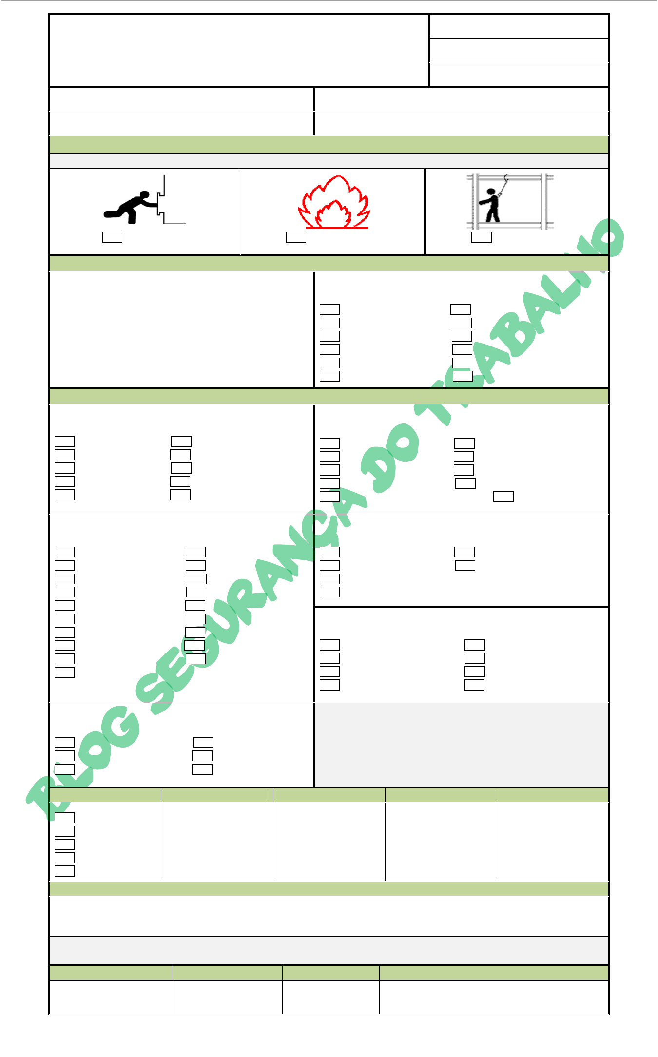 Blog Segurança do Trabalho WWW.BLOGSEGURANCADOTRABALHO.COM.BR BLOG SEGURANÇA DO TRABALHO WWW.BLOGSEGURANCADOTRABALHO.COM.BR AUTORIZAÇÃO PARA TRABALHO DE RISCO (ATR) Nº: Páginas: ____ de _____. Data: ____/ _____/ ______. Responsável pela Obra: Número do Contrato: Trabalho a ser Realizado e Local: Nome Executor do Serviço e Empresa: SOLICITAÇÃO SERVIÇO A SER EXECUTADO: LOCAL CONFINADO TRABALHO A QUENTE SERVIÇO EM ALTURA ESTÁ ATR SÓ PODERÁ SER LIBERADA PELO SETOR DE SEGURANÇA DO TRABALHO OU RESPONSÁVEL VALIDADE DA ATR: De: ____/____/____ a ____/____/____ - ____________________________ De: ____/____/____ a ____/____/____ - ____________________________ De: ____/____/____ a ____/____/____ - ____________________________ De: ____/____/____ a ____/____/____ - ____________________________ RISCOS: CHOQUE ELÉTRICO TÓXICO INFLAMÁVEL CORROSIVO ÁCIDO TEMPERATURA EXPLOSÃO ASFIXIA INCÊNDIO VAZAMENTO QUEDA ALTURA _______________. PROVIDÊNCIAS PREPARAÇÕES: INSPEC. VAZAMENTO REMOVER DEPÓSITOS NEUTRALIZAR VENTILAR ANGORAR GAIOLA VARRER PISO LAVAR MAQ. E/OU EQUIP. VAPORIZAR DRENAR DESPRESSURIZAR SEGURANÇA CONTRA FOGO: MANGUEIRA DE ÁGUA EXTINTOR ÁGUA MANTER ÁREA ÚMIDA EXTINTOR CO2 COBRIR EQUIPAMENTO EXTINTOR PQS SPRINKLER SENTINELA DE EMERGÊNCIA PROTEGER PAREDES OU EQUIPAMENTOS OUTROS______________. SEGURANÇA PESSOAL: ÓCULOS DE SEG. CAPACETE DE SEGURANÇA PROTETOR AURICULAR LUVA DE COURO AVENTAL ESCADA CALÇADO DE SEG. TRAVA QUEDA BLUSÃO C/ CAPUZ CABO GUIA CINTO DE SEG. MÁSCARA P/ SOLDA BLUSÃO C/ CAPUZ CABO GUIA CAPACETE DE SEGURANÇA MÁSCARA ______________. PERNEIRA DE COURO LAVA OLHOS OUTROS ________________. FERRAMENTAS E EQUIPAMENTOS (VERIFICAR ESTADO): VÁLVULA CORTA CHAMA MANGUEIRA SEM EMENDAS ESTADO CORDAS CABOS FERRAMENTAS, ETC COMPONENTES ELÉTRICOS, PINOS, TOMADAS, ISOLAMENTO ETC. OUTROS ___________________. ISOLAMENTO DO EQUIPAMENTO: CADEADO DE SEGURANÇA BLOQUEAR A LINHA SINALIZAR A ÁREA SINALIZAR O EQUIPAMENTO COLOCAR BARREIRAS CERCAR COM CORDA SINALIZAR ÁREA OUTROS ___________________. SEGURANÇA ELÉTRICA: DESLIGAR CHAVES ELÉTRICAS ATERRAR DETECTOR DE TENSÃO TAPETE DE BORRACHA CADEADO DE SEGURANÇA OUTROS ______________. ESTA ATR SOMENTE PODERÁ SER LIBERADA PELO SETOR DE SEGURANÇA DO TRABALHO OU RESPONSÁVEL TESTES A REALIZAR LIMITE TESTE HORA VISTO TEOR OXIGÊNIO TOXIDADE EXPLOSIVIDADE LIGAÇÃO TERRA OUTROS _____________. % % OBSERVAÇÕES SÓ LIBERAR TRABALHO APÓS O ATENDIMENTO DAS PROVIDÊNCIAS INDICADAS. O LOCAL DE TRABALHO FOI INSPECIONADO HAVENDO CONCORDÂNCIA QUANTO AS CONDIÇÕES ACIMA. REQUISITANTE EXECUTANTE DATA RESPONSÁVEL _____/ _____/ _________