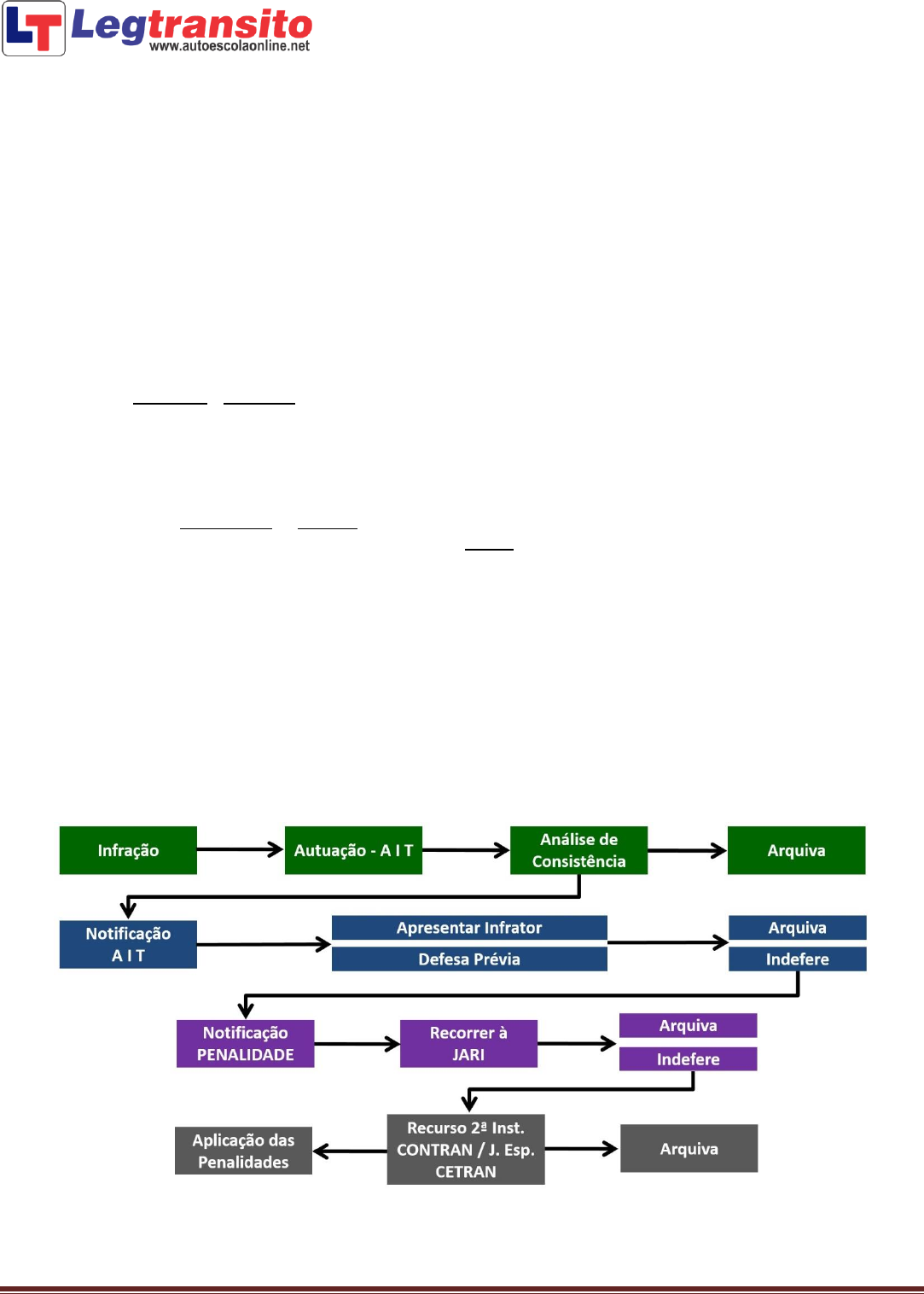 Prof. Ronaldo Cardoso | e-mail: ronaldo@autoescolaonline.net | Canal: www.YouTube.com/LegTransito 1 INFRAÇÕES e PENALIDADES 1. INFRAÇÃO DE TRÂNSITO - inobservância (desobediência) a qualquer preceito da Legislação de Trânsito, do Código de Trânsito Brasileiro (CTB), das Resoluções do CONTRAN e Regulamentações dos Órgãos Executivos de Trânsito. 2. PENALIDADES – são sanções aplicáveis aos condutores que cometem infrações de trânsito. 3. AUTO DE INFRAÇÃO DE TRÂNSITO (AIT) – documento onde o Agente Fiscalizador de trânsito lavra a infração cometida. O AIT será preenchido com os seguintes dados: ►Tipo da infração cometida; ►Local, data e hora do cometimento da infração; ►Identificação do veículo (placa, marca, espécie e outros possíveis); ►Identificação do Agente Fiscalizador; ►Número do prontuário e assinatura do condutor infrator – Estes dois não são obrigatórios. 4. AGENTE FISCALIZADOR DE TRÂNSITO – Servidor civil ou Policial Militar designado para fiscalizar o trânsito. Pessoa investida de autoridade para lavrar AIT e aplicar as Medidas Administrativas cabíveis. 5. ARQUIVAMENTO DO AIT – o Auto de Infração de Trânsito poderá ser arquivado e seu registro julgado insubsistente quando: a. For considerado inconsistente ou irregular, ou; b. Não for expedida a notificação do AIT dentro do prazo de 30 dias. 6. PROCESSO ADMINISTRATIVO – Rito administrativo com a finalidade de apurar o cometimento de infrações de trânsito e, se cabível, aplicar as devidas penalidades. Seguem abaixo os atos de um processo administrativo: 6.1 O condutor é flagrado, pelo Agente Fiscalizador, cometendo uma Infração de Trânsito; 6.2 O Agente Fiscalizador preenche o AIT e o encaminha para a Autoridade de Trânsito; 6.3 A Autoridade analisa se o AIT é consistente e, caso sim, notifica, em no máximo 30 dias, o infrator para que ele possa se defender no processo. Caso a autuação não seja consistente, ela é arquivada e seu registro julgado insubsistente; 6.4 O Infrator tem 30 dias para se defender por meio de recurso à JARI. Caso seu recurso seja aceito, o processo é encerrado sem a aplicação de qualquer penalidade. Caso não, o condutor será notificado da aplicação das penalidades cabíveis; 6.5 O processo é finalizado com o pagamento da multa e o cumprimento das penalidades aplicadas. Caso o infrator queira, é possível, mesmo após o pagamento da multa, que se recorra, em segunda instância, ao CETRAN. Onde, se deferido seu recurso, o dinheiro será devolvido e o processo encerrado definitivamente. Prof. Ronaldo Cardoso | e-mail: ronaldo@autoescolaonline.net | Canal: www.YouTube.com/LegTransito 2 7. PUNIÇÕES – as punições são classificadas em Penalidades e Medidas Administrativas, conforme tabela a seguir: 8. TIPOS DE PENALIDADES – punições aplicadas, pela Autoridade de Trânsito, ao condutor infrator. Obs.: NÃO começam com as letras: “R” ou “T”. Conforme apresentadas a seguir: 8.1 Advertência por Escrito: punição aplicada com a finalidade de efeito educativo onde não será computada nenhuma pontuação no prontuário do condutor nem acarretará qualquer custo com pagamento de penalidades. Será possível a conversão da Multa em Advertência por Escrito quando: a. A infração cometida for de natureza Leve ou Média, e; b. O condutor não for reincidente em infrações nos últimos doze meses. 8.2 Multa: punição a ser paga em dinheiro cujo valor é estipulado conforme a natureza da infração. Será, também, registrada uma pontuação no prontuário do condutor de acordo com a tabela abaixo. a. Fator agravante – multiplica o valor da multa gravíssima em 2x, 3x, 5x, 10x, 20x ou 60x. Prof. Ronaldo Cardoso | e-mail: ronaldo@autoescolaonline.net | Canal: www.YouTube.com/LegTransito 3 b. Desconto - as multas pagas até a data do vencimento terão um desconto de 20%. Se o infrator optar pelo recebimento de notificação eletrônica e abrir mão do recurso, poderá pagar com 40% de desconto. c. FUNSET – 5% dos valores arrecadados com multas de trânsito é repassado ao Fundo Nacional de Segurança e Educação de Trânsito (FUNSET). 8.3 Suspensão do Direito de Dirigir: Penalidade aplicada com a finalidade de tirar do condutor infrator, por tempo determinado, o seu direito de dirigir. a. Condutor acumular vinte (20) ou mais pontos em seu prontuário no período de um ano. Suspensão de 6 a 12 meses / ou de 8 a 24 meses, em caso de reincidência. b. O condutor cometer qualquer das infrações abaixo relacionadas. Suspensão de 2 a 8 meses / ou de 8 a 18 meses, em caso de reincidência. Obs. As infrações dos art. 165, 165A e 253A têm prazo de suspensão preestabelecido em 12 meses. 8.4 Cassação da Permissão Para Dirigir (PPD): punição que acarreta, ao condutor permissionário, a perda definitiva da sua PPD com a respectiva baixa de seu registro no sistema RENACH. Poderá ocorrer quando: a. O condutor cometer qualquer infração de natureza grave ou gravíssima; b. O condutor for reincidente em infrações de natureza média. Obs. A reabilitação poderá ocorrer a qualquer tempo, tendo o candidato que passar por todos os exames novamente. 8.5 Cassação da Carteira Nacional de Habilitação (CNH): punição que acarreta, ao condutor, a perda definitiva da sua CNH com a respectiva baixa de seu registro no sistema RENACH. Poderá ocorrer quando: a. Suspenso do direito de dirigir o condutor for encontrado dirigindo; Prof. Ronaldo Cardoso | e-mail: ronaldo@autoescolaonline.net | Canal: www.YouTube.com/LegTransito 4 b. Condenado judicialmente por um delito (crime) praticado na direção de veículo; c. For reincidente nas seguintes infrações: Dirigir com habilitação de categoria diferente à exigida para condução do veículo; Entregar a direção à pessoa inabilitada ou incapacitada; Dirigir sob a influência de álcool ou entorpecentes; Disputar corrida por espírito de emulação; Pr