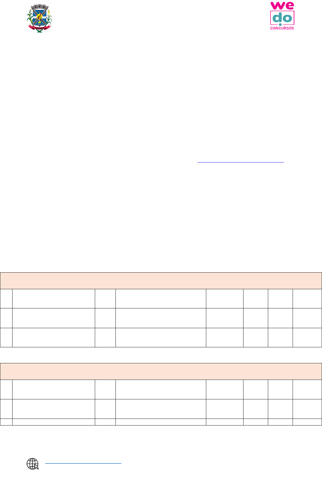 Página | 1 ESTADO DE SANTA CATARINA MUNICÍPIO DE TUBARÃO PROCESSO SELETIVO PÚBLICO N.º 02/2024 PROCESSO SELETIVO PÚBLICO Nº 02/2024 www.wedoconcursos.com.br EDITAL 02/2024 O Município de Tubarão, Estado de Santa Catarina, neste ato representado pelo Prefeito Municipal, no uso de suas atribuições legais, em cumprimento ao que determina a Constituição Federal de 1988, Art. 37, II, combinado com a Lei Orgânica Municipal, Portaria nº 2.436/2017, Leis Municipais nº 2.952/2005, 16/2007 e suas alterações posteriores, bem como demais disposições legais aplicáveis à espécie, torna público que estarão abertas as inscrições para o PROCESSO SELETIVO PÚBLICO para o ingresso no quadro temporário para o Executivo Municipal, de acordo com as seguintes disposições deste Edital. 1. DAS DISPOSIÇÕES PRELIMINARES: 1.1. O Processo Seletivo Público será realizado sob a responsabilidade da empresa WE DO CONCURSOS, com sede administrativa localizada na Rua Rio de Janeiro, 243 - sala 802, Centro, Belo Horizonte, Minas Gerais, endereço eletrônico: www.wedoconcursos.com.br e e-mail: contato@wedoconcursos.com.br, sob a supervisão da Comissão de Concurso, de Processo Seletivo e Plano de Carreira nomeada pela Portaria Nº 1933 de 22 de janeiro de 2024 e pela Portaria Nº 2316 de 19 de abril de 2024, bem como sob a supervisão do Fiscal do Contrato nomeado pela Portaria Nº 2.399 de 24 de maio de 2024. 1.2. O Processo Seletivo Público terá caráter eliminatório e classificatório com prova escrita objetiva, prática e de títulos, conforme cada cargo. 1.3. O Processo Seletivo Público se destina ao preenchimento de vagas temporárias e a formação de cadastro de reserva para o Executivo Municipal. 1.3.1. No que tange ao Cadastro de Reserva, este constitui somente e tão somente, uma expectativa de direito do candidato selecionado, no período de validade da seleção. 1.4. O cargo, número de vagas, nível de escolaridade (requisitos mínimos para assumir o cargo), vencimentos, carga horária, tipo de prova e valor da taxa de inscrição seguem dispostos no quadro a seguir: VAGAS DE NÍVEL FUNDAMENTAL Nº Cargo Nº de vagas Requisitos para assumir o cargo Escolaridade Vencimentos Carga horária semanal Tipo de prova Taxa de Inscrição 01 Auxiliar de Enfermagem CR¹ Ensino fundamental completo, curso de Auxiliar de Enfermagem e registro no respectivo conselho de classe R$ 2.451,71² 40 Objetiva Títulos R$ 30,00 02 Motorista CR¹ Ensino fundamental completo, habilitação para condução de veículos nas categorias C e/ou D (ônibus) R$ 1.715,76² 40 Objetiva Prática R$ 30,00 VAGAS DE NÍVEL MÉDIO E TÉCNICO Nº Cargo Nº de vagas Requisitos para assumir o cargo Escolaridade Vencimentos Carga horária semanal Tipo de prova Taxa de Inscrição 03 Artesão CR¹ Ensino médio completo e certificados de curso na área e/ou documento comprobatório na área R$ 1.715,76² 30 Objetiva R$ 45,00 04 Atendente de Consultório Dentário CR¹ Ensino médio completo, curso R$ 2.205,93² 40 Objetiva R$ 45,00 mailto:contato@wedoconcursos.com.br Página | 2 ESTADO DE SANTA CATARINA MUNICÍPIO DE TUBARÃO PROCESSO SELETIVO PÚBLICO N.º 02/2024 PROCESSO SELETIVO PÚBLICO Nº 02/2024 www.wedoconcursos.com.br específico regulamentado pelo Conselho Federal de Odontologia e registro no respectivo Conselho de classe Títulos 05 Técnico em Enfermagem CR¹ Técnico em Enfermagem e registro no Conselho de classe R$ 2.573,52² 30 Objetiva Títulos R$ 45,00 06 Técnico Fiscal Sanitarista CR¹ Ensino médio completo R$ 1.803,02² 30 Objetiva R$ 45,00 VAGAS DE NÍVEL SUPERIOR Nº Cargo Nº de vagas Requisitos para assumir o cargo Escolaridade Vencimentos Carga horária semanal Tipo de prova Taxa de Inscrição 07 Assistente Social CR¹ Ensino superior em Serviço Social e registro no respectivo Conselho de classe R$ 3.677,57² 30 Objetiva Títulos R$ 60,00 08 Educador Físico CR¹ Ensino superior em Educação Física e registro no respectivo Conselho de classe R$ 3.677,57² 30 Objetiva Títulos R$ 60,00 09 Enfermeiro CR¹ Ensino superior em Enfermagem e registro no respectivo Conselho de classe R$ 3.677,57² 30 Objetiva Títulos R$ 60,00 10 Enfermeiro ESF CR¹ Ensino superior em Enfermagem e registro no respectivo Conselho de classe R$ 4.903,42² 40 Objetiva Títulos R$ 60,00 11 Farmacêutico CR¹ Ensino superior em Farmácia e registro no respectivo Conselho de classe R$ 3.677,57² 30 Objetiva Títulos R$ 60,00 12 Fiscal Sanitarista CR¹ Ensino superior em qualquer área e registro no respectivo Conselho de classe R$ 3.677,57² 30 Objetiva Títulos R$ 60,00 13 Fisioterapeuta CR¹ Ensino superior em Fisioterapia e registro no respectivo Conselho de classe R$ 3.677,57² 30 Objetiva Títulos R$ 60,00 14 Fonoaudiólogo CR¹ Ensino superior em Fonoaudiologia e registro no respectivo Conselho de classe R$ 3.677,57² 30 Objetiva Títulos R$ 60,00 15 Médico CR¹ Ensino superior em Medicina e registro no respectivo Conselho de classe R$ 16.409,53² 40 Objetiva Títulos R$ 60,00 16 Médico ESF CR¹ Ensino superior em Medicina e registro no respectivo Conselho de classe R$ 16.409,53² 40 Objetiva Títulos R$ 60,00 17 Médico Veterinário CR¹ Ensino superior em Medicina Veterinária e registro no respectivo Conselho de classe R$ 3.677,57² 30 Objetiva Títulos R$ 60,00 18 Neuropsicólogo CR¹ Ensino superior em Psicologia com especialização em Neuropsicologia e registro no respectivo Conselho de classe R$ 3.677,57² 30 Objetiva Títulos R$ 60,00 19 Nutricionista CR¹ Ensino superior em Nutrição e registro no respectivo Conselho de classe R$ 3.677,57² 30 Objetiva Títulos R$ 60,00 20 Odontólogo ESF CR¹ Ensino superior em Odontologia e registro no respectivo Conselho de classe R$ 6.471,38² 40 Objetiva Títulos R$ 60,00 21 Psicólogo CR¹ Ensino superior em Psicologia e registro no respectivo Conselho de classe R$ 3.677,57² 30 Objetiva Títulos R$ 60,00 22 Psicopedagogo CR¹ Ensino superior em Pedagogia 