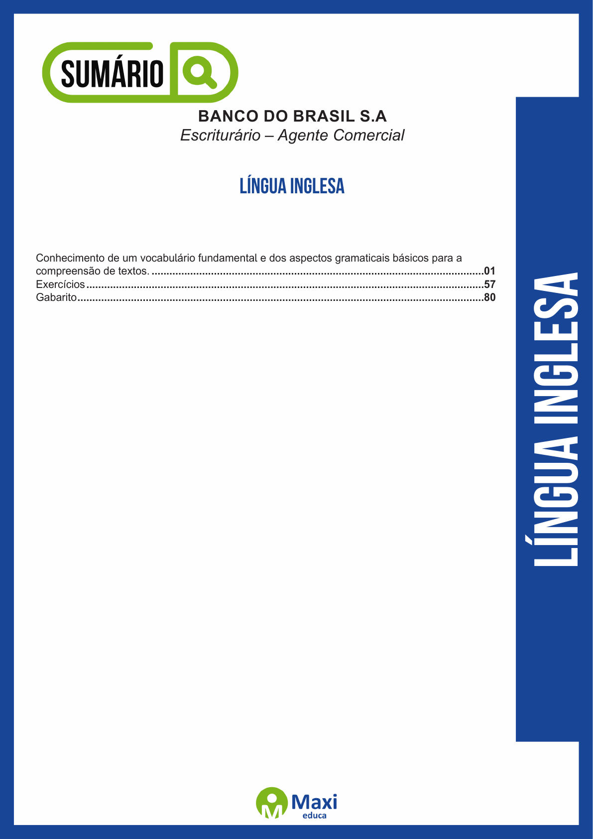 Lín gu a In gl es a BANCO DO BRASIL S.A Escriturário – Agente Comercial Língua Inglesa Conhecimento de um vocabulário fundamental e dos aspectos gramaticais básicos para a compreensão de textos. ................................................................................................................01 Exercícios ......................................................................................................................................57 Gabarito .........................................................................................................................................80 1 Conhecimento de um vocabulário fundamental e dos aspectos gramaticais básicos para a compreensão de textos Reading Comprehension Interpretar textos pode ser algo trabalhoso, dependendo do assunto, ou da forma como é abordado. Tem as questões sobre o texto. Mas, quando o texto é em outra língua? Tudo pode ser mais assustador. Se o leitor manter a calma, e se embasar nas estratégias do Inglês Instrumental e ter certeza que ninguém é cem por cento leigo em nada, tudo pode ficar mais claro. Vejamos o que é e quais são suas estratégias de leitura: Inglês Instrumental Também conhecido como Inglês para Fins Específicos - ESP, o Inglês Instrumental fundamenta-se no trei- namento instrumental dessa língua. Tem como objetivo essencial proporcionar ao aluno, em curto prazo, a capacidade de ler e compreender aquilo que for de extrema importância e fundamental para que este possa desempenhar a atividade de leitura em uma área específica. Estratégias de leitura • Skimming: trata-se de uma estratégia onde o leitor vai buscar a ideia geral do texto através de uma leitura rápida, sem apegar-se a ideias mínimas ou específicas, para dizer sobre o que o texto trata. • Scanning: através do scanning, o leitor busca ideias específicas no texto. Isso ocorre pela leitura do texto à procura de um detalhe específico. Praticamos o scanning diariamente para encontrarmos um número na lista telefônica, selecionar um e-mail para ler, etc. • Cognatos: são palavras idênticas ou parecidas entre duas línguas e que possuem o mesmo significado, como a palavra “vírus” é escrita igualmente em português e inglês, a única diferença é que em português a palavra recebe acentuação. Porém, é preciso atentar para os chamados falsos cognatos, ou seja, palavras que são escritas igual ou parecidas, mas com o significado diferente, como “evaluation”, que pode ser confundida com “evolução” onde na verdade, significa “avaliação”. • Inferência contextual: o leitor lança mão da inferência, ou seja, ele tenta adivinhar ou sugerir o assunto tratado pelo texto, e durante a leitura ele pode confirmar ou descartar suas hipóteses. • Reconhecimento de gêneros textuais: são tipo de textos que se caracterizam por organização, estrutura gramatical, vocabulário específico e contexto social em que ocorrem. Dependendo das marcas textuais, pode- mos distinguir uma poesia de uma receita culinária, por exemplo. • Informação não-verbal: é toda informação dada através de figuras, gráficos, tabelas, mapas, etc. A informa- ção não-verbal deve ser considerada como parte da informação ou ideia que o texto deseja transmitir. • Palavras-chave: são fundamentais para a compreensão do texto, pois se trata de palavras relacionadas à área e ao assunto abordado pelo texto. São de fácil compreensão, pois, geralmente, aparecem repetidamente no texto e é possível obter sua ideia através do contexto. • Grupos nominais: formados por um núcleo (substantivo) e um ou mais modificadores (adjetivos ou substan- tivos). Na língua inglesa o modificador aparece antes do núcleo, diferente da língua portuguesa. • Afixos: são prefixos e/ou sufixos adicionados a uma raiz, que modifica o significado da palavra. Assim, conhecendo o significado de cada afixo pode-se compreender mais facilmente uma palavra composta por um prefixo ou sufixo. • Conhecimento prévio: para compreender um texto, o leitor depende do conhecimento que ele já tem e está armazenado em sua memória. É a partir desse conhecimento que o leitor terá o entendimento do assunto tra- tado no texto e assimilará novas informações. Trata-se de um recurso essencial para o leitor formular hipóteses e inferências a respeito do significado do texto. 2 O leitor tem, portanto, um papel ativo no processo de leitura e compreensão de textos, pois é ele que esta- belecerá as relações entre aquele conteúdo do texto e os conhecimentos de mundo que ele carrega consigo. Ou mesmo, será ele que poderá agregar mais profundidade ao conteúdo do texto a partir de sua capacidade de buscar mais conhecimentos acerca dos assuntos que o texto traz e sugere. Não se esqueça que saber interpretar textos em inglês é muito importante para ter melhor acesso aos con- teúdos escritos fora do país, ou para fazer provas de vestibular ou concursos. Regular and irregular plural of nouns: To form the plural of the nouns is very easy, but you must practice and observe some rules. Regular plural of nouns • Regra Geral: forma-se o plural dos substantivos geralmente acrescentando-se “s” ao singular. Ex.: Motherboard – motherboards Printer – printers Keyboard – keyboards • Os substantivos terminados em y precedido de vogal seguem a regra geral: acrescentam s ao singular. Ex.: Boy – boys Toy – toys Key – keys • Substantivos terminados em s, x, z, o, ch e sh, acrescenta-se es. Ex.: boss – bosses tax – taxes bush – bushes • Substantivos terminados em y, precedidos de consoante, trocam o y pelo i e acrescenta-se es. Consoante + y = ies Ex.: fly – flies try – tries curry – curries Irregular plurals of nouns There are many types of irregular plural, but these are the most common: • Substantivos terminados em f e trocam o f pelo v e acrescenta-se es. Ex.: knife – knives life – li