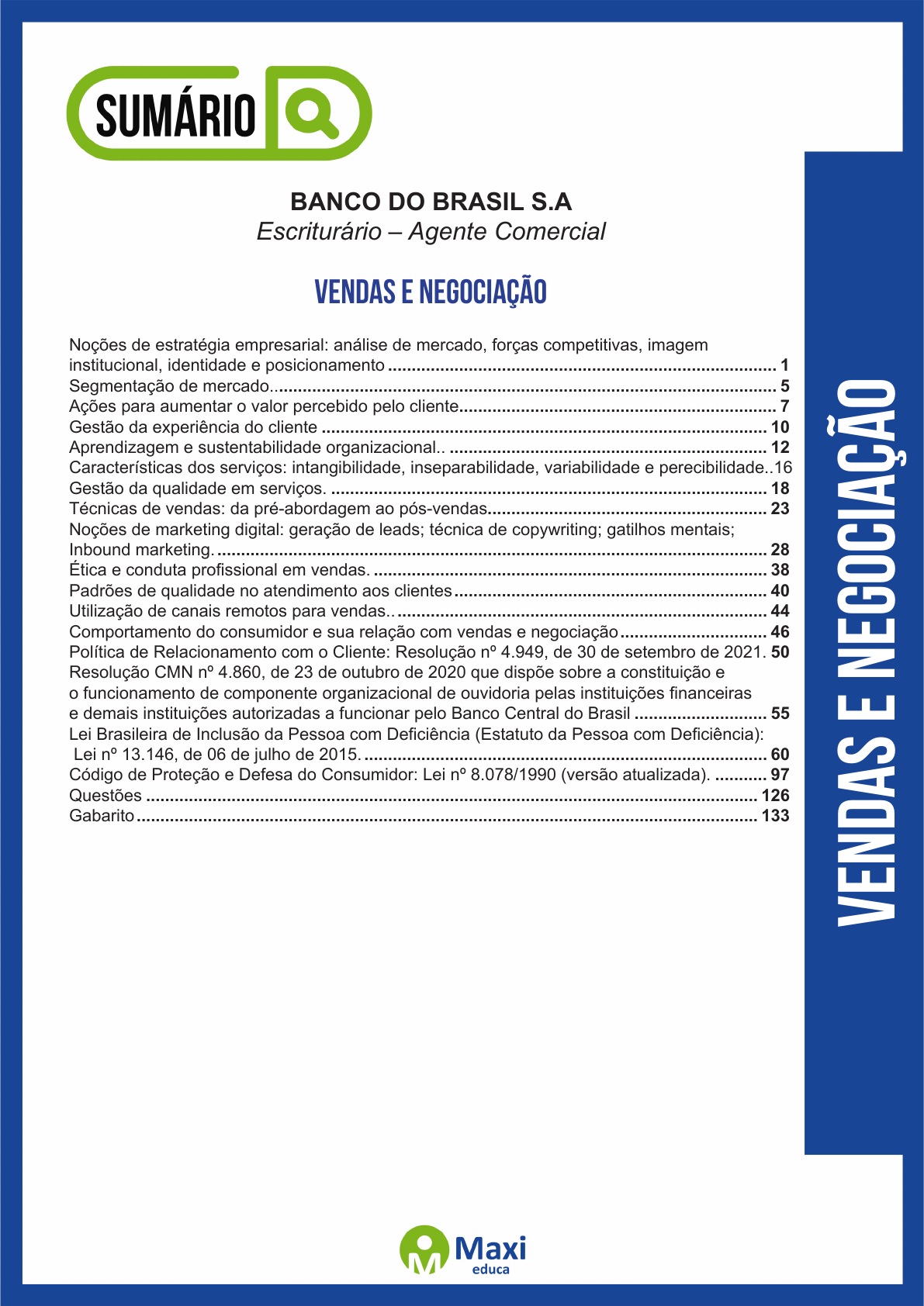 Ve nd as e Ne go ci aç ão Noções de estratégia empresarial: análise de mercado, forças competitivas, imagem institucional, identidade e posicionamento .................................................................................. 1 Segmentação de mercado........................................................................................................... 5 Ações para aumentar o valor percebido pelo cliente................................................................... 7 Gestão da experiência do cliente .............................................................................................. 10 Aprendizagem e sustentabilidade organizacional.. ................................................................... 12 Características dos serviços: intangibilidade, inseparabilidade, variabilidade e perecibilidade..16 Gestão da qualidade em serviços. ............................................................................................ 18 Técnicas de vendas: da pré-abordagem ao pós-vendas........................................................... 23 Noções de marketing digital: geração de leads; técnica de copywriting; gatilhos mentais; Inbound marketing. .................................................................................................................... 28 Ética e conduta profissional em vendas. ................................................................................... 38 Padrões de qualidade no atendimento aos clientes .................................................................. 40 Utilização de canais remotos para vendas.. .............................................................................. 44 Comportamento do consumidor e sua relação com vendas e negociação ............................... 46 Política de Relacionamento com o Cliente: Resolução nº 4.949, de 30 de setembro de 2021. 50 Resolução CMN nº 4.860, de 23 de outubro de 2020 que dispõe sobre a constituição e o funcionamento de componente organizacional de ouvidoria pelas instituições financeiras e demais instituições autorizadas a funcionar pelo Banco Central do Brasil ............................ 55 Lei Brasileira de Inclusão da Pessoa com Deficiência (Estatuto da Pessoa com Deficiência): Lei nº 13.146, de 06 de julho de 2015. ..................................................................................... 60 Código de Proteção e Defesa do Consumidor: Lei nº 8.078/1990 (versão atualizada). ........... 97 Questões ................................................................................................................................. 126 Gabarito ................................................................................................................................... 133 BANCO DO BRASIL S.A Escriturário – Agente Comercial Vendas e Negociação 1 Noções de estratégia empresarial: análise de mercado, forças competitivas, imagem institucio- nal, identidade e posicionamento — Análise de mercado A análise de mercado é um dos componentes do plano de negócios que está relacionado ao marketing da organização. Ela apresenta o entendimento do mercado da empresa, seus clientes, seus concorrentes e quanto a empresa conhece, em dados e informações, o mercado onde atua1. A análise do mercado permite ainda se conhecer de perto o ambiente onde o produto/serviço se encon- tra. O mercado está composto pelo ambiente onde a empresa e produto se localizam, pela concorrência e pelo perfil do consumidor. A definição do mercado leva em conta: → Análise da Indústria/Setor A análise da indústria deve apresentar as informações a respeito do tamanho, crescimento e estrutura da indústria/setor em que sua organização está inserida. Inicia-se com a coleta de informação do setor ao qual pertence o produto/serviço. Essa informação é geralmente discriminada em termos dos objetivos e pode estar relacionada com a es- trutura da indústria e do setor em termos estatísticos, práticas de marketing e o composto de marketing. Também pode ser usada para monitorar mudanças no setor e aproveitar as oportunidades decorrentes dessas mudanças em nichos específicos. → Descrição do Segmento de Mercado O segmento de mercado é definido a partir das características do produto, estilo de vida do consumidor (idade, sexo, renda, profissão, família, personalidade, etc.) e outros fatores que afetam de uma maneira direta o consumo do produto, como localização geográfica por exemplo. Geralmente, para segmentar um mercado é necessário ter um conhecimento mais abrangente, não so- mente qualitativo, mas também quantitativo do mesmo. Um segmento de mercado é um conjunto de clientes que tem necessidades e desejos em comum. Ao agrupar clientes semelhantes, pode-se satisfazer suas necessidades específicas de forma mais eficaz. → Análise SWOT do Produto/Serviço Os pontos fortes e fracos dos principais concorrentes em relação ao produto/serviço devem ser avalia- dos, de maneira a se tentar eliminar as ameaças dos concorrentes e os riscos envolvidos. → Análise da Concorrência A concorrência deve ser avaliada em relação a produtos/serviços e à organização (nesse caso, sua análi- se já ocorreu na etapa de planejamento estratégico). — Forças competitivas Na luta por participação de mercado, a competição não se manifesta apenas através dos demais concor- rentes. Pelo contrário, a competição de um setor industrial tem suas raízes em sua respectiva economia subjacente e existem forças competitivas que vão bem além do que esteja representado unicamente 1 https://www.fca.unesp.br/Home/Instituicao/Departamentos/Gestaoetecnologia/analise-de-mercado. pdf 2 pelos concorrentes estabelecidos nesse setor em particular2. Os clientes, os fornecedores, os novos entrantes em potencial e os produtos substitutos são todos com- petidores que podem ser mais ou menos proeminentes ou a