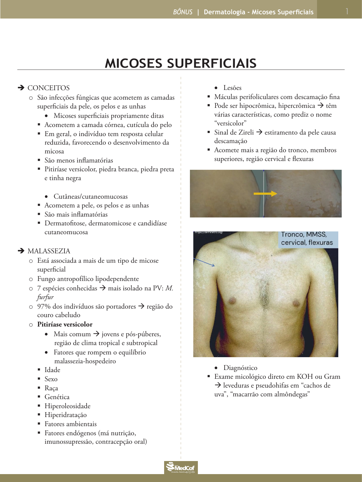 1BÔNUS | Dermatologia - Micoses Superficiais è CONCEITOS o São infecções fúngicas que acometem as camadas superficiais da pele, os pelos e as unhas • Micoses superficiais propriamente ditas § Acometem a camada córnea, cutícula do pelo § Em geral, o indivíduo tem resposta celular reduzida, favorecendo o desenvolvimento da micosa § São menos inflamatórias § Pitiríase versicolor, piedra branca, piedra preta e tinha negra • Cutâneas/cutaneomucosas § Acometem a pele, os pelos e as unhas § São mais inflamatórias § Dermatofitose, dermatomicose e candidíase cutaneomucosa è MALASSEZIA o Está associada a mais de um tipo de micose superficial o Fungo antropofílico lipodependente o 7 espécies conhecidas mais isolado na PV: M. furfur o 97% dos indivíduos são portadores região do couro cabeludo o Pitiríase versicolor • Mais comum jovens e pós-púberes, região de clima tropical e subtropical • Fatores que rompem o equilíbrio malassezia-hospedeiro § Idade § Sexo § Raça § Genética § Hiperoleosidade § Hiperidratação § Fatores ambientais § Fatores endógenos (má nutrição, imunossupressão, contracepção oral) MICOSES SUPERFICIAIS • Lesões § Máculas perifoliculares com descamação fina § Pode ser hipocrômica, hipercrômica têm várias características, como prediz o nome “versicolor” § Sinal de Zireli estiramento da pele causa descamação § Acomete mais a região do tronco, membros superiores, região cervical e flexuras • Diagnóstico § Exame micológico direto em KOH ou Gram leveduras e pseudohifas em “cachos de uva”, “macarrão com almôndegas” Conteúdo licenciado para Henrique Zielke - BÔNUS | Dermatologia - Micoses Superficiais2 § Cultura em azeite de oliva 32°-35° em 15 dias aspecto branco-amarelado § Outros lâmpada de Wood, anatomopatológico • Tratamento § Evitar sudorese excessiva, higiene inadequada § Quadro pode ser crônico e recidivante § Tópicos 1. Queratolíticos 2. Hipossulfato de sódio a 20% 3. Sulfeto de selênio 4. Derivados imidazólicos § Via oral uso depende do grau de acometimento 1. Azólicos (cetoconazol, 200mg/dia, durante 10-20 dias) 2. Triazólicos (itraconazol, 200 mg/dia durante 5-7 dias) 3. Fluconazol pode ser utilizado em dose única de 450 mg § Profilaxia cetoconazol 200mg/dia por 03 dias consecutivos, 1 vez ao mês por 06 meses o Outras dermatoses relacionadas à Malassezia sp. • Foliculite pitirospórica § Lembra a erupção acneiforme § Pode formar pústulas em região do tronco § Em exame micológico direto aspecto em “cachos de uva”, “macarrão com almôndegas” • Dermatite seborreica § Desencadeada com os mesmos gatilhos da Malassezia § Não é uma micose superficial § Acomete, principalmente, pontos de maior oleosidade em região facial Conteúdo licenciado para Henrique Zielke - 3BÔNUS | Dermatologia - Micoses Superficiais è OUTRAS MICOSES SUPERFICIAIS o Piedra branca • Causada pelo Trichosporon beigelii o Piedra preta • Causada pelo Piedraia hortae o Tinha negra • Causada pelo Hortaea wernechii • Acomete principalmente a palma da mão • Tratamento abrasão da região, midazólico tópico o Dermatofitose “tinhas” • Fungos queratinofílicos • Fungos anamorfos (imperfeitos) – não sexuada o Dermatomicose fungos filamentosos não dermatófitos hialinos ou demáceos o Candidíase cutaneomucosa è TINEA CAPITIS o Tonsurante X Favosa • Tonsurante § Microspórica 1. Lesão única 2. Fungos zoo/geofílicos 3. Pode ocorre processos inflamatório agudo quérion celsi Conteúdo licenciado para Henrique Zielke - BÔNUS | Dermatologia - Micoses Superficiais4 § Tricofítica 1. Lesões múltiplas 2. Fungos antropofílicos – geram menos resposta inflamatória • Favosa § Tricofítica (T. shoenleinii) § Rara e cicatricial OBS: é mais comum em crianças!!! o Sul e sudeste M. canis (contato com animais) o Norte e nordeste T. tonsurans è TINHAS o Barba • Clássica aspecto circinado, com formação de vesículas e pápulas regressão central com ação inflamatória nas bordas • Sicosiforme (parece uma foliculite) • Inflamatória (parece quérion) o Corpo • Lesão anular (centrífugo e cura central) • Podem haver vesículas inflamatórias o Inguinocrural • Acomete com maior frequência homens adultos • Lesão anular • Endêmica T. rubrum, crônica • Epidêmica E. floccosum o Tinha do pé • Vesiculosa agida (fungos geo/zoofílicos) • Interdigital (leveduras e bactérias) • Escamosas (crônicas por T. rubrum) • Em placas (anulares com crescimento de cura central) o Tinha da mão • Rara • Pode aparecer juntamente com a tinha dos pés ou carpinteiros • Aspecto numular, centrífugo • Tinha do ouvido descamação sem borda ativa (principal agente nas crianças é o M. canis) o Tinha imbricata • Também chamada de “tokelau” ou “chimberê” • Doença crônica causada por T. concentricum • Indígenas América Central, Pacífico e norte do Brasil o Dermatofítide • Também chamada de “mícide” • Hipersensibilidade à distância Conteúdo licenciado para Henrique Zielke - 5BÔNUS | Dermatologia - Micoses Superficiais • Fungo não adaptado zoo/geofílico • Causa vesículas nas laterais dos dedos das maos (associada à tinha vesiculosa dos pés) ou pápulas foliculares no dorso (quando há associação com a tinha do couro cabeludo) o Onicomicoses • “Tinha da unha” dermatófios • Candida, outros fungos • Pode ser subungueal distal e/ou lateral, subungueal proximal e superficial branca (comum em pacientes diabéticos) o Diagnóstico das dermatofitoses • Exame micológico pelos ou escamas clarificado pelo KOH § Hifas septadas hialinas • Cultura § Em geral, realizada no período de 2 semanas § Meio de cultura Sabouraud + antibiótico • Lâmpada de Wood § Microsporum – vrde § Trochophyton não flouresce (exceto T. shoenleinii – rara) • Histopatologia § Realizado se dúvi