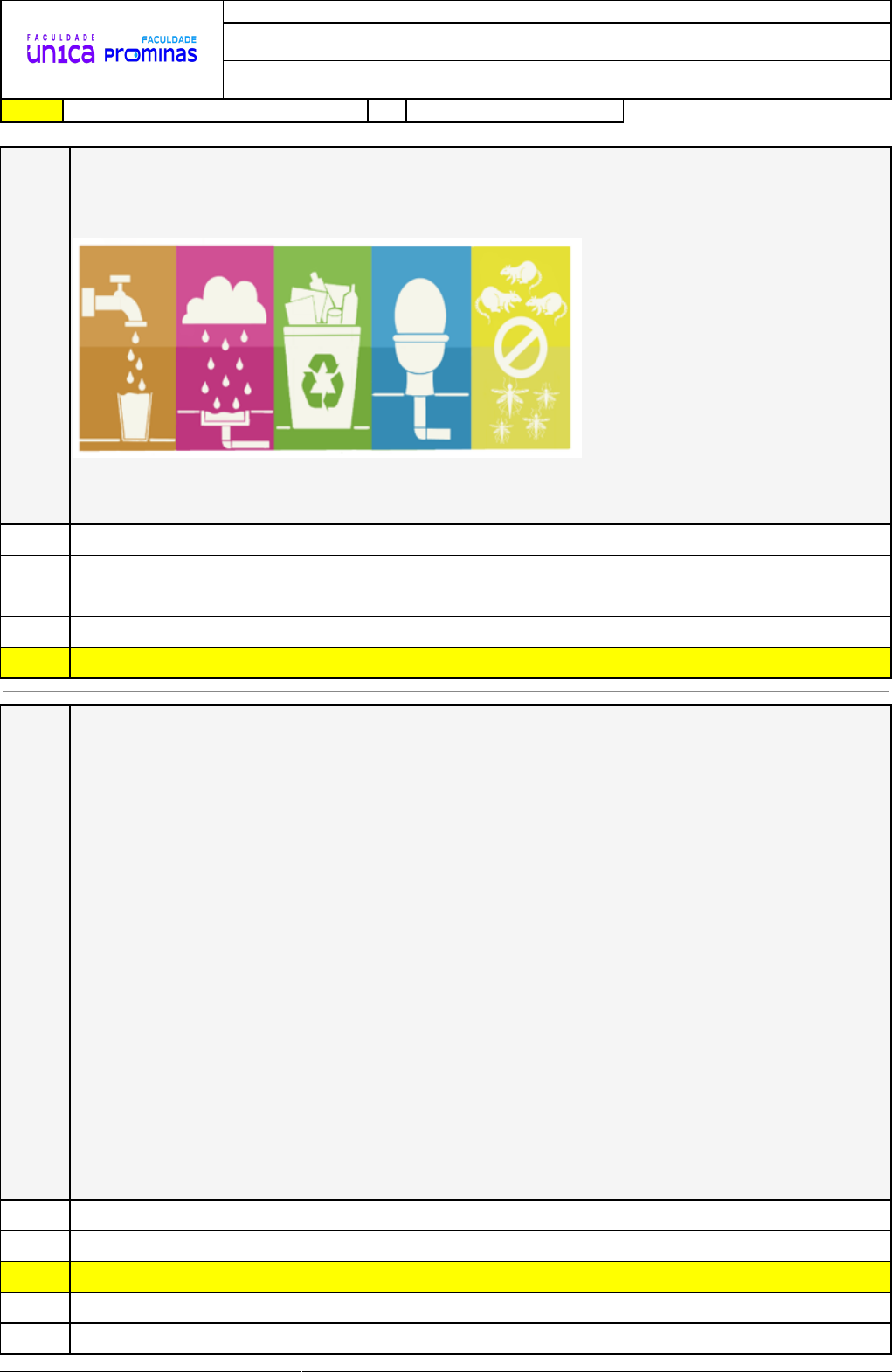 21/04/2024 13:48:20 1/4 REVISÃO DE SIMULADO Nome: MELISSA ANDREZA DE SOUZA DOS SANTOS Disciplina: Optativa II - Ciências do Ambiente Respostas corretas são marcadas em amarelo X Respostas marcardas por você. Questão 001 O saneamento básico é um instrumento que possuem ações para melhorar a qualidade ambiental e a saúde da população. Componentes do saneamento básico. Fonte: Acervo pessoal (Arte de Pedro Fonseca, 2021). Marque a alternativa que NÃO apresenta uma ação do saneamento básico. A) Abastecimento de água. B) Gerenciamento de resíduos sólidos. C) Tratamento de Efluente. X D) Drenagem urbana. E) Controle de emissões gasosas. Questão 002 A política ambiental de uma nação dita como a utilização dos recursos naturais que são passíveis de causar efeitos degradantes na natureza será empregado no desenvolvimento de atividades humanas. Para isso, são diversas leis e medidas que constituem a política ambiental de um país. Em relação à legislação ambiental brasileira, julgue em verdadeiro (V) ou falso (F) as sentenças abaixo: ( ) A PNRS objetiva uma gestão adequada do gerenciamento dos resíduos sólidos envolvendo integralizar as medidas ambientais individuais adotadas pelos estados, distritos, municípios ou particulares. ( ) A PNMA regulamenta as atividades humanas que envolvem o meio ambiente, visando a diminuição de efeitos degradantes através da lei 7.802/89. ( ) A PNMC visa a gestão da emissão de gases poluentes lançados na atmosfera, que provocam alterações climáticas e consequentemente a degradação ambiental a nível global, em toda a biosfera. ( ) São exemplos que compõem a legislação ambiental brasileira a lei de Crimes Ambientais e a lei de Área de Proteção Ambiental, regidos respectivamente pelos números: 6.902/81 e 9.605/98. ( ) A PNPSA é uma importante melhoria das políticas ambientais brasileiras, que abre várias possibilidades compensatórias e aumenta as oportunidades para a aplicação de um mercado sustentável. Assinale a alternativa correta. A) V – F – V – V – V. X B) F – V – V – F – V. C) V – F – V – F – V. D) V – F – V – F – F. E) F – F – V – F – V. 21/04/2024 13:48:20 2/4 Questão 003 A Resolução A/RES/64/292 da Assembleia Geral das Nações Unidas define e classifica o saneamento básico como um serviço indispensável à vida e, portanto, um direito humano. Dando destaque ao saneamento básico por ser um serviço, que de forma análoga a saúde e a educação, influencia a vida da população de maneira direta e visível. Sobre o saneamento básico, julgue os itens a seguir em verdadeiro (V) ou falso (F). ( ) Todas as esferas fundamentais que tangem a vida do homem estão ligadas a práticas de saneamento como questões de habitação, alimentação, saúde e condições de trabalho. ( ) O investimento em saneamento básico gera economia em saúde, estimando que para cada US$ 1 investido em saneamento, tem-se um retorno de quase seis vezes, considerando os menores custos de saúde, aumento da produtividade e um número menor de mortes prematuras. ( ) O saneamento básico está diretamente ligado ao bem-estar da população. A saúde promovida pelo saneamento acarreta em melhorias para pessoas que já estão acometidas por doenças. ( ) O saneamento básico proporciona uma saúde preventiva que diminui as chances de a população adquirir doenças, o que torna locais saneados mais propícios a uma saudável qualidade de vida. ( ) A diarreia, doença frequentemente presente em lugares sem saneamento básico, no mundo, é a causa da morte de muitas crianças abaixo dos 5 anos, sendo esta questão resolvida através do uso de inseticidas para o combate a moscas. Assinale a alternativa correta. A) V – V –V – F – F X B) F – V – F – V – F C) V – F – V – F – V. D) F – V –F – V – V. E) V – V – F – V – F. Questão 004 A falta de saneamento e o uso de água imprópria ao consumo humano são a causa da morte de mais de um quarto de crianças com menos de cinco anos. Cerca de 1,7 milhões de meninos e meninas nesta faixa etária perdem suas vidas porque moram em locais insalubres (ONU, 2017). Muitas pessoas, especialmente crianças, perdem suas vidas por viverem em locais não saneados, dentre as alternativas abaixo, assinale a que contém exemplos de doenças comuns em lugares sem saneamento básico. A) Zika e Asma B) Dengue e Surdez C) Câncer e Leptospirose D) Lúpus e Febre amarela. X E) Diarreia e Chikungunya Questão 005 Nota-se que ausência ou a qualidade de água ou de esgotamento sanitário ainda é responsável por muitas mortes em todo o mundo. Marque a alternativa que possua doenças de veiculação hídrica. A) Tétano e Pneumonia. B) Corona Vírus e Dengue. C) Mal de chagas e cólera. X D) Cólera e verminose. E) Dengue e Malária. 21/04/2024 13:48:20 3/4 Questão 006 “Conjunto de ações voltadas para a busca de soluções para os resíduos sólidos, de forma a considerar as dimensões política, econômica, ambiental, cultural e social, com controle social e sob a premissa do desenvolvimento sustentável (BRASIL, 2010). Esta definição diz respeito a: X A) Gestão integrada de resíduos. B) Saneamento básico. C) Saneamento ambiental. D) Gestão Ambiental. E) Gerenciamento de Resíduos. Questão 007 (UEPA) O crescimento precipitado das cidades em decorrência do acelerado desenvolvimento tecnológico da segunda metade do século XX produziu um espaço urbano cada vez mais fragmentado, caracterizado pelas desigualdades e segregação espacial, subemprego e submoradia, violência urbana e graves problemas ambientais. Sobre os problemas socioambientais nos espaços urbanos-industriais é correto afirmar que: A) os conflitos sociais existentes no espaço urbano mundial estão associados à ampliação de políticas públicas para melhoria de infraestrutura que provocou o deslocamento de milhões de pessoas do campo para 