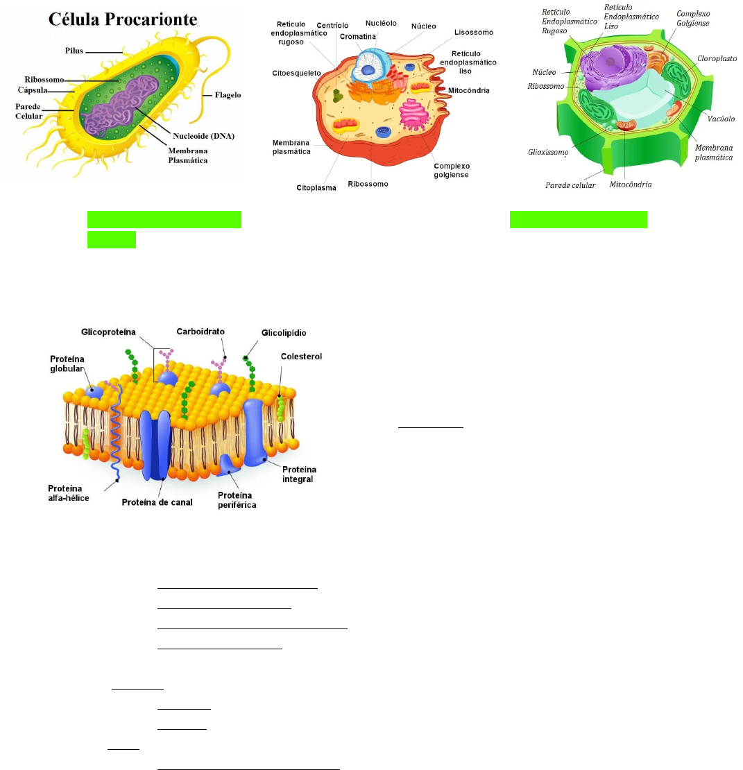 CITOLOGIA · células procariontes: não apresentam núcleo organizado · possuem parede celular (peptideoglicano), membrana plasmática, hialoplasma (tipo um citoplasma), ribossomos, material genético (nucleóide) e, às vezes, cápsula e flagelo · células eucariontes: apresentam núcleo organizado e organelas · membrana plasmática, citoplasma e parede celular: · membrana: · regula a entrada e saída de substâncias da célula - permeabilidade seletiva · é uma bicamada fosfolipídica · cabeça polar (hidrofílica) e cauda apolar (hidrofóbica) · a cauda é formada por ácidos graxos e a cabeça por colina, fosfatos e glicerol · colesterol: tem em membrana da célula animal - influencia na permeabilidade - quanto mais colesterol, mais dura é a membrana, menos fluída (não passa nada) · nela tem carboidratos e proteínas · canal proteico ou iônico: substâncias específicas passam · proteína carreadora: pega substâncias maiores e transporta · proteína de reconhecimento: reconhece substâncias, sinaliza e comunica · proteína receptora: substância liga à proteína, se encaixe for correto abre · transporte por membrana: · passivo: não precisa de energia para acontecer · osmose: só flui solvente pela membrana - hipotônico para hiper · difusão: só flui soluto pela membrana - hipertônico para hipo · ativo: precisa de energia para acontecer - contra o gradiente de concentração · bomba de sódio e potássio: dentro da célula tem muito K e fora tem muito Na - ai ocorre difusão pra tentar equilibrar mas se equilibrar a célula morre então bomba de sódio e potássio joga dnv K pra dentro e Na pra fora da célula · citoplasma: · formado por citosol, composto por água, sais minerais, íons, organelas e macromoléculas · está em constante movimento e é onde o metabolismo da célula se processa · parede celular: · se localiza externa a membrana plasmática e dá forma à célula · organelas: · ribossomos: · função: síntese de proteínas que serão usadas na própria célula · podem estar livres ou aderidos às membranas do retículo endoplasmático · retículo endoplasmático: · função: produzir e transportar substâncias · liso (sem ribossomos aderidos) ou rugoso (com ribossomos aderidos) · complexo de golgi: · pequenas bolsas com a função de armazenar e secretar substâncias para fora da célula - também modificam algumas substâncias produzidas no retículo endoplasmático rugoso e realizam síntese de carboidratos · mitocôndria: · função: respiração celular - geração de energia (pega glicose e transforma em ATP) · lisossomos: · bolsas com enzimas digestivas capazes de digerir uma grande variedade de substâncias orgânicas · é liberado na forma inativa pelo golgi e quando chega no lugar certo é ativado pelo bombeamento de H+ e cloreto · peroxissomos: · só tem nas células animais · bolsas com enzimas que oxidam substâncias orgânicas formando peróxido de hidrogênio que se transforma em água e O2 · centríolo: · só em células animais · função: auxiliam na divisão celular - tem capacidade de autoduplicação · plastos: · só em algas e plantas · leucoplasto (armazena tudo menos pigmentos), cloroplasto (só armazena cloroplasto - tem clorofila então é verde) e cromoplasto (armazena pigmentos) · vacúolo: · só em células vegetais · função: armazena substâncias, osmorregula, ajuda na digestão intracelular, da sustentação e armazena pigmentos · image1.png image4.png image3.png image2.png