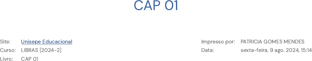 CAP 01 Site: Unisepe Educacional Curso: LIBRAS [2024-2] Livro: CAP 01 Impresso por: PATRICIA GOMES MENDES Data: sexta-feira, 9 ago. 2024, 15:14 https://centralmoodle.unisepe.com.br/ Índice 1. 1 2. 2 3. 3 4. 4 5. 5 6. 6 7. 7 8. 8 9. 9 10. 10 11. 11 12. 12 13. 13 14. 14 1. 1 2. 2 3. 3 4. 4 5. 5 6. 6 7. 7 8. 8 9. 9 10. 10 11. 11 12. 12 13. 13 14. 14