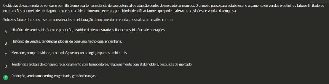 0 objetivo do orçamento de vendas é permitir à empresa ter consciência de seu potencial de atuação dentro do mercado primeiro passo para estabelecer orçamento de vendas é definir os fatores limitadores ou restrições por meio de um diagnóstico do seu ambiente interno e externo, permitindo identificar fatores que podem afetar as previsões de vendas da Sobre os fatores internos a serem considerados na elaboração do orçamento de vendas, assinale a alternativa correta: A Histórico de vendas, histórico de produção, histórico de demonstrativos financeiros, histórico de operações Histórico de vendas, tendências globais de consumo, tecnologia, engenharia competitividade, tecnologia, impactos ambientais D Tendências globais de consumo, relacionamento com relacionamento com stakeholders, pesquisas de mercado. E Produção, engenharia,
