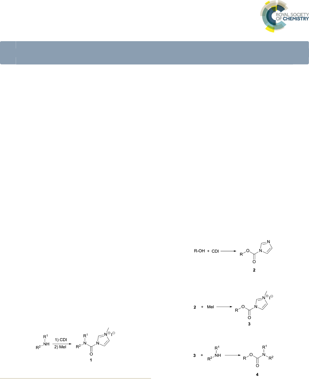 RSC Advances PAPER Pu bl is he d on 2 4 Fe br ua ry 2 01 4. D ow nl oa de d by F ed er al U ni ve rs ity o f M in as G er ai s on 2 /7 /2 02 3 3: 39 :3 1 PM . View Article Online View Journal | View Issue Instituto de Desarrollo Tecnológica para Cient́ıco Tecnológico Santa Fe. CONICET “El Pozo”. 3000, Santa Fe, Argentina. E-m 3424511079; Tel: +54 3424511595 † Electronic supplementary information NMR spectra for all compounds. See DOI ‡ This work is dedicated to the memorie Cabrera. Cite this: RSC Adv., 2014, 4, 13012 Received 14th January 2014 Accepted 24th February 2014 DOI: 10.1039/c4ra00373j www.rsc.org/advances 13012 | RSC Adv., 2014, 4, 13012–13017 Method for the synthesis of N-alkyl-O-alkyl carbamates† Victoria A. Vaillard, Marianela González, Jesica P. Perotti, Ricardo J. A. Grau‡ and Santiago E. Vaillard* Primary and secondary carbamates were prepared from primary, secondary and neo-pentyl alcohols, and carbonyl-di-imidazole (CDI), using a new three step method. Non-acidic alcohols reacted with CDI affording carbamoyl-imidazoles with excellent yields (92–97%). The carbamoyl-imidazoles were then converted into the more reactive imidazolium salts, which upon reaction with primary and secondary amines afforded the corresponding carbamates in high isolated yields (66–99%). Introduction The synthesis of carbamates plays a key role in different areas of chemistry. For example, carbamates nd widespread applica- tion in pharmaceutical1 and agrochemical2 products. Moreover, carbamates are used as intermediates in organic synthesis,3 for the protection of amino groups in peptide chemistry,4 and as linkers in combinatorial chemistry.5 Carbamates can be prepared by the reaction of an electro- philic alkoxycarbonyl derivatives with nucleophilic amines. Alternatively, carbamates can also be obtained upon reaction of electrophilic carbamoyl groups with nucleophilic alcohols. Most of these reactions involve the use of toxic phosgene6 or phosgene equivalents such as isocyanates7 or di- and tri- phosgene.8Different alternative methods that do not involve the use of toxic reagents have also been reported.9 Aer the seminal works of Salvesen10 and Rapoport,11 it was demonstrated by Batey that carbamoylimidazolium salts, which in turn can easily be obtained by a two step procedure from amines and carbonyl dimidazole (CDI, eqn (1)), can be used for the efficient synthesis of amides12 and ureas.12,13 (1) la Industria Qúımica (INTEC). Centro -UNL, Ruta Nacional 168 Km 1. Paraje ail: svaillard@intec.unl.edu.ar; Fax: +54 (ESI) available: Copies of 1H and 13C : 10.1039/c4ra00373j s of Professors R. J. A. Grau and M. I. Nucleophilic (and acidic) alcohols, such as phenols,14 and naphthols, react with carbamoyl imidazolium salts 1 in the presence of triethylamine, affording the corresponding carba- mates in good yield. Less nucleophilic aliphatic alcohols react slowly with the carbamoyl imidazolium salts 1, and good yields of carbamates were only obtained with 2,2,2-triuoroethanol in large excess, as the reaction solvent. Moreover, allyl and benzyl alcohol required the use of NaH to afford acceptable yields of carbamates. (2) (3) (4) The reaction of carbamoylimidazolium iodide 1 with the more basic alkoxides of aliphatic alcohols do not afford the required bis-alkyl carbamates, probably due to the acid–base reaction between the nucleophile and the proton at position 2 of the imidazolium salt ring 1.10,12b,c,14 This journal is © The Royal Society of Chemistry 2014 https://doi.org/10.1039/c4ra00373j https://pubs.rsc.org/en/journals/journal/RA https://pubs.rsc.org/en/journals/journal/RA?issueid=RA004025 Table 2 Synthesis of carbamates 4a–t by reaction of alkoxycarbonyl- imidazolium iodide 3a–d with primary and secondary aliphatic amines Entrya Salt Amine Yieldb (%) 1 3a 4-Piperidone 97 (4a) 2 3a Morpholine 96 (4b) 3 3a Pyrrolidine 99 (4c) 4 3a n-Octylamine 94 (4d) 5 3a Benzylamine 99 (4e) 6 3b 4-Piperidone 78 (4f) 7 3b Morpholine 81 (4g) Paper RSC Advances Pu bl is he d on 2 4 Fe br ua ry 2 01 4. D ow nl oa de d by F ed er al U ni ve rs ity o f M in as G er ai s on 2 /7 /2 02 3 3: 39 :3 1 PM . View Article Online Taking into account that aliphatic alcohols readily react with CDI affording alkoxycarbonylimidazoles 2 and the increased nucleophilicity of aliphatic amines compared with analogous alcohols, we envisaged that changing the order of the reaction sequence (i.e. rst the reaction of the aliphatic alcohols with CDI, followed by alkylation and then reaction with the amines (eqn (2)–(4))), would be a simple alternative to overcome the limitations of the previously reported methods. Thus, alkoxycarbonylimidazolium iodides 3 should react with amines to yield carbamates 4 under mild conditions, avoiding the use of strong bases and the use of large excesses of the nucleophiles. Since strong bases are not required in this new reaction sequence, the acid–base reaction of the imidazo- lium salt 3 and the basic nucleophiles should easily be overcome. 8 3b Pyrrolidine 98 (4h) 9 3b n-Octylamine 81 (4i) 10 3b Benzylamine 91 (4j) 11 3c 4-Piperidone 81 (4k) 12 3c Morpholine 80 (4l) 13 3c Pyrrolidine 86 (4m) 14 3c n-Octylamine 79 (4n) 15 3c Benzylamine 70 (4o) 16 3d 4-Piperidone 91 (4p) 17 3d Morpholine 96 (4q) 18 3d Pyrrolidine 80 (4r) 19c 3d n-Octylamine 66 (4s) 20 3d Benzylamine 81 (4t) a 1 eq. 3, 1.1 eq. of amine, acetonitrile, room temperature, 24 h. b Isolated yield. c The product was obtained in three steps without purication of intermediate products. Results and discussion To evaluate our proposed strategy for the synthesis of carba- mates, alkoxycarbonyl imidazole 2a was prepared in high yield from neo-pentyl alcohol under mild reaction conditions (95%, entry 1, Table 1). The reaction of carbonyl imidazole 2a with 4- piperidone was sluggish and only 11% GC yield of carbamate 4a was obtained aer 16 h at room temperature, which is in accordance with the anticipated low reactivity of
