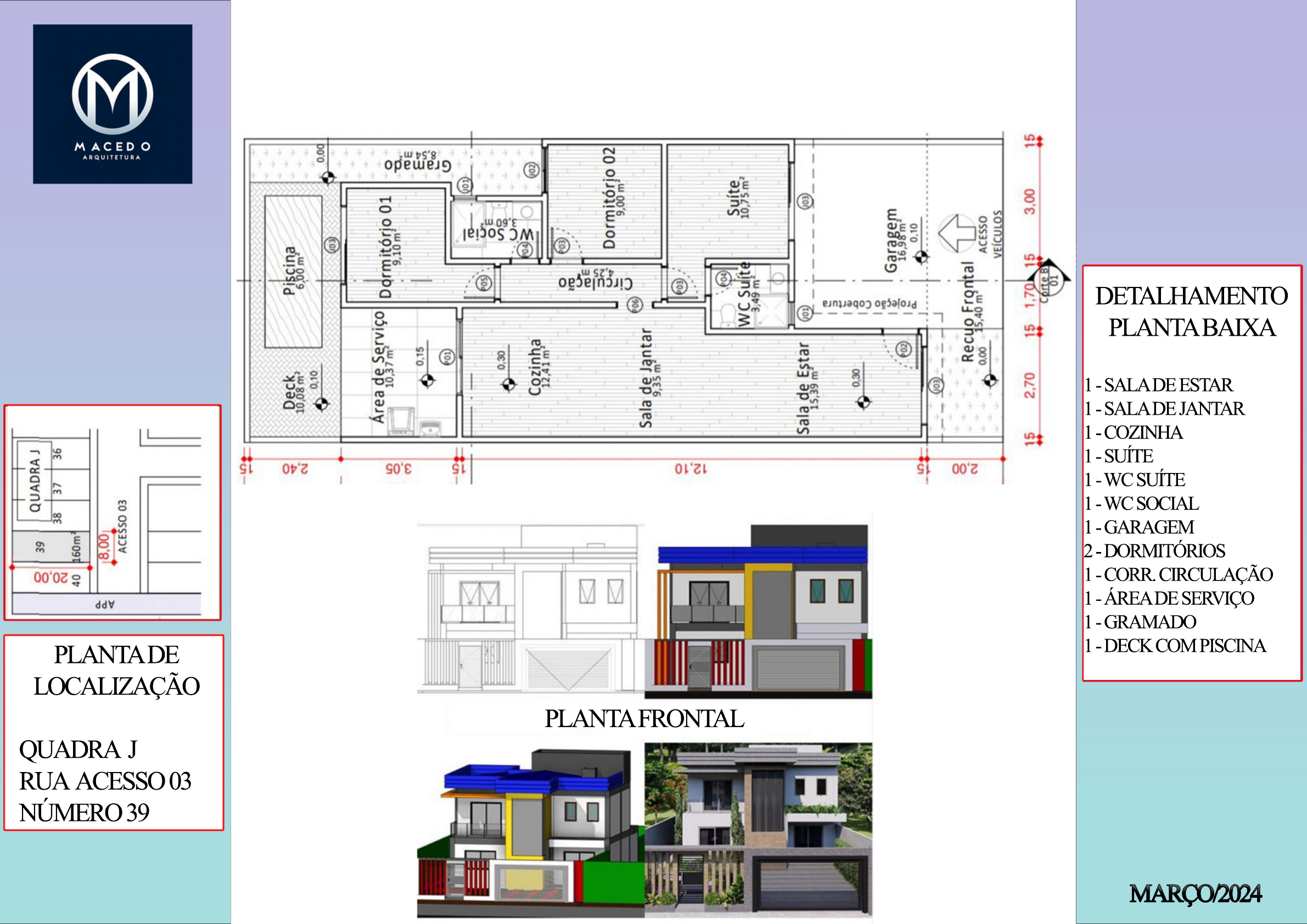 MARÇO/2024 DETALHAMENTO PLANTA BAIXA 1 - SALA DE ESTAR 1 - SALA DE JANTAR 1 - COZINHA 1 - SUÍTE 1 - WC SUÍTE 1 - WC SOCIAL1 - WC SOCIAL 1 - GARAGEM 2 - DORMITÓRIOS 1 - CORR. CIRCULAÇÃO 1 - ÁREA DE SERVIÇO 1 - GRAMADO 1 - DECK COM PISCINAPLANTA DE LOCALIZAÇÃO QUADRA J RUA ACESSO 03 NÚMERO 39 PLANTA FRONTAL