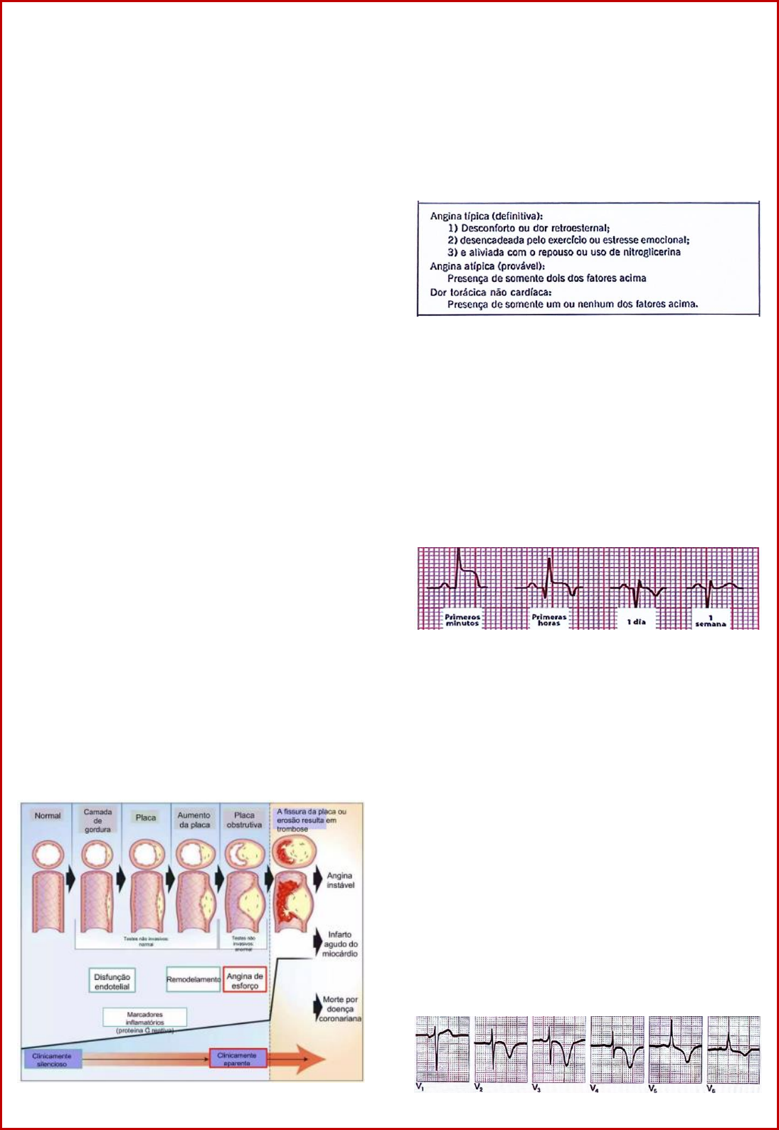 Síndrome Coronariana Aguda Introdução → 15 a 30% das dores torácicas são síndrome coronariana aguda → Menos de 50% dos pacientes com infarto vão ter algum tipo de alteração no marcador de necrose miocárdica na hora que chegar no pronto atendimento → 3% dos pacientes são liberados erroneamente em grandes centros → Até 11% dos pacientes são mandados embora: chegam com dor no peito, porém a contagem de enzima cardíaca está normal – deveria internar e estratificar → Exame físico na maioria das vezes é basicamente inexpressivo. Placa Aterosclerótica → A síndrome coronariana aguda inicia quando a placa se rompe → placa instável expõe o tecido subendotelial → gera uma cascata de coagulação → trombo no local → Síndrome coronariana por espasmo: muito comum em usuário de cocaína → quanto mais a placa vai obstruindo o vaso, menor é a reserva de fluxo e menor é a capacidade desse paciente ter um esforço físico → podendo acontecer em mais de 95% de obstrução e o paciente começar a ter sintoma inclusive ao repouso → Desequilíbrio entre oferta e consumo: o paciente com anemia ou sepse, nas quais vão aumentar demais o consumo de O2 no miocárdio, se houver uma placa que não permite com que seja aumentado esse fluxo não vai permitir a passagem do sangue Angina → Angina estável: desconforto retroesternal que piora ao esforço e melhora ao repouso → Angina instável: desconforto retroesternal presente durante o esforço e repouso Infarto Agudo do Miocárdio com Supra do Segmento ST → Há o supradesnivelamento de ST em relação a linha de base → Geralmente a artéria está totalmente ocluída com um trombo e vai, para o miocárdio que é irrigado pela coronária → Quanto mais rápido atendimento, melhor é o resultado e menor a morbimortalidade Infarto Agudo do Miocárdio sem Supra do Segmento ST → Não há o supradesnivelamento de ST em relação a linha de base → Evidência de lesão miocárdica através de marcadores positivos → Pode ter algumas alterações isquêmicas no ECG, onda T e infradesnivelamento do segmento ST também, como também pode ser normal e ter lesão miocárdica → O vaso pode estar subocluido, tem um pouco de passagem de sangue para o seguimento distal, porém ela está sendo insuficiente para manter o miocárdio normal. → Em casos de infarto sem supra de ST, alivia a dor do paciente com medicação para planejar como será a cirurgia Angina Instável → É a definição do sintoma sem lesão do miocárdio propriamente dito, ou seja, não vai ter alteração dos marcadores de necrose miocárdica → É uma urgência/emergência → Se o paciente, com dor no peito, tiver um eletrocardiograma e valores das enzimas cardíacas não pode liberá-lo, pois ele vai infartar em breve Anatomia → Infarto transmural: supradesnivelamento ST, compromete toda a circulação da espessura do miocárdio → Infarto subendocárdico ou não transmural: infarto sem supra, afeta mais o seguimento distal da coronária que nesse caso é a parte mais interna do coração → Coronária direita: pelo lado direito passa no sulco atrioventricular → emite ramos para o ventrículo direito → chega até a parede inferior do ventrículo esquerdo posteriormente → Coronária esquerda: se divide em dois ramos, descendente anterior ou interventricular anterior → passa no sulco interventricular → emitir ramos para o septo e diagonais para o ventrículo esquerdo → Circunflexa: caminho oposto da coronária direita → no sulco atrioventricular → as vezes é ela que chega na parede inferior ECG e Anatomia → Dependendo do segmento que aparecer a alteração eletrocardiográfica, sabe-se a parede que está sendo comprometida (as vezes até qual artéria) → Parede lateral: artéria circunflexa ou diagonal → Parede anterior: artéria descendente anterior com seus ramos diagonais → Parede inferior: artéria coronária direita e artéria coronária esquerda Infarto Anterior → V1-V5 → Com supradesnivelamento do segmento ST de V1-V5 Infarto Lateral → DI, V5 e V6 → Pode passar desapercebido pois é um supradesnivelamento do segmento ST pequeno, já que não há uma visibilidade tão boa da parede lateral (eletrodos de V1 até V6 vão estar na frente) → Suspeita de ser na parede lateral: coloca- se os eletrodos V7, V8 e V9 – V8 na ponta da escápula, um pouco para o lado V9 e V7 Infarto Inferior → VII, VIII mais acentuado e aVF → O infarto pode estar acontecendo no ventrículo direito, o que muda totalmente o manejo Infarto de Ventrículo Direito → Utilizar as derivações para a direita – colocar os eletrodos de V1 a V6 na mesma posição: V4R, V5R, V6R com supradesnivelamento do segmento ST → Pensar em infarto inferior junto com VD → Quadro clinico: hipotensão, dispneia sem congestão pulmonar, PVC elevada → ECG: alteração do segmento ST em V3R e V4R → Tratamento: volume, não utilizar vasodilatador (vai abaixar mais ainda a pressão) Abordagem Inicial → Anamnese e exame físico feitos rapidamente e direcionado → Monitorizar sinais vitais, oxigenação e sinais vitais → Puncionar acesso venoso → Administrar oxigênio suplementar só se oximetria menor que 94%, pois O2 em excesso faz vasoconstrição e piora a evolução do infarto → Realizar um eletrocardiograma em até 10 minutos da chegada, é o mais importante → Quanto mais rápido for o atendimento é melhor → Solicitar exames se houver necessidade → Medicação de acordo com a suspeita diagnostica → Quando alguma característica no exame físico é muito clara, normalmente é porque é mais grave (palidez, sudorese fria, face angustiada, inquietação) → Ecocardiograma é para diagnostico diferencial → Tomografia de coronárias é rápido de fazer em paciente de baixo risco A. É infarto, dor definitiva B. Provavelmente é infarto C. Provavelmente não é infarto D. Não é infarto Alterações que sugerem maior g