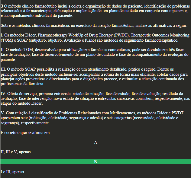 3 O método clínico farmacêutico inclui a coleta e organização de dados do paciente, identificação de problemas relacionados à farmacoterapia, elaboração e implantação de um plano de cuidado em conjunto com paciente, e acompanhamento individual do paciente. Sobre os métodos clínicos farmacêuticos no exercício da atenção farmacêutica, analise as afirmativas a seguir: I. Os métodos Pharmacotherapy WorkUp of Drug Therapy (PWDT), Therapeutic Outcomes Monitoring (TOM) e SOAP (subjetivo, objetivo, Avaliação e Plano) são métodos de seguimento farmacoterapêutico. II. O método TOM, desenvolvido para utilização em farmácias comunitárias, pode ser dividido em três fases: fase de avaliação, fase de desenvolvimento de um plano de cuidado e fase de acompanhamento da evolução do paciente. III. SOAP possibilita a realização de um atendimento prático e seguro. Dentre os principais objetivos deste método incluem-se: acompanhar a rotina de forma mais eficiente, coletar dados para planejar ações preventivas e direcionadas para diagnóstico precoce, e estimular a educação continuada dos profissionais da farmácia. IV. Oferta do serviço, primeira entrevista, estado de situação, fase de estudo, fase de avaliação, resultado da avaliação, fase de intervenção, novo estado de situação e entrevistas sucessivas consistem, respectivamente, nas etapas do método V. Com relação à classificação de Problemas Relacionados com Medicamentos, os métodos e PWDT apresentam sete (indicação, efetividade, segurança e adesão) e seis categorias (necessidade, efetividade e segurança), respectivamente. É correto que se afirma em: A II, III e V, apenas. B