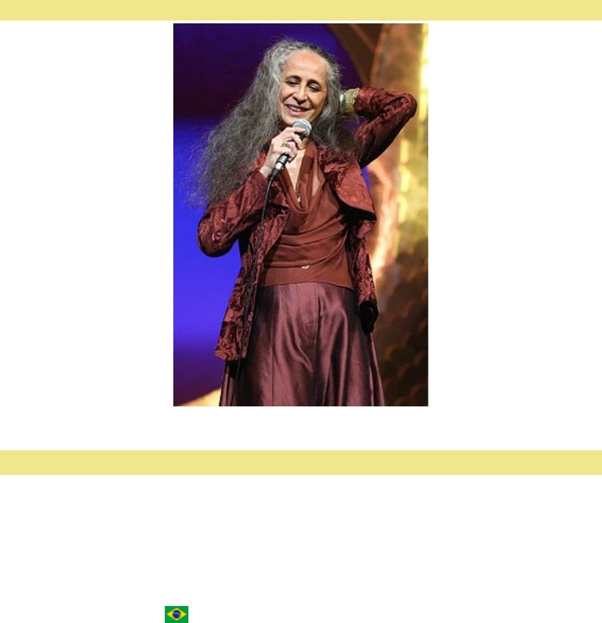 Maria Bethânia Maria Bethânia Bethânia em 2015, no 26º Prêmio da Música Brasileira -Edição em que foi a grande homenageada Informação geral Nome completo Maria Bethânia Vianna Telles Velloso Também conhecido(a) como 'Abelha Rainha da MPB[1] Nascimento 18 de junho de 1946 (70 anos) Local de nascimento Santo Amaro, BA Brasil Gênero(s) MPB, Bossa nova, Samba Instrumento(s) Vocal Extensão vocal contralto Período em atividade 1965–presente Gravadora(s) RCA, Universal Music Brasil, Verve Records, EMI Brasil, Biscoito Fino, Wrasse, Sony BMG Influência(s) Amália Rodrigues Billie Holiday Cartola Tom Jobim Nana Caymmi Nara Leão Vinicius de Moraes Toquinho Edith Piaf Isaurinha Garcia Dalva de Oliveira Página oficial www.mariabethania.com Maria Bethânia Vianna Telles Velloso[2] (Santo Amaro, 18 de junho de 1946), mais conhecida como Maria Bethânia, é uma cantora e compositora brasileira. Nascida em Santo Amaro, Bahia, ela participou, na juventude, de peças teatrais ao lado de seu irmão, o também cantor e compositor Caetano Veloso e de outros cantores proeminentes da época. Em 1965, mudou-se para o Rio de Janeiro onde começou sua carreira musical substituindo a cantora Nara Leão no espetáculo Opinião. No mesmo ano, assinou contrato com a gravadora RCA e lançou seu homônimo álbum de estreia. Bethânia foi eleita a 5ª maior voz da música brasileira pela revista Rolling Stone Brasil. Biografia 1946–1964: Antes da fama e início da carreira Nascida na Bahia em 18 de junho de 1946, Maria Bethânia é a sexta filha de José Teles Veloso (Seu Zezinho), funcionário público dos Correios, e de Claudionor Viana Teles Veloso (Dona Canô). Seu nome foi escolhido pelo irmão Caetano Veloso, inspirado em uma canção, a valsa Maria Betânia, do compositor Capiba, então um sucesso na voz de Nélson Gonçalves. Bethânia é membro de uma família de artistas, sendo irmã da escritora Mabel Velloso, do cantor e compositor Caetano Veloso, e tia dos cantores Belô Velloso e Jota Velloso. Na juventude, participou de espetáculos semi-amadores em parceria com Tom Zé, Gal Costa, Caetano Veloso e Gilberto Gil e, em 1960, mudou-se para Salvador com a intenção de terminar os estudos. Lá, começou a frequentar o meio artístico, ao lado do irmão Caetano e três anos depois, em 1963, estreou como cantora na peça Boca de Ouro, de Nelson Rodrigues.Nesta época, Bethânia e Caetano conheceram outros músicos iniciantes como Gilberto Gil, Gal Costa, Tom Zé, Alcivando Luz e outros, os quais acabariam sendo lançados como cantores e compositores pela cantora. No ano seguinte, montaram juntos os espetáculos Nós por Exemplo, Mora na Filosofia e Nova Bossa Velha, Velha Bossa Nova. 1965-1966: Maria Bethânia, Maria Bethânia canta Noel Rosa e Eu Vivo num Tempo de Guerra A data oficial da estreia profissional de Bethânia é 13 de fevereiro de 1965, quando ela foi convidada pela musa da bossa nova, a cantora e violonista Nara Leão, para substituí-la no espetáculo Opinião, em cartaz no Rio de Janeiro, pois a mesma precisou se afastar por problemas de saúde. Nara Leão houvera conhecido Bethânia no ano anterior, na Bahia, quando aquela assistiu à esta em um dos espetáculos em que Bethânia atuara. Do espetáculo surgiu o primeiro sucesso de Bethânia, a canção de protesto "Carcará", composta originalmente para Nara Leão.Nesse mesmo ano, foi contratada pela gravadora RCA, onde gravou o primeiro álbum, Maria Bethânia, lançado em junho daquele mesmo ano. O álbum continha, além de "Carcará", as faixas "Mora na Filosofia", "Andaluzia", "Feitio de Oração" e "Sol Negro", esta última em dueto com Gal Costa. Ainda em 1965, lançou um compacto triplo, Maria Bethânia canta Noel Rosa, que trouxe as canções "Três Apitos", "Pra Que Mentir", "Pierrot Apaixonado", "Meu Barracão", "Último Desejo" e "Silêncio de um Minuto", e o compacto simples "Eu Vivo num Tempo de Guerra". No mesmo ano participou dos espetáculos Arena canta Bahia e Tempo de Guerra, ambos dirigidos por Augusto Boal, também competindo em festivais. Em São Paulo e no Rio de Janeiro, apresentou-se em teatros e casas noturnas de espetáculos, tornando-se assim nacionalmente conhecida. 1967–1968: Edu e Bethania, Recital Na Boite Barroco, Velloso-Bethânia-Gil e Nada Além Em 1967, Bethânia teve sua carreira impulsionada ao lançar seu segundo álbum Edu e Bethania, em parceria com Edu Lobo, a pedido do mesmo. Edu era um cantor e compositor iniciante, assim como Bethânia, que se firmava como cantora após o sucesso inicial no espetáculo Opinião.No disco, a cantora teve performance solo em duas faixas e participou de duetos com Edu nas canções "Cirandeiro", "Sinherê" e "Prá Dizer Adeus". Esta última obteve um grande sucesso e colocou Bethânia definitivamente no roll das grandes cantoras do Brasil. Em 1968, interpretou a canção-tema do filme O Homem que Comprou o Mundo, de autoria de Francis Hime. 1975–1976: Chico Buarque & Maria Bethânia Ao Vivo, Pássaro Proibido e Doces Bárbaros Bethânia foi também a idealizadora do grupo Doces Bárbaros, na qual era um dos vocais da banda, que lançou um disco ao vivo homônimo juntamente com os colegas Gal Costa, Caetano Veloso e Gilberto Gil. Doces Bárbaros era uma típica banda hippie dos anos 1970, e ao longo dos anos, este lema foi tema de um filme com direção de Jom Tob Azulay, um DVD, e um enredo da escola de samba Estação Primeira de Mangueira em 1994 com a canção "Atrás da verde-e-rosa só não vai quem já morreu". Já comandaram trio elétrico no carnaval de Salvador, espetáculos na praia de Copacabana e uma apresentação para a Rainha da Inglaterra. Inicialmente o disco seria registrado em estúdio, mas por sugestão de Gal e Bethânia, foi o espetáculo que ficou registrado em disco, sendo quatro daquelas canções gravadas pouco tempo antes no compacto duplo em estúdio: "Esotérico", "Chuckberry Fields Forever", "São João Xangô Menin