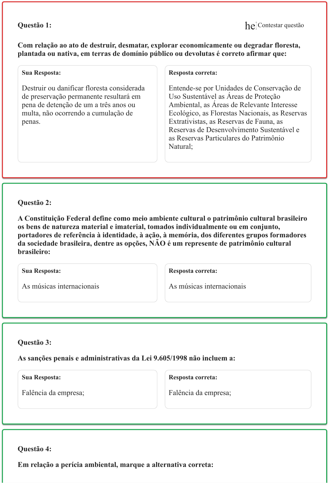 Questão 1: Com relação ao ato de destruir, desmatar, explorar economicamente ou degradar floresta, plantada ou nativa, em terras de domínio público ou devolutas é correto afirmar que: Sua Resposta: Destruir ou danificar floresta considerada de preservação permanente resultará em pena de detenção de um a três anos ou multa, não ocorrendo a cumulação de penas. Resposta correta: Entende-se por Unidades de Conservação de Uso Sustentável as Áreas de Proteção Ambiental, as Áreas de Relevante Interesse Ecológico, as Florestas Nacionais, as Reservas Extrativistas, as Reservas de Fauna, as Reservas de Desenvolvimento Sustentável e as Reservas Particulares do Patrimônio Natural; hel Contestar questão Questão 2: A Constituição Federal define como meio ambiente cultural o patrimônio cultural brasileiro os bens de natureza material e imaterial, tomados individualmente ou em conjunto, portadores de referência à identidade, à ação, à memória, dos diferentes grupos formadores da sociedade brasileira, dentre as opções, NÃO é um represente de patrimônio cultural brasileiro: Sua Resposta: As músicas internacionais Resposta correta: As músicas internacionais Questão 3: As sanções penais e administrativas da Lei 9.605/1998 não incluem a: Sua Resposta: Falência da empresa; Resposta correta: Falência da empresa; Questão 4: Em relação a perícia ambiental, marque a alternativa correta: 27/04/24, 23:20 Rever Avaliação https://ava.institutoprominas.com.br/notas/rever-avaliacao 1/3 Sua Resposta: O perito irá atuar como auxiliar da justiça e será habilitado e nomeado pelo juiz para opinar. Resposta correta: O perito irá atuar como auxiliar da justiça e será habilitado e nomeado pelo juiz para opinar. Questão 5: Para a Organização das Nações Unidas, existem três tipos de obrigações provenientes dos passivos ambientais, são elas: Sua Resposta: Legais, Justas e Construtivas; Resposta correta: Legais, Justas e Construtivas; Questão 6: O ____________corresponde à soma dos danos ao meio ambiente causados por empresas e, consequentemente, da obrigação de repará-los. A citação acima se refere ao conceito de: Sua Resposta: Passivo Ambiental; Resposta correta: Passivo Ambiental; Questão 7: A palavra ecologia vem do grego e significa o estudo da “casa” onde se vive, a ecologia é a área que estuda os seres vivos e suas relações com os outros seres vivos e as partes não vivas do ambiente como solo, água, temperatura. Essas partes não vivas são chamadas de: Sua Resposta: Fatores abióticos; Resposta correta: Fatores abióticos; Questão 8: Dentre as competências da função do perito técnico, assinale a alternativa que não corresponde a sua função técnica: hel Contestar questão 27/04/24, 23:20 Rever Avaliação https://ava.institutoprominas.com.br/notas/rever-avaliacao 2/3 Sua Resposta: O perito julga os processos judiciais. Resposta correta: O perito técnico será fiscalizado pelo assistente técnico na execução de um laudo pericial; Questão 9: Consta, na Lei de Crimes Ambientais, que o delito ao apresentar no ato do licenciamento a concessão florestal ou estudo parcialmente falso ou enganoso constituirá crime contra quem? Sua Resposta: Administração Ambiental. Resposta correta: Administração Ambiental. Questão 10: “o conjunto de condições, leis, influências e interações de ordem física, química e biológica, que permite, abriga e rege a vida em todas as suas formas”.( Lei nº 6.938/1981), essa citação está definindo o conceito de: Sua Resposta: Meio Ambiente; Resposta correta: Meio Ambiente; 27/04/24, 23:20 Rever Avaliação https://ava.institutoprominas.com.br/notas/rever-avaliacao 3/3