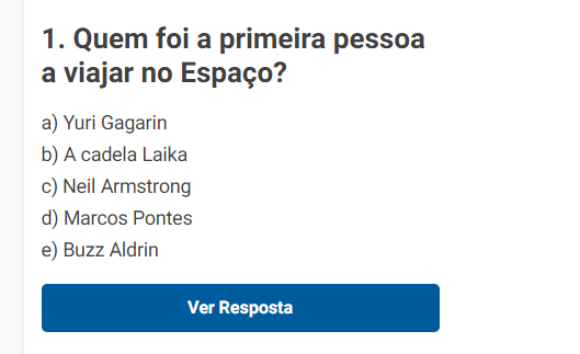 1. Quem foi a primeira pessoa a viajar no Espaço? a) Yuri Gagarin b) A cadela Laika c) Neil Armstrong d) Marcos Pontes e) Buzz Aldrin Ver Resposta