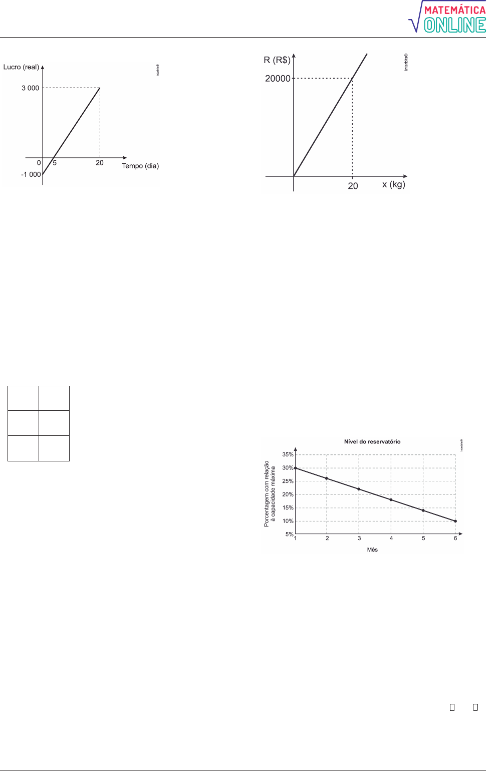 Alisson Marques-online 4 A representação algébrica do lucro (L) em função do tempo (t) é a) L(t) 20t 3.000 b) L(t) 20t 4.000 c) L(t) 200t d) L(t) 200t 1.000 e) L(t) 200t 3.000 15. (Upe-ssa 2 2016) Everton criou uma escala E de temperatura, com base na temperatura máxima e mínima de sua cidade durante determinado período. A correspondência entre a escala E e a escala Celsius (C) é a seguinte: E C 0 16 80 41 Em que temperatura, aproximadamente, ocorre a solidificação da água na escala E? a) 16 E b) 32 E c) 38 E d) 51 E e) 58 E 16. (Ucs 2016) O custo total C, em reais, de produção de x kg de certo produto é dado pela expressão C(x) 900x 50. O gráfico abaixo é o da receita R, em reais, obtida pelo fabricante, com a venda de x kg desse produto. Qual porcentagem da receita obtida com a venda de 1kg do produto é lucro? a) 5% b) 10% c) 12,5% d) 25% e) 50% 17. (Enem 2016) Um dos grandes desafios do Brasil é o gerenciamento dos seus recursos naturais, sobretudo os recursos hídricos. Existe uma demanda crescente por água e o risco de racionamento não pode ser descartado. O nível de água de um reservatório foi monitorado por um período, sendo o resultado mostrado no gráfico. Suponha que essa tendência linear observada no monitoramento se prolongue pelos próximos meses. Nas condições dadas, qual o tempo mínimo, após o sexto mês, para que o reservatório atinja o nível zero de sua capacidade? a) 2 meses e meio. b) 3 meses e meio. c) 1 mês e meio. d) 4 meses. e) 1 mês. 18. (G1 - ifal 2016) Os pontos de um plano cartesiano de coordenadas (2, 2) e (4, 2) pertencem ao gráfico de uma função f : , definida por f(x) ax b. Qual o valor de a b? a) 0. b) 2. c) 4. d) 6. e) 8.