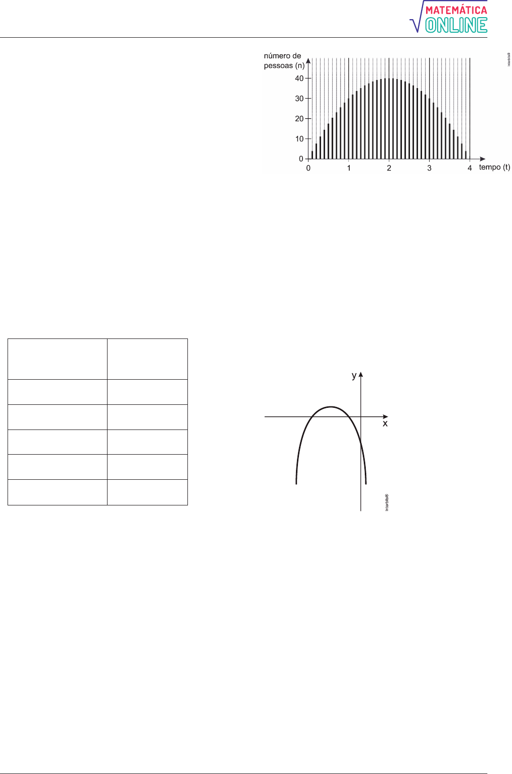 Alisson Marques-online 14 Dessa forma, a altura máxima atingida por esse corpo e o tempo em que permanece no ar, respectivamente, são a) 31,25 m e 2,5 s. b) 1,25 m e 2,5 s. c) 31,25 m e 1,25 s. d) 2,5 m e 1,25 s. 63. (Enem 2015) Um estudante está pesquisando o desenvolvimento de certo tipo de bactéria. Para essa pesquisa, ele utiliza uma estufa para armazenar as bactérias. A temperatura no interior dessa estufa, em graus Celsius, é dada pela expressão 2T(h) h 22h 85, em que h representa as horas do dia. Sabe-se que o número de bactérias é o maior possível quando a estufa atinge sua temperatura máxima e, nesse momento, ele deve retirá-las da estufa. A tabela associa intervalos de temperatura, em graus Celsius, com as classificações: muito baixa, baixa, média, alta e muito alta. Intervalos de temperatura ( C) Classificação T 0 Muito baixa 0 T 17 Baixa 17 T 30 Média 30 T 43 Alta T 43 Muito alta Quando o estudante obtém o maior número possível de bactérias, a temperatura no interior da estufa está classificada como a) muito baixa. b) baixa. c) média. d) alta. e) muito alta. 64. (Insper 2015) O número n de pessoas presentes em uma festa varia ao longo do tempo t de duração da festa, em horas, conforme mostra o gráfico a seguir. Das opções abaixo, aquela que melhor descreve a função n(t) é a) 2n(t) 10t 4t 50. b) 2n(t) 10t 40t 50. c) 2n(t) 10t 4t. d) 2n(t) t 40t. e) 2n(t) 10t 40t. 65. (Unifor 2014) Na figura abaixo, temos a representação geométrica do gráfico de uma parábola, cuja equação é 2y ax bx c. Para esta parábola representada no gráfico abaixo, os sinais dos produtos a b, a c e b c são, respectivamente a) negativo, negativo e positivo. b) negativo, positivo e negativo. c) negativo, negativo e negativo. d) positivo, positivo e positivo. e) positivo, negativo e negativo. 66. (Uea 2014) A figura mostra um quadrado de lado igual a 10 m. A região assinalada é constituída de dois quadrados que não se intersecionam e cujos lados medem x metros. A área da região não assinalada pode ser obtida pela lei 2A 100 2x .