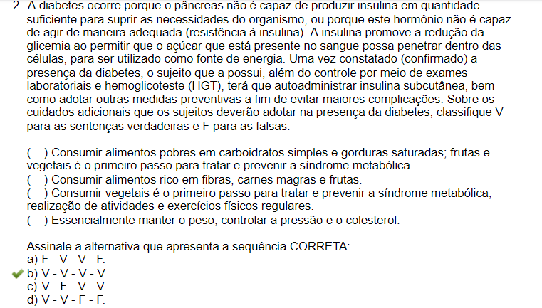 2. A diabetes ocorre porque o pâncreas não é capaz de produzir insulina em quantidade suficiente para suprir as necessidades do organismo, ou porque este hormônio não é capaz de agir de maneira adequada (resistência à insulina). A insulina promove a redução da glicemia ao permitir que o açúcar que está presente no sangue possa dentro das células, para ser utilizado como fonte de energia. Uma vez constatado (confirmado) a presença da diabetes, o sujeito que a possui, além do controle por meio de exames laboratoriais e hemoglicoteste (HGT), terá que autoadministrar insulina subcutânea, bem como adotar outras medidas preventivas a fim de evitar maiores complicações. Sobre os cuidados adicionais que os sujeitos deverão adotar na presença da diabetes, classifique V para as sentenças verdadeiras e F para as falsas: ( ) Consumir alimentos pobres em carboidratos simples e gorduras saturadas; frutas e vegetais é primeiro passo para tratar e prevenir a síndrome metabólica. ( ) Consumir alimentos rico em fibras, carnes magras e frutas. ( ) Consumir vegetais é o primeiro passo para tratar e prevenir a síndrome metabólica; realização de atividades e exercícios físicos regulares. ( ) Essencialmente manter o peso, controlar a pressão e o Assinale a alternativa que apresenta a sequência CORRETA: a) F V V F. b) c) d)