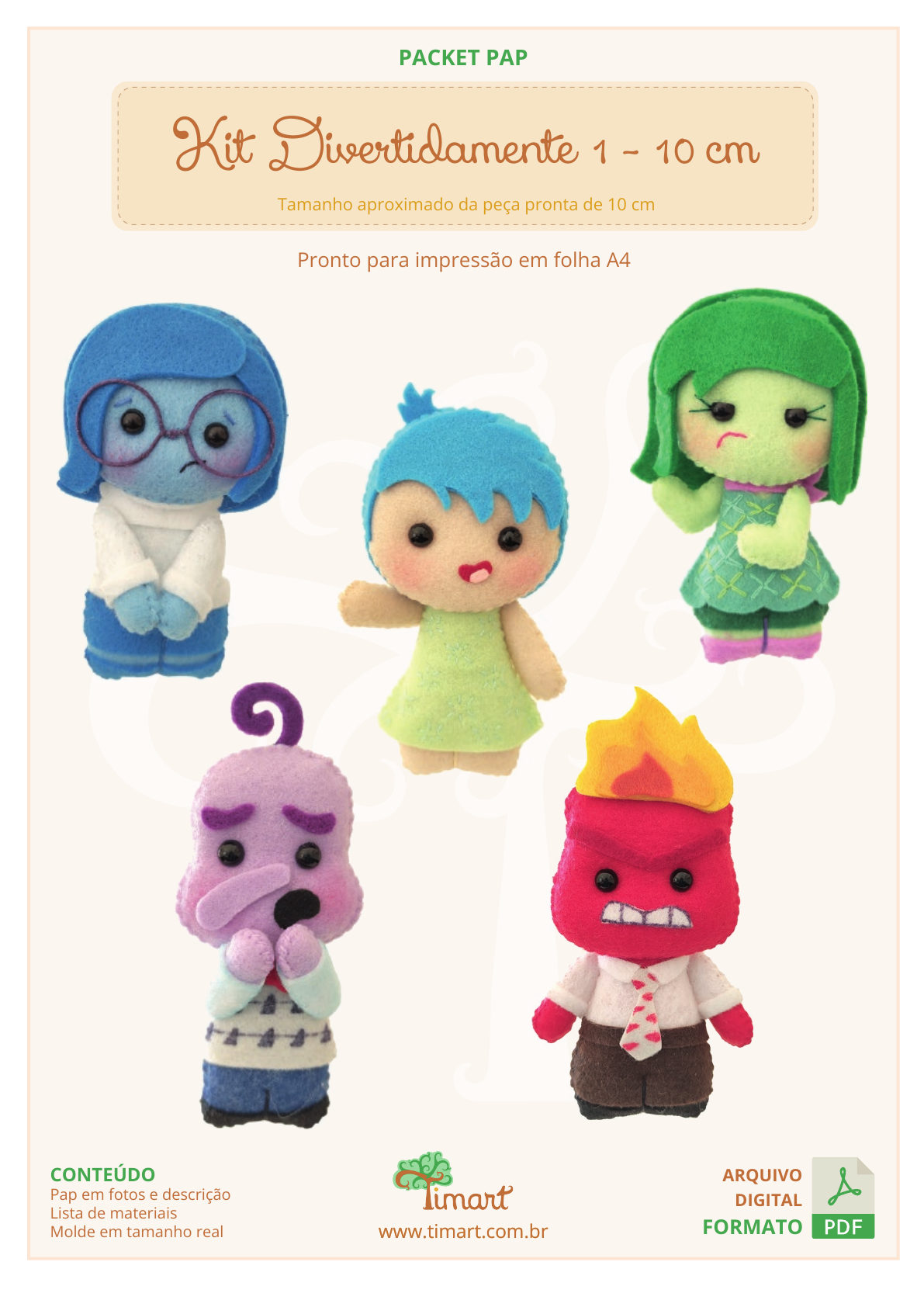 PACKET PAP Pronto para impressão em folha A4 www.timart.com.brwww.timart.com.br CONTEÚDO Pap em fotos e descrição Lista de materiais Molde em tamanho real ARQUIVO DIGITAL FORMATO Kit Divertidamente 1 - 10 cm Tamanho aproximado da peça pronta de 10 cm Licenciado apenas para Amanda Faria, amyrodrinny@gmail.com D obre aqui D ob re a qu i Alegria Cole atrás Cole atrás Tamanho aproximado da peça pronta: 10 cm www.timart.com.br PACKET PAP Passo a passo: Sugestão: Corte no local indicado pela tesoura, dobre e cole nas indicações, formando um envelope para guardar o seu molde. Arquivo protegido e Registrado. Proibida a reprodução, revenda, compartilhamento ou edição desta apostila em qualquer mídia digital ou física, tanto parcial quanto na íntegra, sob pena prevista na Lei de Direitos Autorais nº 9610. Cabeça 2x nude pele Lista de materiais Agulha de costura nº 7 / Linha bege, azul e verde / Enchimento / Cola quente e silicone / Feltro nude pele, azul santa fé light, verde água e vermelho coleira / Meia pérola preta 5 mm / Blush ou giz pastel oleoso vermelho / Tinta dimensional rosa Recorte o feltro nas cores e quantidades indicadas no molde. 1- Cole o cabelo na frente do rosto e atrás, deixando a nuca livre. 2- Costure e recheie a cabeça, afunde na marcação dos olhos com um ponto apertado. 3- Cole os olhos e a boca e marque as bochechas com o giz ou blush. 4- Duble a franja e o topete com cola de silicone. 5- Cole a franja no rosto e o topete na parte de trás da cabeça. Faça o detalhe da boca com a tinta. 6- Costure e encha os braços. 7- Faça o bordado da marcação do vestido com linha azul. Cole o vestido no corpo. 8- Una os corpos, costure e encha. Faça a marcação das perninhas. 9- Cole a cabeça no corpo e os braços na posição desejada. Veja o passo a passo no YouTube https://www.youtube.com/@feltropocket Braço 4x nude pele Corpo 2x nude pele Cabelo 1x azul santa fé light Cabelo 1x azul santa fé light Franja 1x azul santa fé light Topete 1x azul santa fé light 1x verm Vestido 2x verde água G uia de cores (Feltros Santa Fé): 79 91 23 219 Licenciado apenas para Amanda Faria, amyrodrinny@gmail.com D obre aqui D ob re a qu i Tristeza Cole atrás Cole atrás Tamanho aproximado da peça pronta: 10 cm www.timart.com.br PACKET PAP Passo a passo: Sugestão: Corte no local indicado pela tesoura, dobre e cole nas indicações, formando um envelope para guardar o seu molde. Arquivo protegido e Registrado. Proibida a reprodução, revenda, compartilhamento ou edição desta apostila em qualquer mídia digital ou física, tanto parcial quanto na íntegra, sob pena prevista na Lei de Direitos Autorais nº 9610. Cabeça 2x azul claro Lista de materiais Agulha de costura nº 7 / Linha azul clara e escura, branca e invisível / Enchimento / Cola quente e silicone / Feltro azul claro, oceano e branco / Meia pérola preta 5 mm / Blush ou giz pastel oleoso vermelho / Arame meia de seda roxo ou encapado branco / Caneta permanente de ponta extra �na preta Recorte o feltro nas cores e quantidades indicadas no molde. 1- Enrole o arame na parte superior do carretel de linha e torça o arame. Faça isso duas vezes e pinte com uma canetinha roxa, ou faça o óculos inteiro no arame roxo (pap no YouTube: https://www.youtube.com/@feltropocket ). 2- Cole as partes do cabelo no rosto. Marque as bochechas com o giz pastel e borde os cilios. Faça a boquinha com a caneta. 3- Costure e recheie a cabeça, afunde na marcação dos olhos com um ponto apertado. 4- Prenda o óculos na parte central dos olhos com linha invisível. 5- Cole a franja, a lateral do cabelo e a parte de trás do cabelo, deixando a nuca livre. 6- Cole as mangas nos braços. Costure e encha. Cole uma tira de feltro branco na base da manga, cortando o excedente. 7- Cole os sapatos, blusa e calça no corpo. 8- Una os corpos, costure e encha. Faça a marcação das perninhas. Cole uma tira branca na cintura e a gola. 9- Cole a cabeça os braços no corpinho, na posição desejada. Corpo 2x azul claro Sapato 2x azul oceano Cabelo frente 1x azul oceano Cabelo atrás 1x azul oceano Cabelo 1x azul oceanoBraço 4x azul claro Manga 4x branco Calça 2x azul oceano Blusa 2x branco Gola 2x branco Franja 2x azul oceano Cabelo 2x azul oceano G uia de cores (Feltros Santa Fé): 35 83 30 3x branco Licenciado apenas para Amanda Faria, amyrodrinny@gmail.com D obre aqui D ob re a qu i Medo Cole atrás Cole atrás Tamanho aproximado da peça pronta: 10 cm www.timart.com.br PACKET PAP Passo a passo: Sugestão: Corte no local indicado pela tesoura, dobre e cole nas indicações, formando um envelope para guardar o seu molde. Arquivo protegido e Registrado. Proibida a reprodução, revenda, compartilhamento ou edição desta apostila em qualquer mídia digital ou física, tanto parcial quanto na íntegra, sob pena prevista na Lei de Direitos Autorais nº 9610. Cabeça 2x blueberry Lista de materiais Agulha de costura nº 7 / Linha lilás, branca, azul clara e escura, preta / Enchimento / Cola quente e silicone / Feltro blueberry, roxo, preto, cinza neve, azul baby, azul escuro mescla, vermelho noel / Meia pérola preta 5 mm / Caneta permanente de ponta extra �na preta / Giz pastel oleoso vermelho ou blush Recorte o feltro nas cores e quantidades indicadas no molde. 1- Duble o cabelinho e o nariz com cola de silicone 2- Costure e encha a cabeça e afunde na marcação dos olhos com um ponto apertado. 3- Marque as bochechas com o giz pastel e pincel macio. 4- Cole os olhos,sobrancelhas, nariz e a boca. Cole o cabelinho por trás. 5- Cole as mangas nos braços, costure e encha. 6- Faça a estampa do colete com a caneta preta. 7- Cole os sapatos, a gola da blusa e o colete no corpo. Una os corpos, costure encha. Faça a marcação das perninhas. 8- Cole a cabeça no corpo e a gravata. 9- Cole os braços no corpinho, na posição desejada. Veja o passo a passo no YouTube https://www.youtube.com/@feltropocket Corpo 2x azul escuro mes