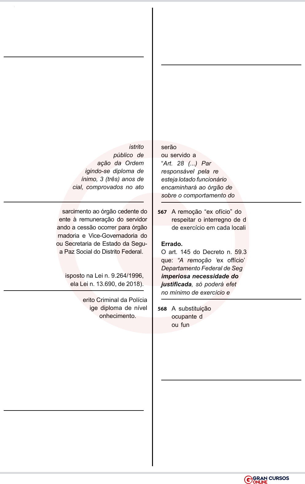 128Cargo: Agente e Escrivão QUESTÕES INÉDITAS PARA A PCDF – 2019 A suspensão preventiva não excederá 90 dias, salvo nas faltas em que a pena aplicável seja de demissão, hipótese em que poderá ser afastado do exercício de seu cargo em qualquer fase do processo disciplinar até a decisão final (parágrafo único do art. 393 do Decreto n. 59.310/1966). 562 Juvenal da Silva, bacharel em Direito, foi aprova- do em concurso público de provas e títulos para o cargo de Delegado de Polícia da PCDF. De acordo com a legislação de regência do cargo, Juvenal precisará comprovar, ainda, no mínimo, três anos de atividade jurídica ou policial no ato de sua posse. Certo. Conforme Lei n. 9.264/96, art. 5º, § 1º: “O ingresso na Carreira de Delegado de Polícia do Distrito Federal dar-se-á mediante concurso público de provas e títulos, com a participação da Ordem dos Advogados do Brasil, exigindo-se diploma de Bacharel em Direito e, no mínimo, 3 (três) anos de atividade jurídica ou policial, comprovados no ato da posse.” 563 É obrigatório o ressarcimento ao órgão cedente do valor correspondente à remuneração do servidor cedido, salvo quando a cessão ocorrer para órgão da União, Governadoria e Vice-Governadoria do Distrito Federal ou Secretaria de Estado da Segu- rança Pública e da Paz Social do Distrito Federal. Certo. Transcrição literal do disposto na Lei n. 9.264/1996, art. 12-B, § 2º (Incluído pela Lei n. 13.690, de 2018). 564 O ingresso no cargo de Perito Criminal da Polícia Civil do Distrito Federal exige diploma de nível superior em qualquer área do conhecimento. Errado. Os candidatos ao cargo de Perito Criminal da PCDF precisam comprovar formação de nível superior em áreas específicas, relacionadas na Lei n. 9.264/1996, art. 5º, § 2º: “Será exigido para o ingresso na Carreira de Perito Criminal da Polícia Civil do Distrito Federal o diploma de Física, Química, Ciências Biológicas, Ciências Contábeis, Ciência da Computação, Informática, Geologia, Odontologia, Farmácia, Bioquímica, Mineralogia e Engenharia.” 565 De acordo com o que estabelece o Decreto n. 59.310/1966, é requisito para matrícula na Aca- demia Nacional de Polícia, dentre outros, possuir temperamento adequado ao exercício da função policial, apurado em exame psicotécnico realiza- do pela ANP. Certo. Conforme art. 9º, VII, do Decreto n. 59.310/1966: “Art 9º São requisitos para matrícula na Academia Nacional de Polícia: (...) VII - possuir temperamento adequado ao exercício da função policial, apurado em exame psicotécnico realizado pela Academia Nacional de Polícia.” 566 Trimestralmente, o responsável pela repartição ou serviço em que esteja lotado funcionário sujei- to a estágio probatório encaminhará ao órgão de pessoal relatório sucinto sobre o comportamento do estagiário. Errado. O parágrafo único do art. 28 do Decreto n. 59.310/1966 estabelece que os relatórios sucintos serão entregues pelo responsável pela repartição ou servido ao órgão de pessoal MENSALMENTE: “Art. 28 (...) Parágrafo único. Mensalmente, o responsável pela repartição ou serviço, em que esteja lotado funcionário sujeito a estágio probatório, encaminhará ao órgão de pessoal relatório sucinto sobre o comportamento do estagiário.” 567 A remoção “ex ofício” do servidor deve sempre respeitar o interregno de dois anos, no mínimo, de exercício em cada localidade. Errado. O art. 145 do Decreto n. 59.310/1966 estabelece que: “A remoção ‘ex offício’ de funcionário do Departamento Federal de Segurança Pública, salvo imperiosa necessidade do serviço devidamente justificada, só poderá efetivar-se após dois anos, no mínimo de exercício em cada localidade.” 568 A substituição automática, no impedimento de ocupante de cargo de provimento em comissão ou função gratificada, será sempre remunerada por todo o período de substituição. Errado. “§ 1º A substituição automática será gratuita; quando, porém, exceder de trinta dias, será remunerada e por todo o período.” 569 Remoção é a elevação do funcionário à classe imediatamente superior àquela a que pertence, na respectiva série de classes. Errado. O item misturou os conceitos de “remoção” e “promoção”, estabelecidos no texto do Decreto n. 59.310/1966: 129Cargo: Agente e Escrivão QUESTÕES INÉDITAS PARA A PCDF – 2019 “Art 137. Remoção é o ato mediante o qual o funcionário passa a ter exercício em outro serviço, preenchendo claro de lotação, sem que se modifique sua situação funcional.” “Art 30. Promoção é a elevação do funcionário à classe imediatamente superior àquela a que pertence, na respectiva série de classes.” No que se refere ao regime jurídico peculiar dos fun- cionários policiais civis da União e do Distrito Federal (DF) e ao desmembramento e reorganização da car- reira policial civil do DF, julgue os itens subsequentes. 570 Atualmente, a PCDF é composta por duas carrei- ras: a Carreira de Polícia Civil do Distrito Federal (composta dos cargos de Escrivão de Polícia, Papiloscopista Policial, Agente de Polícia e Agen- te Policial de Custódia) e a Carreira de Autorida- des Superiores da PCDF (composta dos cargos de Delegado de Polícia, Perito Criminal e Perito Médico-Legista). Errado. Atualmente, a PCDF é composta pelas seguintes carreiras: Carreira de Delegado de Polícia do Distrito Federal e Carreira de Polícia Civil do Distrito Federal (art. 1º da Lei n. 9.264/1996). Não existe a “Carreira de Autoridades Superiores da PCDF”. 571 Poderá ser autorizada a cessão do servidor da PCDF à Presidência da República para exercício de cargo em comissão ou função de confiança, ainda que o servidor não tenha cumprido estágio probatório. Errado. É vedada a cessão de servidor que não tenha cumprido o estágio probatório (art. 12-B, § 1º, da Lei n. 9.264/1996
