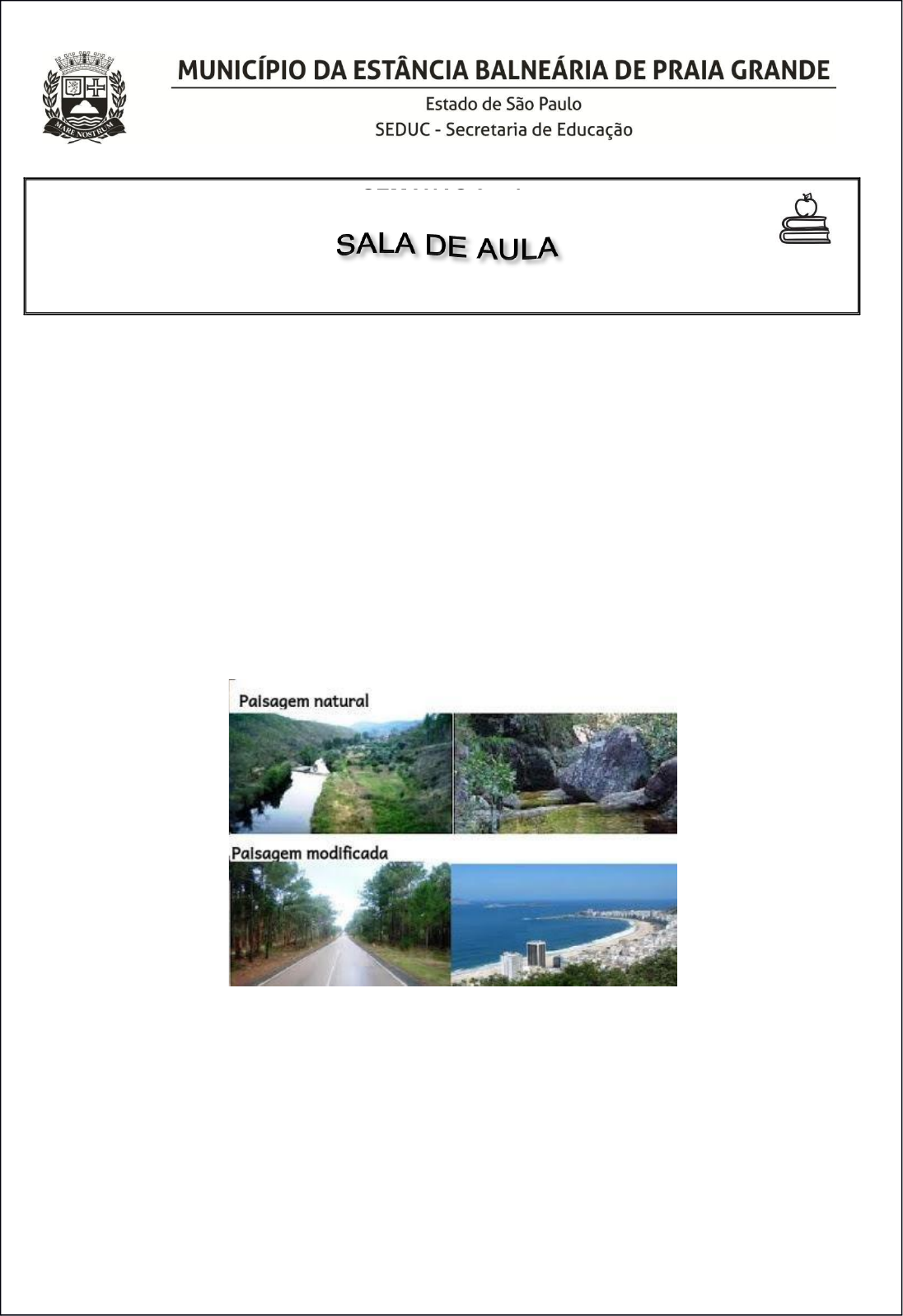 PAISAGEM NATURAL E PAISAGEM MODIFICADA Inicialmente é importante conceituarmos. O que é paisagem? Paisagem é uma porção do espaço que nossa vista alcança. Quando captamos as imagens e fixamos nosso olhar em uma determinada direção, estamos registrando uma espécie de retrato da realidade presente, com seus detalhes, sejam naturais ou criados pela ação do homem. As paisagens se dividem em duas: Paisagem natural – nela, não percebemos qualquer tipo de alteração pela ação antrópica, quer dizer, do trabalho humano (a paisagem abaixo possui apenas elementos naturais). Paisagem modificada, ou artificial, ou cultural, ou geográfica ou também chamada de paisagem antrópica - é aquela que registra o trabalho humano, ou ação do homem, ou ação antrópica (na paisagem modificada abaixo temos elementos antrópicos, como casas, pontes e prédios). Uma paisagem natural é cada vez mais difícil de ver, pois a ação do homem transforma a superfície terrestre, que antes era natural e depois passou a ser geográfica, na busca incessante de melhores condições de vida e conforto. Após o preparo da terra para a agricultura, após a retirada de árvores para a construção de casas, a paisagem natural anterior foi transformada pela paisagem antrópica, pelo trabalho e pela ação do homem. Por que a Paisagem Natural é Transformada ou Modificada pela Paisagem Antrópica ou Geográfica? As sociedades humanas cresceram e se desenvolveram ocupando quase todas as regiões do planeta, e mesmo nas áreas anecúmenas (onde as severas condições naturais impedem que sejam habitadas) muitos traços da ação antrópica estão presentes, ainda que não sejam SEMANAS 4 e 3 Disciplina: Geografia 5 ª série do Ensino Fundamental - EJA SEMANAS 2 E 3 - 2º SEMESTRE 2021 visíveis, deixando de serem naturais, como por causa das alterações climáticas ou pela disseminação de contaminantes ou poluição por resíduos como o lixo. A intenção da alteração da paisagem natural pela antrópica não é um mero capricho ou demonstração de poder por parte dos seres humanos, mas sim com o objetivo da luta pela vida, onde é fundamental fixar moradia, produzir alimentos e trabalhar para conquistar mais conforto e segurança. http:geografianewtonnalmeida.blogsp.com.br EXERCÍCIOS 1. O que podemos encontrar no ambiente natural? (A) Plantas, terra, ar e água. (B) Prédios. (C) Sítios, fazendas e lojas. (D) Comércios, ruas e avenidas. 2. De acordo com o texto, paisagem natural é: (A) O movimento de pessoas e veículos. (B) É tudo que podemos ver em um só lugar. (C) É aquilo que vem da natureza, sem interferência das mãos humanas. (D) É tudo que o homem constrói. 3. São exemplos de elementos criados pelo homem: (A) Construções, ruas, avenidas. (B) Sol, mar, rios. (C) Árvores, flores, frutos. (D) As florestas. 4. Para construir as cidades e viver nelas, o ser humano transforma. (A) A paisagem. (B) As plantas. (C) As vegetações. (D) As lavouras. De acordo com as informações da atividade acima, responda: 1. Observe as imagens abaixo, e escreva nos parênteses, a qual tipo de paisagem se refere. Se é natural ou antrópica (modificada pelo homem). 1 ( ) 2 ( ) 3 ( ) 4 ( ) 2. Relacione uma lista de elementos encontrados somente na paisagem natural. 3. Relacione uma lista de elementos encontrados nas paisagens transformadas. 4. Por que as regiões totalmente naturais estão tão modificadas atualmente? 5. O que a imagem abaixo revela sobre a atuação do homem na natureza? Praia da ilha Henderson, área desabitada no oceano Pacífico com grande densidade de lixo trazido pelas correntes oceânicas (2015). SEMANAS 3 e 4 Disciplina: Geografia 5 ª série do Ensino Fundamental - EJA SEMANAS 2 E 3 - 2º SEMESTRE 2021