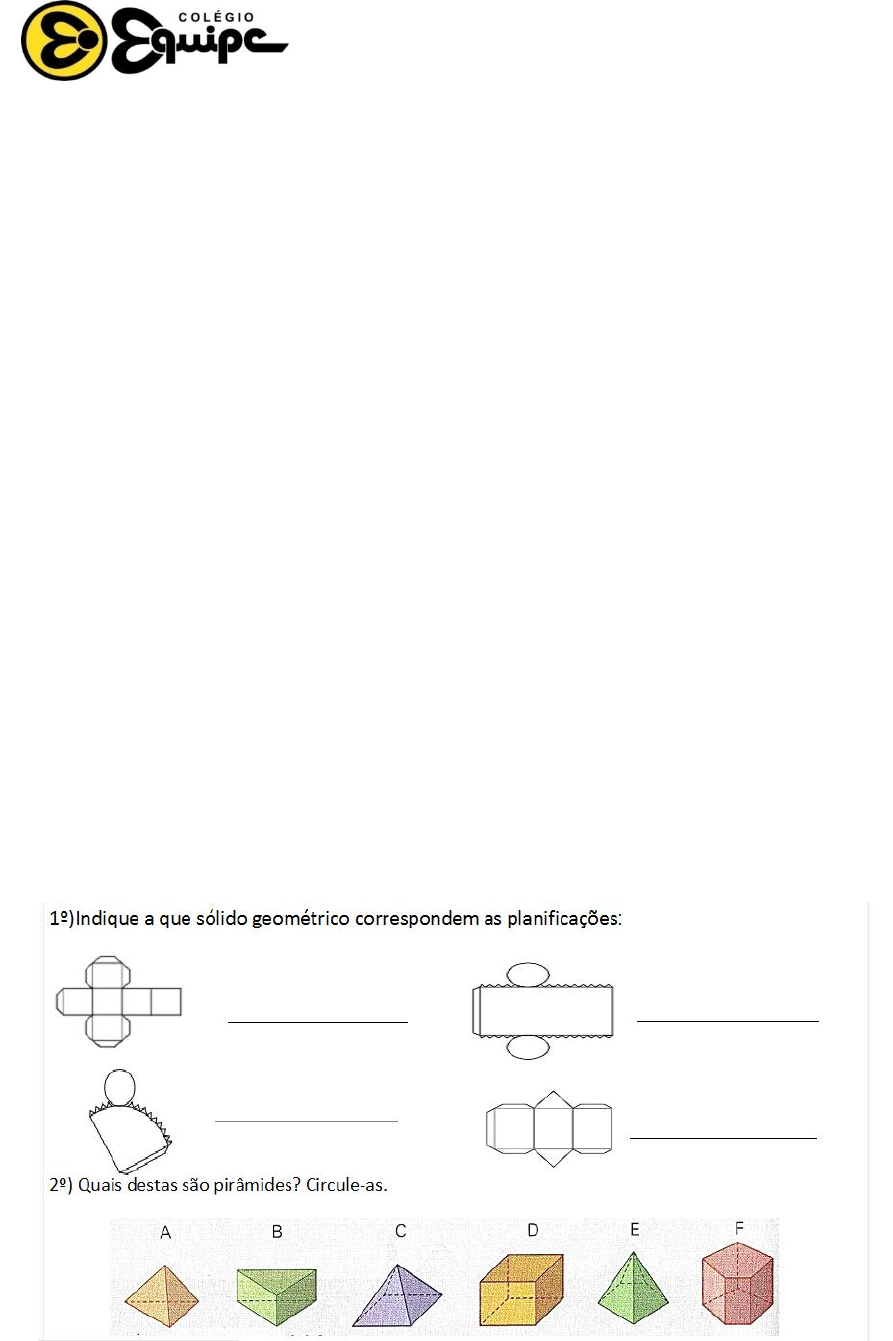 Lista 6 ano Teorema de Euler Válido somente para os Polígonos Regulares, o teorema desenvolvido pelo matemático Euler relaciona os três principais componentes dos poliedros: as faces, os lados e os vértices. V + F = A + 2 No qual: V = número de vértices F = número de faces A = número de arestas A partir dessa pequena equação poderemos resolver diversos problemas que englobem o tema dos poliedros Exercícios: 1. .Num poliedro convexo, o número de faces é 8 e o número de arestas é 12. Qual é o número de vértices desse poliedro? (Use:V + F = A + 2) 2. Num poliedro convexo, o número de faces é 8 e o número de vértices é 12. Calcular o número de arestas.( Use: A + 2 = V + F ) 3. Um poliedro possui 16 faces e 18 vértices. Qual é o número de arestas desse poliedro? 2. Responda: Resolva: 1. Um sólido geométrico tem 6 faces e 6 vértices. Trata-se de: a) Prisma de base triangular. b) Prisma de base quadrada. c) Pirâmide de base pentagonal. d) Pirâmide de base hexagonal. 2. Observe os diferentes tipos de caixas utilizadas por uma loja de presentes: A vendedora monta a caixa de acordo com a escolha do cliente. Se ela utilizar os modelos que aparecem abaixo, vai obter caixas do tipo: a) 1 e 4 b) 3 e 4 c) 2 e 3 d) 1 e 2 3. Observe os sólidos abaixo. Qual dos sólidos representados: a) Tem 10 arestas? b) Tem por base um pentágono? c) Tem superfície lateral curva? d) Tem duas bases triangulares? Teorema de Euler