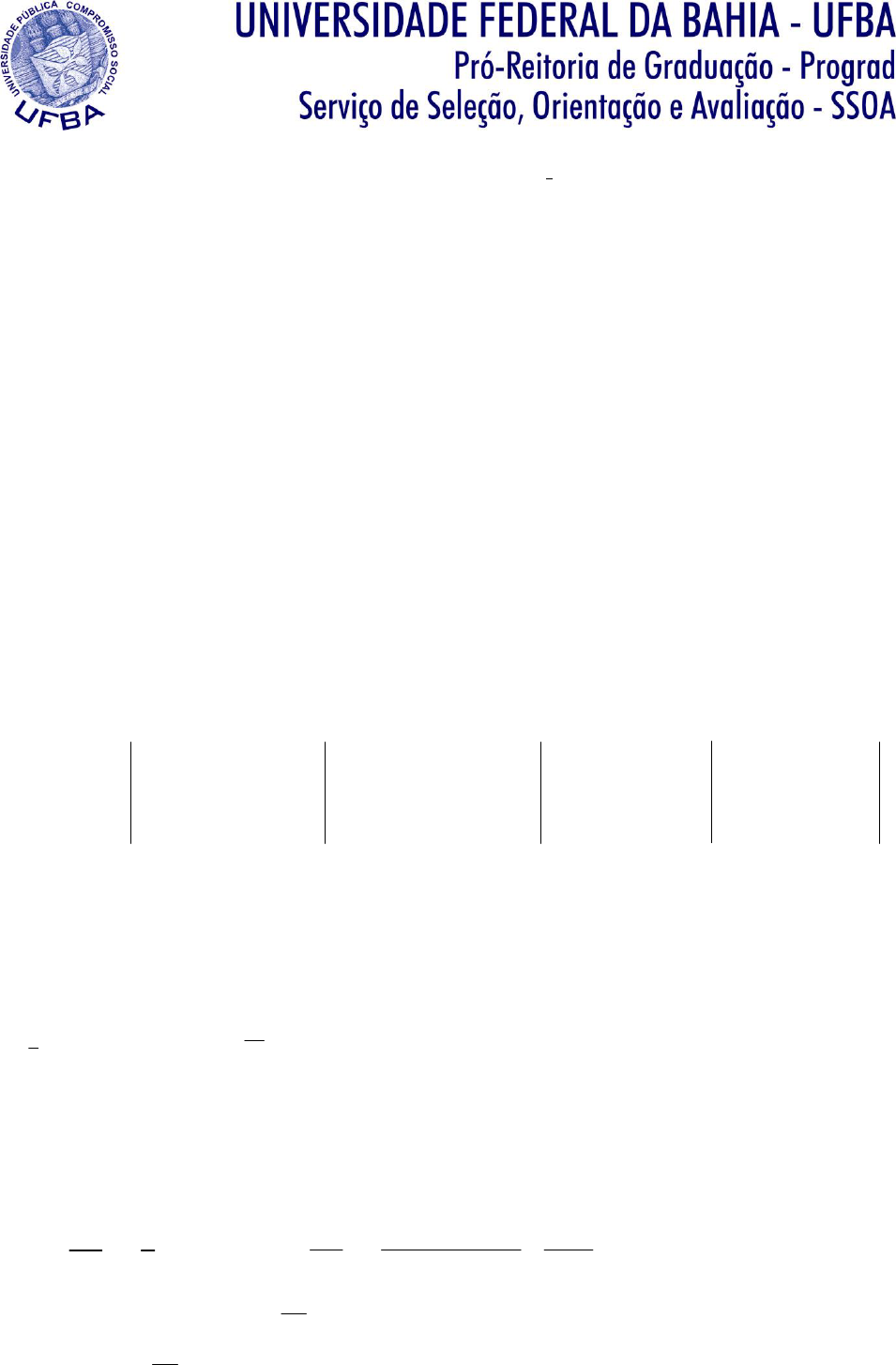 Vestibular 2010 — 2a fase Gabarito — Matemática Questão 01 (Valor: 15 pontos) Considerando-se Li a soma dos termos da linha i , Cj a soma dos termos da coluna j, Dp a soma dos termos da diagonal principal e Ds a soma dos termos da diagonal secundária, tem-se L1 = ( – 2 x + 3) + ( z + 9 ) + ( x + 2y + 1) = – x + 2y + z + 13 L2 = ( x + y + 2 ) + ( – y + 8) + ( – x + 8 ) = 18 L3 = ( – 4z + 5 ) + ( y – z + 1 )+ ( – x + z + 4) = – x + y – 4z + 10 C1 = ( – 2 x + 3) + ( x + y + 2) + ( – 4z + 5 ) = – x + y – 4z + 10 C2 = ( z + 9 ) + ( – y + 8) + ( y – z + 1) = 18 C3 = ( x + 2y + 1) + ( – x + 8 ) + ( – x + z + 4) = – x + 2y + z + 13 Dp = ( – 2 x + 3) + ( – y + 8) + ( – x + z + 4) = –3 x – y + z + 15 DS = ( – 4z + 5 ) + ( – y + 8) + ( x + 2y + 1) = x + y – 4z + 14 Levando-se em conta que as expressões obtidas para L1 e C3, assim como as expressões obtidas para L3 e C1, são iguais, o sistema pedido pode ser reduzido a um máximo de quatro equações. Além disso, todas as somas devem ser iguais e, como, L2 = C2 = 18, tem-se =−+ =+−− =−+− =++− ⇒ =+−+ =++−− =+−+− =+++− 44zyx 3zy3x 84zyx 5z2yx 18144zyx 1815zy3x 18104zyx 1813z2yx Resolvendo o sistema por escalonamento, tem-se − − →− − − → − − −− −− → − −−− −− − → − −− −− − 0000 1100 2010 2001 0000 1100 3510 11901 181800 333300 3510 11901 9330 12270 3510 5121 4411 3113 8411 5121 Assim, x = – 2, y = 2 , z = – 1. Questão 02 (Valor: 15 pontos) • Cálculo do vértice da parábola A abscissa do vértice é a solução da equação ( ) ( ) .3x224422 1 42242log 3xx2xx2 1 =⇒=⇒=−⇒=−⇒−=− − Assim, a parábola tem vértice no ponto V = ( 3, – 2 ). • Cálculo dos coeficientes a1 , a2 e a3 Sendo r a razão da P.G., tem-se f(x) = a1 x2 + (a1 r)x + (a1 r2) e, como as coordenadas do vértice em função dos coeficientes são dadas por 1 V 1 a r rx 3 2a 2 = − = − = e ( )2 2 2 2 21 1 1V 1 1 a r 4a r 3a ry 2 4a 4a 4 −∆= − = − = = − , conclui-se que r 6= − e 1 2a 27= − . Logo a6 = a1r5 = 5766)(27 2 5 =−− . . Questão 03 (Valor: 15 pontos) • Cálculo de z1 + + + ==⇒+= 3 2 π2kπ isen3 2 π2kπ cos88iz)2 πisen2 π8(cos8i 33 , para k = 0, 1 e 2 ( ) i36πisen6πcos2z0k +=+=⇒= ( ) i365πisen65πcos2z1k +−=+=⇒= ( ) 2i23πisen23πcos2z2k −=+=⇒= Assim, 1z 3 i= − + . • Cálculo de z2 z2 é uma solução da equação biquadrada x4 + x2 – 12 = 0. Usando-se a mudança de variável x2 = y, obtém-se a equação y2 + y – 12 = 0 que tem raízes y = –4 e y = 3. Para y = –4 conclui-se que i2x ±= e para y = 3 conclui-se que 3x ±= . Uma vez que z2 é uma solução complexa, com parte imaginária positiva, 2z 2i= ( ) 232i23i2i232i32i2i i33zzz3 221 +−=−+−=−+−=+ Logo, . 1 =+=− 4 1 4 3 2 i 2 3 Questão 04 (Valor: 15 pontos) • Cálculo de g(x) 0 x x f x 1 cos x 1 cos x.cos senx.sen 1 senx 2 2 2 2 2 2 2 π π π π π π π • ≤ < ⇒ ≤ + < π⇒ + = + + = + − = − 2 πx0 senx,2g(x) Logo, ≤≤−= • No intervalo dado, f(x) = sen x e g(x) = 2 – sen x, logo a equação a ser resolvida é 0,4 7senx)(2xsen2 =−−+ isto é, 0.4 1senx)xsen2 =+− ( ) [ [ . , 6 xe2 0, x,21senx021senx Assim, 2 ππ =∈=⇒=− Questão 05 (Valor: 20 pontos) CBA ∩∩ corresponde à região hachurada ao lado e para o cálculo da área pode ser dividida em três regiões. • Dois setores circulares do círculo de raio igual a 2, de mesma área, limitados pelas retas x3y = , x3y −= e pelo eixo Ox. A reta x3y = tem coeficiente angular igual a θ= tg3 , sendo θ o ângulo que a reta faz com o eixo Ox. Assim, rd 3 60 π==θ o e a área do setor circular é u.a.323421r21A 2 1 ππθ === • Dois setores circulares do círculo de raio igual a 2, de mesma área, limitados pelas retas que passam pela origem e pelos pontos de intersecção da circunferência com a reta 2y −= . Resolvendo o sistema −= =+ 2y 4yx 22 obtém-se 42x 2 =+ e portanto 2x ±= Assim, os pontos de intersecção são )2,2(P1 −−= e 2P ( 2, 2)= − e estão sobre as retas y = x e y = – x. A área do setor circular formado pela reta y = −x, o círculo de raio 2 e o eixo Ox é, portanto, u.a.2442 1r2 1A 22 ππθ === • O triângulo com vértices na origem e nos pontos de intersecção do círculo com a reta 2y −= . Esse triângulo com vértices na origem e nos pontos P1 e P2 tem base igual a 22 u.c. e altura 2 u.c. Logo área A3 = 2 u.a. A área da região limitada por CBA ∩∩ é, portanto, u.a.3 7623 4A2A2A 321 πππ +=++=++ Questão 06 (Valor: 20 pontos) A pirâmide está inscrita em um cilindro circular reto de volume igual a 24πcm3 e área de cada base igual a 4πcm2. Uma vez que o volume de um cilindro circular reto é dado por hrV 2π= , sendo r o raio da base e h a altura, conclui-se que r = 2cm e h = 6cm. A base da pirâmide é um triângulo inscrito em um círculo de raio r = 2cm. Sendo H a altura do triângulo e L o lado, tem-se H3 22 = e 1cm.22H31a === Assim: ( ) ( ) 144L22L 22 2222 −=⇒=+ cm32L 12L2 =⇒= O triângulo inscrito tem lado 32L = cm, altura H = 3cm e área igual a 33 cm2. Uma vez que a altura da pirâmide é a mesma do cilindro, h = 6cm, o volume da pirâmide é 6 333 1 V1 ..= , portanto, .31 cm 36V = A pirâmide menor obtida pela secção por um plano paralelo à base, situado a uma distância de 2cm do vértice, tem altura igual a 2cm e volume V2. Uma vez que a pirâmide maior e a menor são semelhantes, a razão entre seus volumes é o cubo da razão entre suas alturas, portanto, ( ) .932273627VV272 6 VV 12321 ===⇒== Logo, o volume do tronco de pirâmide é 9 352 9 3236VV 21 =−=− cm3. Obs.: Outras abordagens poderão ser aceitas, desde que sejam pertinentes. Salvador, 13 de dezembro de 2009 Antonia Elisa Caló de Oliveira Lopes Diretora do SSOA/UFBA 2 L r r a