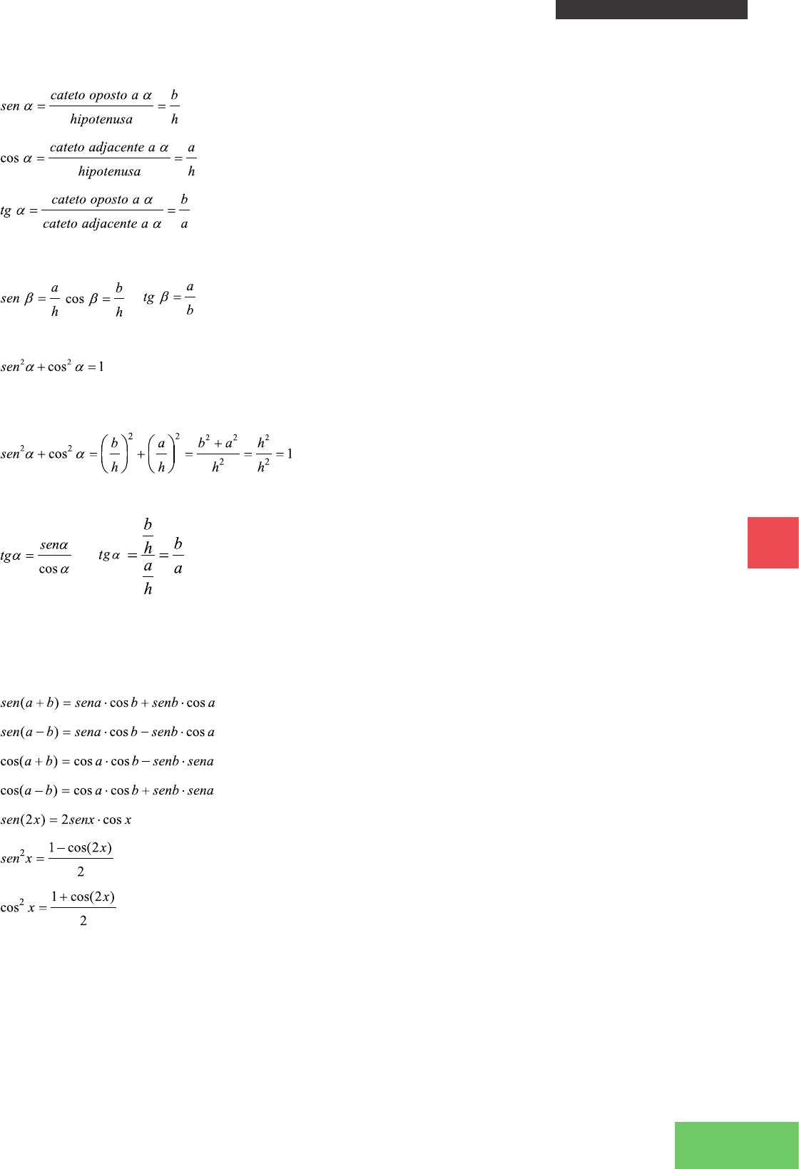 77 II - FUNÇÕES E SEUS GRÁFICOS MATEMÁTICA BÁSICA MBAutor: Rodrigo Nogueira de Codes As relações que definem seno, cosseno e tangente do ângulo agudoα são escritas da seguinte forma: Analogamente, para o ângulo β , tem-se as seguintes relações: , e Uma relação trigonométrica muito importante é a relação fundamental, dada por Substituindo os valores de seno e cosseno deα na relação fundamental de acordo com o triângulo retân- gulo da Figura 2.42 e usando o teorema de Pitágoras, tem-se que: Além do mais, a tangente pode também ser escrita como ou Seno, cosseno e tangente também são chamados razões trigonométricas por serem razões entre números que expressam as medidas dos lados dos triângulos. São grandezas adimensionais, pois são razões entre dois lados do mesmo triângulo. Porém, as medidas dos lados devem estar na mesma unidade de medida. As seguintes relações são muito importantes na trigonometria e nas posteriores disciplinas de Cálculo: