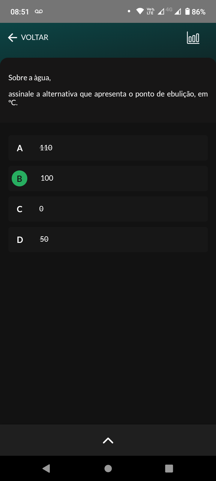 08:51 4G LTE 86% VOLTAR Sobre a àgua, assinale a alternativa que apresenta ponto de ebulição, em °C. A 110 B 100 O D 50