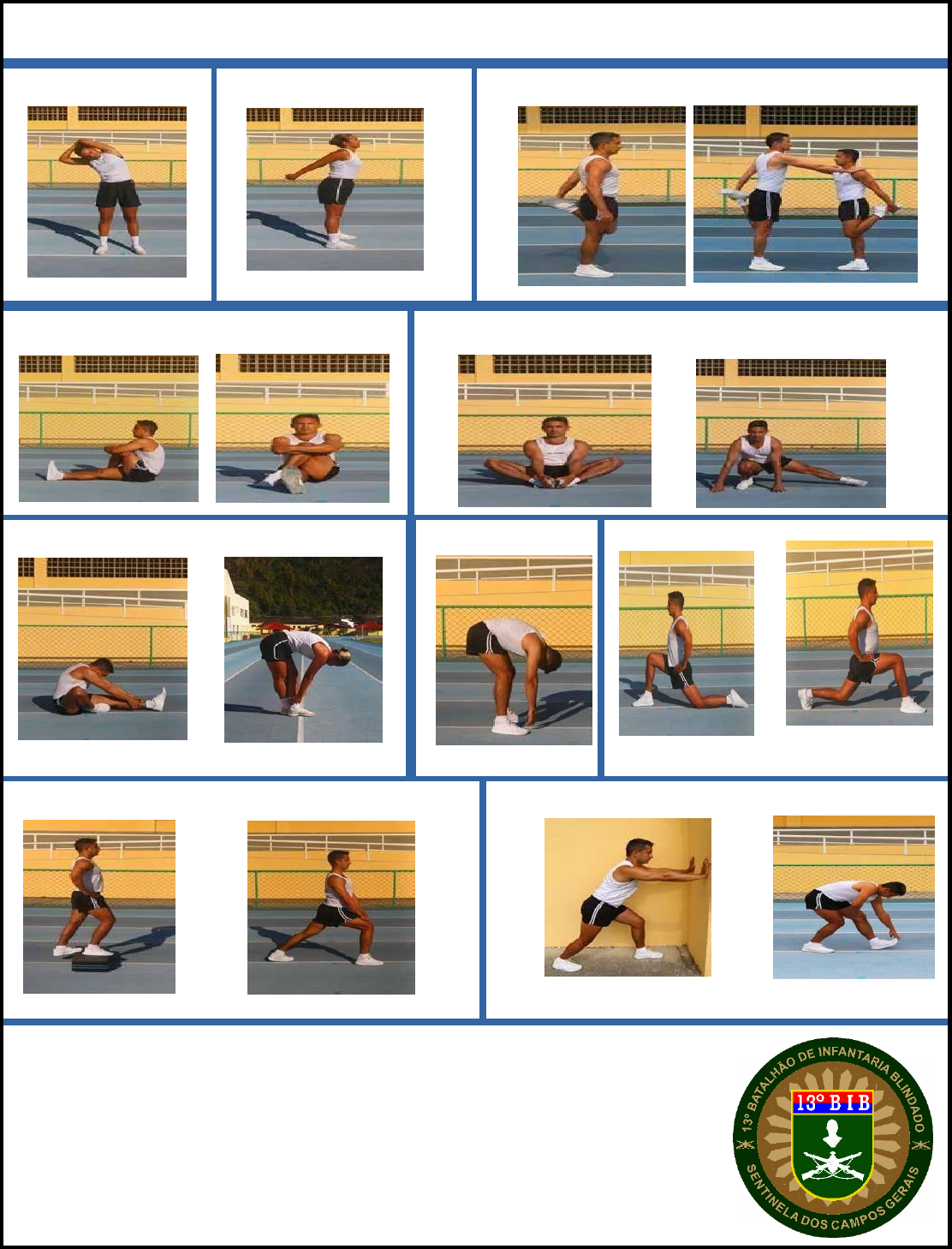 ALONGAMENTO 1) Dorsal 2) Peitoral 3) Anterior da coxa (Saci) 4) Glúteos 5) Adutores ou 6) Posterior da coxa ou 7) Lombar 8) Iliopsoas ou Joelho não encosta no chão 9) Gastrocnêmio ou 10) Sóleo ou Essa fase terá uma duração de aproximadamente 5 min. Os exercícios serão executados por imitação ao guia e deverão ser observados os seguintes itens: a) alongar a musculatura de uma forma lenta e gradual até chegar ao ponto de leve desconforto; b) não fazer balanceios, pois, sempre que se estirar em excesso, haverá uma ação contrária, um reflexo de contração, gerando encurtamento da musculatura, diminuindo, assim, a efetividade do exercício de alongamento; c) permanecer, pelo menos, 30 s em cada posição; e d) respirar naturalmente. AQUECIMENTO DINÂMICO 1) Corrida com circundução dos braços 2) Adução e abdução dos braços na horizontal 3) Extensão alternada dos braços na vertical 4) Polichinelo 5) Corrida com torção do tronco 6) Corrida lateral 7) Corrida com extensão da perna a frente 8) Corrida com elevação dos calcanhares 9) Corrida com elevação dos joelhos 4.3.2.2.1 Após a apresentação da tropa ao comandante, esse ajustará o dispositivo de acordo com seu efetivo e o espaço disponível e designará o guia da sessão de TFM. Em seguida, será dado o comando de “CORRENDO CURTO!”, com o guia à frente do grupamento. Antes de começar os exercícios, a tropa correrá de forma lenta de 2 a 3 minutos, dependendo da temperatura Ambiente. 4.3.2.2.2 O guia segue à testa do grupamento, anuncia os exercícios a serem realizados e, imediatamente, os executa. A distância entre os militares deverá ser suficiente para possibilitar a execução correta do movimento. A tropa repete os movimentos executados pelo guia, sem contagem. Após cada exercício, a tropa, por imitação do guia, retornará à corrida lenta antes de passar para o próximo. AQUECIMENTO ESTÁTICO 1) Circundução dos braços 2) Flexão de braços 3) Agachamento alternado 4) Abd supra 5) Abd cruzado 6) Polichinelo Execução dos exercícios – o guia comanda: “POSIÇÃO INICIAL!” e toma a posição de sentido. A tropa imita o guia. A partir desse momento, o guia anuncia o exercício e a tropa repete os movimentos executados pelo guia após o término da contagem. Nos exercícios unilaterais a tropa inicia pelo seu lado esquerdo, dessa forma, o guia deverá iniciar pelo lado direito. CIRCUITO OPERACIONAL 1) Rosca bíceps com mochila 2) Bombeiro 3) Arremesso de Medicini Ball 4) Corrida com cabo solteiro 5) Arremesso de pneu 6) Tríceps com mochila 7) Agachamento com mochila 8) Abd supra com sobrecarga 9) Transporte de cunhete em dupla 10) Lanços em Zigue-Zague A carga de trabalho no circuito é determinada pelo: a) tempo de execução de cada exercício; b) número de passagens; e c) peso dos implementos utilizados. A carga inicial de trabalho deverá ser de: a) quarenta e cinco segundos por exercício; e b) duas passagens. GINÁSTICA BÁSICA 1) Parada do apoio de frente 2) Flexão de braços 3) Tesoura 4) Agachamento 5) Sugado 6) Agachamento unilateral 7) Abd supra 8) Elevação pélvica 9) Abd infra 10) Polichinelo 7.2.3.2 Procedimentos: a) antes da ginástica básica, deve ser realizado o aquecimento dinâmico; b) em seguida, realizar-se-á a abertura do dispositivo de forma semelhante ao descrito no aquecimento estático; c) recomenda-se a contagem alternada entre o guia e os executantes, visando a dar maior ritmo e atratividade à sessão. d) a tomada de posição para cada exercício será feita partindo-se da posição final do exercício anterior; e e) os exercícios realizar-se-ão na cadência lenta para que todos os movimentos sejam executados com segurança e menor risco de lesão. PTC 1) Flexão na barra fixa Intervalo ativo: Corrida estacionária 2) Escada ou caixote com barra Intervalo ativo: Polichinelo 3) Elevação pélvica unilateral Apoio do pé esquerdo Intervalo ativo: Pular corda 4) Remada vertical Intervalo ativo: Corrida estacionária 5) Agachamento com a barra (sumô) Intervalo ativo: Polichinelo 6) Desenvolvimento com a barra Intervalo ativo: Pular corda 7) Agachamento com a barra Intervalo ativo: Corrida estacionária 8) Elevação pélvica unilateral Apoio do pé direito Intervalo ativo: Polichinelo 9) Supino com a barra Intervalo ativo: Pular corda 10) Abd Infra Intervalo ativo: Corrida estacionária A carga de trabalho na PTC é determinada pelo: a) peso da carga externa e número de repetições máximas; (máxima quantidade de repetições antes de se atingir a fadiga que impossibilite a realização de outra repetição); b) número de voltas; e c) número de séries nas estações (até duas séries do mesmo exercício em uma volta). A carga para início do treinamento deve ser a seguinte: a) uma volta; b) 30 s por exercício com 30 s de intervalo ativo; e c) peso do halter é selecionado, individualmente, a partir do teste de 15 repetições máximas (15 RM) com a fadiga muscular momentânea. * Após o aquecimento, a fim de facilitar a entrada em posição, o grupamento deverá ser disposto no mesmo número de colunas com os equipamentos previstos para PTC. Em seguida, deverá ser dado o comando de “AOS SEUS LUGARES, SEM CADÊNCIA, MARCHE!”, cada coluna ocupa as posições intercaladas ora à retaguarda do aparelho, ora na posição de intervalo ativo. * O instrutor ocupará a plataforma para controlar os exercícios. * Ao comando de “FRENTE PARA A DIREITA (ESQUERDA)!”, o dispositivo estará pronto para iniciar a sessão. * Ao comando de “EM POSIÇÃO”, os militares tomarão a posição para iniciar os exercícios. Os militares que estão realizando o intervalo ativo irão auxiliar os companheiros que estiverem em estações de exercício que necessitem o auxílio com pesos mais pesados. * A um silvo de apito, todos iniciarão o trabalho principal ou o intervalo ativo. * Ao segundo silvo de apito, todos cessarão o exercício, abandonand