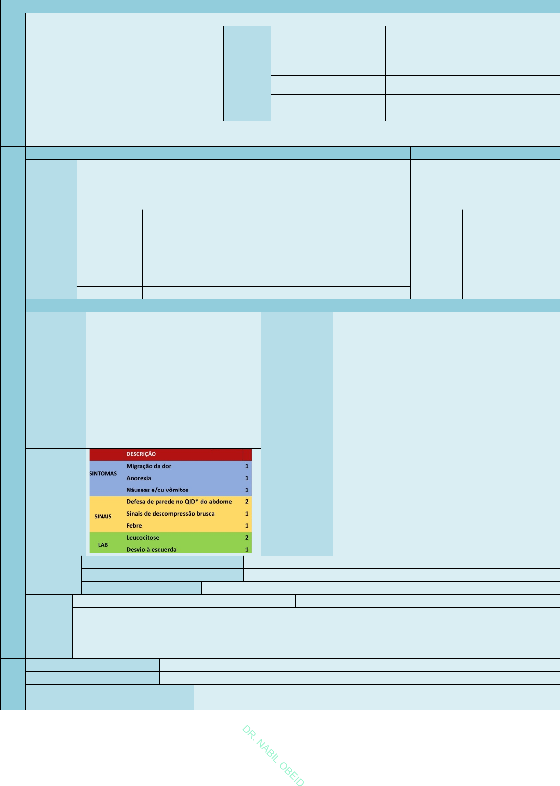 ABDÔMEN AGUDO INFLAMATÓRIO: APENDICITE AGUDA Def Inflamação aguda do apêndice, órgão que produz muco , que drena para o ceco. Et 1. Fecalito 2. Hiperplasia do tecido linfoide 3. Ascaris 4. Tumor carcinoide Fases Edematosa Início da obstrução e inflamação Supurativa/Fibrinosa Translocação bacteriana e dor localizada Gangrenosa/ Isquêmica ↑Distensão e obstrução arterial Perfurativa Avanço da necrose e perfuração Fisp Obstrução da luz apendicular, seguida de distensão progressiva e edema → proliferação bacteriana →distensão, isquemia e necrose. Mx Quadro Típico Quadro Atípico Sint 1. Hiporexia/anorexia 2. Dor abdominal leve-moderada, início periumbilical com migração á FID 3. Náusea e vômitos reflexos - Obs: imunodeprimidos não possuem o quadro típico - Surgem devido variedades de posição do apêndice Sinais Blumberg Dor no ponto de McBurney á descompressão brusca da FID Obturador Dor á rotação interna do quadril direito flexionado. Lenander Diferença entre a temperatura axilar e retal > 1°C Psoas para apêndice retrocecal Dor á hiperextensão da coxa, com paciente em decúbito lateral esquerdo. Dunphy Dor á percurssão do ponto de McBurney, ou ao comprimi-lo durante a tosse. Rovsing Dor na FID á descompressão da FIE Dx Laboratório Imagem Hemograma Leucocitose leve (12k-16k com desvio á esquerda (↑Bastonetes) Radiografia - Achados indiretos: borramento do músculo psoas do lado direito (deitado) - 1 NHA na FID (ortostático) EAS Se apêndice retroperitoneal, próximo ao ureter, pode apresetar hematúria e leucocitúria. US - Imagem tubular em fundo cego - Parede > 6 mm - Imagem alvo - Líquido/abscesso periapendicular - Obs: ainda que normais, se a suspeita clínica for alta, deve-se operar! TC com Contraste - Goldstandart - Apêndice tubular com líquido periapendicular - Borramento da Borda mesentérica - Borda > 6mm Escala de Alvarado 0-3: improvável 4-6: provável 7-10: muito provável Tto Cirúrgico Abordagem Clássica (oblíqua) - Incisão de McBurney (peritonite localizada) → Blumberg + só na FID Incisão Transversa (Davis-Rockey) - Infra umbilical → Peritonite Generalizada (permite lavar a cavidade) Videolaparoscopia - Também permite lavar a cavidade (pcte deve estar estável hemodinamicamente) Atb Casos iniciais, com peritonite localizada Cefoxitina (1hr antes da cirurgia até 24 após) Sépticos com Peritonite Difusa ou Abscessos - Cobrir gram negativos e anaeróbios: Ceftriaxone/Ciprofloxacino + Metronidazol Obs Drenagem percutânea + atb + cirurgia programada - Paciente jovem, BEG, sem peritonite generalizada, com abscesso periapendicular totalmente bloqueado, confirmado por imagem. Cx Infecção - da parede abdominal (+comum) → a conduta é apenas abertura dos pontos e drenagem. Sepse - Principal causa de morte por apendicite. Infecção Intra-abdominal - Abscesso Intracavitário (reoperar ou drenagem percutânea) Piliflebite - Trombose séptica da veia porta DR. NABIL OBEID