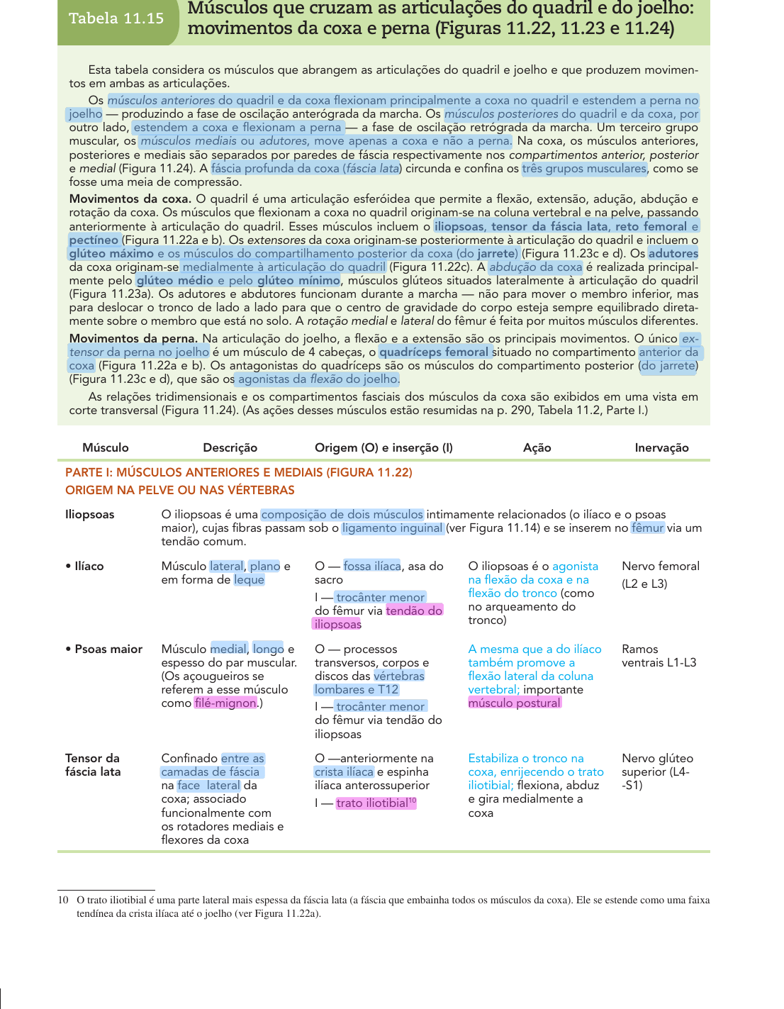 328 Anatomia humana Músculos que cruzam as articulações do quadril e do joelho: movimentos da coxa e perna (Figuras 11.22, 11.23 e 11.24)Tabela 11.15 Esta tabela considera os músculos que abrangem as articulações do quadril e joelho e que produzem movimen- tos em ambas as articulações. Os músculos anteriores do quadril e da coxa flexionam principalmente a coxa no quadril e estendem a perna no joelho — produzindo a fase de oscilação anterógrada da marcha. Os músculos posteriores do quadril e da coxa, por outro lado, estendem a coxa e flexionam a perna — a fase de oscilação retrógrada da marcha. Um terceiro grupo muscular, os músculos mediais ou adutores, move apenas a coxa e não a perna. Na coxa, os músculos anteriores, posteriores e mediais são separados por paredes de fáscia respectivamente nos compartimentos anterior, posterior e medial (Figura 11.24). A fáscia profunda da coxa (fáscia lata) circunda e confina os três grupos musculares, como se fosse uma meia de compressão. Movimentos da coxa. O quadril é uma articulação esferóidea que permite a flexão, extensão, adução, abdução e rotação da coxa. Os músculos que flexionam a coxa no quadril originam -se na coluna vertebral e na pelve, passando anteriormente à articulação do quadril. Esses músculos incluem o iliopsoas, tensor da fáscia lata, reto femoral e pectíneo (Figura 11.22a e b). Os extensores da coxa originam-se posteriormente à articulação do quadril e incluem o glúteo máximo e os músculos do compartilhamento posterior da coxa (do jarrete) (Figura 11.23c e d). Os adutores da coxa originam -se medialmente à articulação do quadril (Figura 11.22c). A abdução da coxa é realizada principal- mente pelo glúteo médio e pelo glúteo mínimo, músculos glúteos situados lateralmente à articulação do quadril (Figura 11.23a). Os adutores e abdutores funcionam durante a marcha — não para mover o membro inferior, mas para deslocar o tronco de lado a lado para que o centro de gravidade do corpo esteja sempre equilibrado direta- mente sobre o membro que está no solo. A rotação medial e lateral do fêmur é feita por muitos músculos diferentes. Movimentos da perna. Na articulação do joelho, a flexão e a extensão são os principais movimentos. O único ex- tensor da perna no joelho é um músculo de 4 cabeças, o quadríceps femoral situado no compartimento anterior da coxa (Figura 11.22a e b). Os antagonistas do quadríceps são os músculos do compartimento posterior (do jarrete) (Figura 11.23c e d), que são os agonistas da flexão do joelho. As relações tridimensionais e os compartimentos fasciais dos músculos da coxa são exibidos em uma vista em corte transversal (Figura 11.24). (As ações desses músculos estão resumidas na p. 290, Tabela 11.2, Parte I.) Músculo Descrição Origem (O) e inserção (I) Ação Inervação PARTE I: MÚSCULOS ANTERIORES E MEDIAIS (FIGURA 11.22) ORIGEM NA PELVE OU NAS VÉRTEBRAS Iliopsoas O iliopsoas é uma composição de dois músculos intimamente relacionados (o ilíaco e o psoas maior), cujas fibras passam sob o ligamento inguinal (ver Figura 11.14) e se inserem no fêmur via um tendão comum. Músculo lateral, plano e em forma de leque O — fossa ilíaca, asa do sacro I — trocânter menor do fêmur via tendão do iliopsoas O iliopsoas é o agonista na flexão da coxa e na flexão do tronco (como no arqueamento do tronco) Nervo femoral (L2 e L3) Músculo medial, longo e espesso do par muscular. (Os açougueiros se referem a esse músculo como filé -mignon.) O — processos transversos, corpos e discos das vértebras lombares e T12 I — trocânter menor do fêmur via tendão do iliopsoas A mesma que a do ilíaco também promove a flexão lateral da coluna vertebral; importante músculo postural Ramos ventrais L1 -L3 Tensor da fáscia lata Confinado entre as camadas de fáscia na face lateral da coxa; associado funcionalmente com os rotadores mediais e flexores da coxa O —anteriormente na crista ilíaca e espinha ilíaca anterossuperior I — trato iliotibial10 Estabiliza o tronco na coxa, enrijecendo o trato iliotibial; flexiona, abduz e gira medialmente a coxa Nervo glúteo superior (L4- -S1) 1 10 O trato iliotibial é uma parte lateral mais espessa da fáscia lata (a fáscia que embainha todos os músculos da coxa). Ele se estende como uma faixa tendínea da crista ilíaca até o joelho (ver Figura 11.22a). MARIEB_book.indb 328 07/04/14 18:23 Capítulo 11 Músculos do corpo 329 continuaçãoTabela 11.15 Músculo Descrição Origem (O) e inserção (I) Ação Inervação MÚSCULOS DO COMPARTIMENTO ANTERIOR DA COXA (FIGURAS 11.22 E 11.24) Sartório Músculo superficial em forma de fita que segue obliquamente pela superfície anterior da coxa até o joelho; músculo mais longo do corpo; cruza as articulações do quadril e do joelho O — espinha ilíaca anterossuperior I — com um trajeto espiral até a face medial do joelho, insere -se proximal e medialmente na tíbia Flexiona, abduz e gira lateralmente a coxa; flexiona a perna (fraco) como em um chute no futebol; ajuda a produzir a posição de pernas cruzadas (posição de lótus) Nervo femoral (L2 e L3) Quadríceps femoral Possui quatro cabeças distintas (quadríceps = quatro cabeças) que formam a musculatura anterior e lateral da coxa. Essas cabeças (músculos reto femoral e vastos lateral, medial e intermédio) possuem um tendão de inserção comum, o tendão do quadríceps, que se insere na patela e depois, via ligamento da patela, na tuberosidade da tíbia. O quadríceps é um poderoso extensor da perna utilizado na escalada, salto, corrida e ao levantar da posição sentada. O grupo é inervado pelo nervo femoral. O tônus do quadríceps é importante no fortalecimento da articulação do joelho. femoral Músculo superficial do compartimento anterior da coxa, onde se posiciona em linha reta é a cabeça mais longa e única do grupo do quadríceps a cruzar a