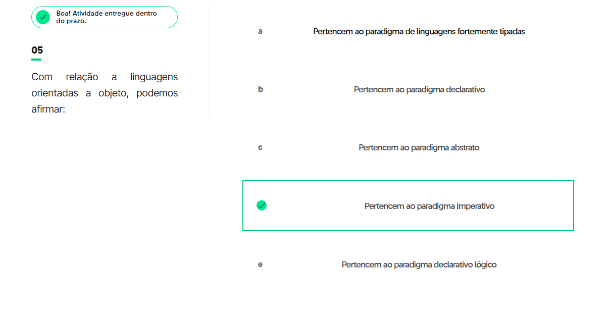 Boa! Atividade entregue dentro do prazo. a Pertencem ao paradigma de linguagens fortemente tipadas 05 Com relação a linguagens b orientadas a objeto, podemos Pertencem ao paradigma declarativo Pertencem ao paradigma abstrato Pertencem ao paradigma imperativo e Pertencem ao paradigma declarativo lógico