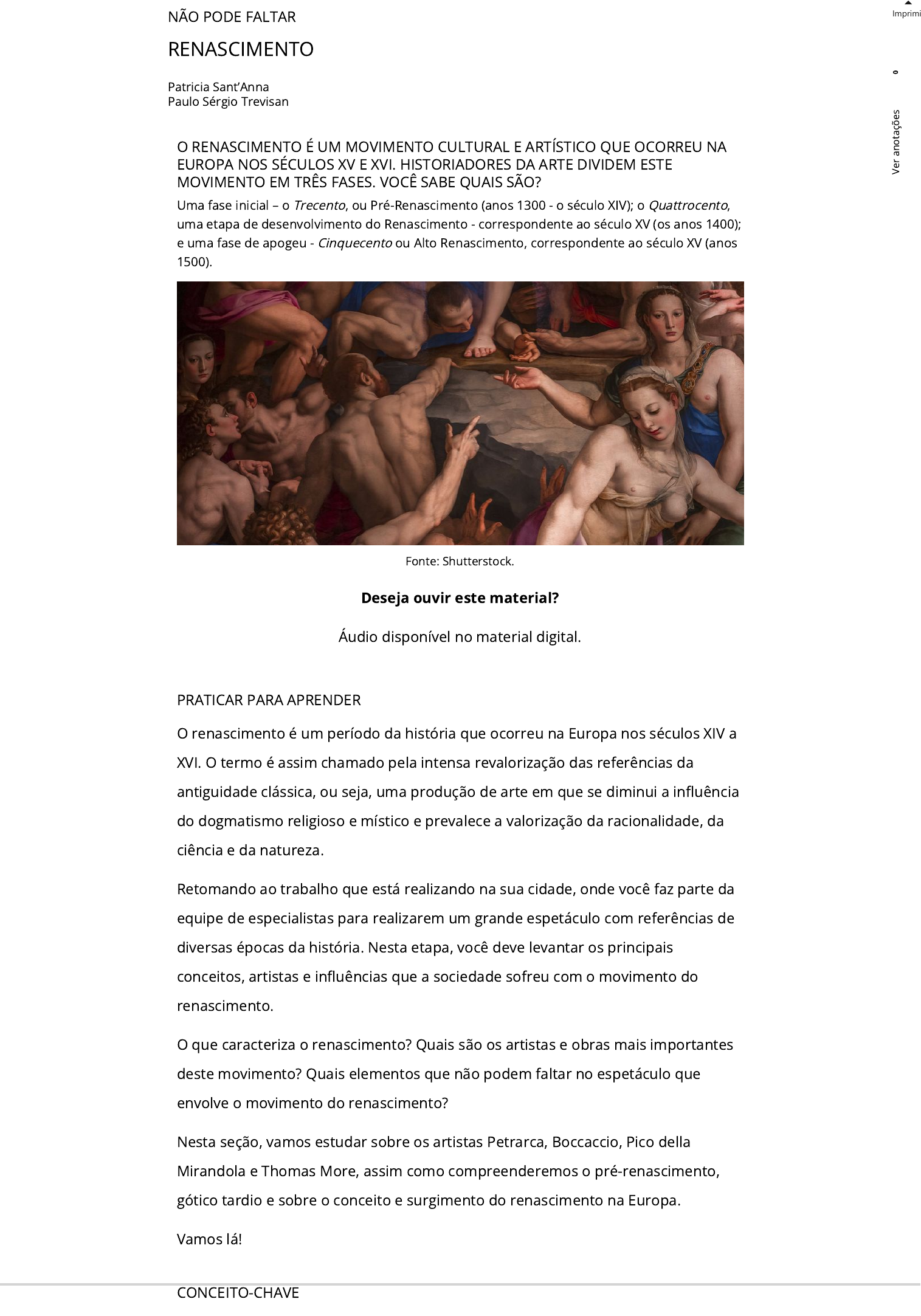 NÃO PODE FALTAR RENASCIMENTO Patricia Sant’Anna Paulo Sérgio Trevisan Imprimi PRATICAR PARA APRENDER O renascimento é um período da história que ocorreu na Europa nos séculos XIV a XVI. O termo é assim chamado pela intensa revalorização das referências da antiguidade clássica, ou seja, uma produção de arte em que se diminui a in�uência do dogmatismo religioso e místico e prevalece a valorização da racionalidade, da ciência e da natureza. Retomando ao trabalho que está realizando na sua cidade, onde você faz parte da equipe de especialistas para realizarem um grande espetáculo com referências de diversas épocas da história. Nesta etapa, você deve levantar os principais conceitos, artistas e in�uências que a sociedade sofreu com o movimento do renascimento. O que caracteriza o renascimento? Quais são os artistas e obras mais importantes deste movimento? Quais elementos que não podem faltar no espetáculo que envolve o movimento do renascimento? Nesta seção, vamos estudar sobre os artistas Petrarca, Boccaccio, Pico della Mirandola e Thomas More, assim como compreenderemos o pré-renascimento, gótico tardio e sobre o conceito e surgimento do renascimento na Europa. Vamos lá! CONCEITO-CHAVE O RENASCIMENTO É UM MOVIMENTO CULTURAL E ARTÍSTICO QUE OCORREU NA EUROPA NOS SÉCULOS XV E XVI. HISTORIADORES DA ARTE DIVIDEM ESTE MOVIMENTO EM TRÊS FASES. VOCÊ SABE QUAIS SÃO? Uma fase inicial – o Trecento, ou Pré-Renascimento (anos 1300 - o século XIV); o Quattrocento, uma etapa de desenvolvimento do Renascimento - correspondente ao século XV (os anos 1400); e uma fase de apogeu - Cinquecento ou Alto Renascimento, correspondente ao século XV (anos 1500). Fonte: Shutterstock. Deseja ouvir este material? Áudio disponível no material digital. 0 V e r a n o ta çõ e s O Renascimento é um movimento cultural e artístico que ocorreu na Europa em sintonia com outras profundas transformações que marcaram os séculos XV e XVI, como as grandes navegações, a estruturação do mercantilismo, a invenção do tipo móvel que propiciou a impressão de livros e folhetos, e a queda de Constantinopla diante os turcos. No campo do pensamento, o Humanismo (a valorização do potencial humano e de sua racionalidade), criava uma nova percepção do papel do homem no mundo. Surgiu na Itália em um período que o sistema mercantil e �nanceiro desenvolvido pela burguesia prosperavam rapidamente. Nessa mesma época, as cidades voltavam a ser o centro do modo de vida avançado e uma cultura humanista era cultivada em meios liberais – que protegiam e estimulavam o pensamento �losó�co e cientí�co, as artes, a erudição e a inventividade. Dadas as distâncias geográ�cas e culturas, o Renascimento em sua expansão pela Europa, ganhou aspectos particulares no Norte do continente. É comum historiadores da arte dividir o Renascimento em três fases: uma fase inicial – o Trecento, ou Pré-Renascimento (anos 1300 - o século XIV); o Quattrocento, uma etapa de desenvolvimento do Renascimento - correspondente ao século XV (os anos 1400); e uma fase de apogeu - Cinquecento ou Alto Renascimento, correspondente ao século XV (anos 1500). GÓTICO TARDIO Enquanto parte da Itália passava por renovações artísticas e valorizava uma cultura humanista fundada na tradição greco-romana, outras partes da Europa viam �orescer uma nova fase do gótico. Em regiões como Grã-Bretanha, Alemanha, França (e mesmo no norte da Itália), por exemplo, muitas realizações importantes ligadas ao estilo, também conhecido como Gótico Internacional, foram criadas no século XIV e XV. Em Flandres e na Holanda, graças a uma rica atividade mercantil que favorecia o desenvolvimento de grandes centros urbanos, o estilo pode �orescer e marcar o desenvolvimento da pintura na região. Na arquitetura esta fase se distingue das anteriores por sobrecarregar os elementos decorativos �uidos nas fachadas e nos interiores das catedrais. Proliferam formas que lembram labaredas e estruturas compostas por elementos radiais (em �nalização de janelas e mesmo nas rosáceas). Na Inglaterra, um exemplo é o claustro da Catedral de Gloucester, de 1400, em que se vê o uso dos efeitos do arco ogival em tetos em forma de leque – aí o arco é tomado como elemento decorativo que se repete e cria uma forma dinâmica e sobrecarregada que se abre. Diferentemente das épocas anteriores, edifícios sem �nalidade religiosa são projetados com o estilo tardio. O Palácio Ducal em Veneza, iniciado em 1309, é um bom exemplo de arquitetura civil do Gótico Tardio, nele observamos as adaptações locais que o estilo sofria nas diversas regiões: vemos a combinação dos arcos pontiagudos estruturados, e ao invés de buscar as alturas, o edifício valoriza as linhas horizontais. A pintura da época do Gótico Internacional, realizada como painéis ou iluminuras, inova ao fazer uso da tinta a óleo para criar um grande grau de detalhamento da natureza, de tecidos, objetos e corpos. O grande efeito naturalista conseguido pelos efeitos da tinta a óleo e o uso da perspectiva (que não foram presentes nas 0 V e r a n o ta çõ e s outras etapas da pintura gótica), soma-se a uma harmoniosa combinação de elementos ornamentais (visíveis, por exemplo, nos tecidos das roupas das �guras), personagens de corpos longilíneos, rostos ovalados e dedos delgados, corpos escultoricamente volumosos, em ambientes ora naturalistas ora planos e dourados. O italiano Gentile da Fabriano (c.1370-1427), com seus painéis religiosos, e os irmãos Limbourg (Jean (c. 1388 - 1416), Herman (c. 1385 - 1416) e Paul (c. 1386/87 - 1416), com suas iluminuras na França, podem ser lembrados como grandes realizadores do estilo. Destacam-se no Norte, os irmãos Van Eyck [Hubert (c. 1366-1426) e Jan (c. 1385-1441)], a quem alguns historiadores atribuem a invenção e difusão da pintura a óleo, já nos princípios do século XV. Em O ret