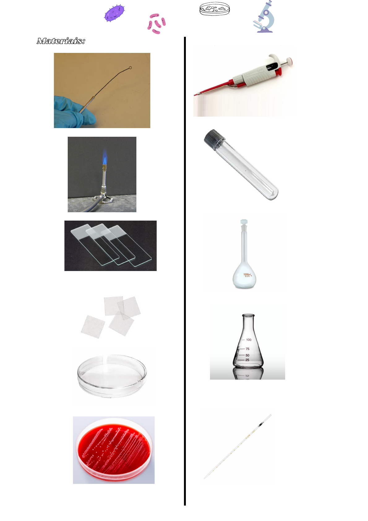 Microbiologia- Práticas Materiais: Alça de platina: Bico de bunsen: Lâmina: Lâmínula: Placa de Petri : Pipeta: Pipeta semi-automática: Tubo de ensaio: Balão volumétrico: Erlenmeyer: Placa de Petri com meio de cultura: Proveta graduada: Béquer: Autoclave: Autoclave vertical: Incubadora/Estufa: Banho Maria: Microscópio: pHmetro: Shaker: Equipamentos: Pisseta: Coloração de Ziehl Neelsen(B.A.A.R)-álcool-ácido resistência: Bactérias do gênero Mycobacterium são resistente a coloração de GRAM/simples---- Falso positivo Motivo: estrutura externa a parede celular de natureza lipídica, formada por Cera D/ ácido micólico Fucsina permite a entrada da coloração na bactéria (facilitada pelo calor) Importância: Nesse gênero, estão contidas as bactérias Mycobacterium leprae (causa hanseníase) e Mycobacterium tuberculosis (causa tuberculose) B.A.A.R += VERMELHO B.A.A.R -= AZUL Coloração de GRAM: Dentre as estruturas essenciais das bactérias, tem se a parede celular (é por meio das diferenças nela que se realiza a coloração de GRAM) Parede Celular: -Mais externa Estrutura das paredes celulares das bactérias: -Previne ruptura da célula por lise osmótica -Funciona como fator de virulência (mecanismo que o microrganismo utiliza para agredir o hospedeiro) -Sua composição induz resposta imune -Local de ação de antibióticos (ex:penicilina) -Complexas quimicamente -Formadas por peptideoglicanos -Peptideoglicano: Base de carboidrato (N-acetilglicosamina e N- acetilmurâmico alternados) e cadeia lateral de tetrapeptídeos -GRAM +: Membrana citoplasmática + peptideoglicano (40 camadas-espessa) -GRAM -: Membrana citoplasmática+ peptideoglicano (2 camadas- delgada)+periplasma+membrana externa (com LPS) Cristal violeta: Encontra a parede celular e penetra na camada de peptideoglicano. Cora GRAM + e GRAM - de roxo Lugol (com iodo): Se combina com cristal violeta formando um complexo químico e dificultando a saída da cor Álcool-cetona: Álcool não é capaz de remover as 40 camadas com cristal violeta + lugol que estão coloridas--- GRAM += roxa; GRAM -= sem cor (destrói a membrana externa e descora a camada de peptideoglicano) Contra-corante (fucsina de GRAM) 1. 2. 3. 4. Vermelha. GRAM += não acontece nada e nas GRAM -= coloração vermelha/rosa Espécies utilizadas: Escherichia coli, Staphylococcus aureus, Streptococcus pyogenes Bactéria:Escherichia coli Forma: Bacilos Arranjo: Estreptobacilos ou diplobacilos Coloração: Rosa/vermelha Resposta a GRAM: Negativa Patogenicidade: Sim (infecção no trato digestivo,trato urinário (principalmente),etc. Bactéria: Streptococcus pyogenes Forma: Coco Arranjo: Estreptococos Coloração: Roxa Resposta a GRAM: Positiva Patogenicidade: Sim (faringites) Bactéria: Staphylococcus aureus Forma: Cocos Arranjo: Estafilococos Coloração: Roxa Resposta a GRAM: Positiva Patogenicidade: Sim (infecções de pele e algumas vezes pneumonia,endocardite e osteomielite. Na maioria das vezes, provoca a formação de abscesso) Lavagem das mãos: Contagem das UFC-Unidades Formadoras de Côlonia 1 - - 2 50 15 3 26 12 4 19 - BANCADA ANTES DEPOIS 1- Água 2- Detergente 3- PVPI 4-Álcool 70% Não possui ação microbicida Remoção--- remoção mecânica Dissolve a membrana citoplasmática do microrganismo Antisséptico usado na prática clínica Iodo---halogênio (Cl e F também são) Interfere na síntese proteica de proteínas essenciais, causa alteração na membrana celular Limitação: É tintorial (mancha), comum causar alergia Bactericida e fungicida Desnaturação de proteínas e dissolução de lipídeos Álcool 70% penetra melhor na membrana (30% água e 70% álcool puro ) 1- Água 2- Detergente 3- PVPI (Iodo polvidona) 4-Álcool 70% Terminologia: Esterilização: Destruição de TODAS as formas de vida bacteriana, incluindo os endósporos* (ÚNICO MÉTODO QUE DESTRÓI) Desinfecção: destruição das formas vegetativas de microrganismos patogênicos em superfícies inertes Assepsia: destruição das formas vegetativas de microrganismos patogênicos em tecido vivo Sanitização: Redução das contagens microbinas em utensílio s alimentares, equipamentos industriais etc. *2 gêneros de GRAM +: Clostridium e Bacillus Funcionamento da autoclave: Calor úmido Adição de água DESTILADA (água normal oxida a autoclave) Desnatura e coagula as proteínas (ENDÓSPORO E VEGETATIVA) Funcionamento "panela de pressão" Teste de Snyder: 1 - - + pequena 2 - - - negativa 3 - - + pequena 4 - - - negativa BANCADA 24 48 72 ATV. DE CÁRIE Digital (clínica,consultório) ou manual (laboratório, hospital) Aumenta a temperatura (121° C) e a pressão (15 lb/pol2) Quando chega a esses níveis inicia- se esterilização Por 15 minutos---- depois temperatura e pressão diminuem O material deve estar SECO e embalado adequadamente (filme plástico, papel grau cirúrgico,TNT, todos selados) Monitoramento -Fiscalização sanitária -Indicador biológico---tubos com esporos com bactérias altamente resistentes à calor----indicador de pH púrpura---púrpura (sem crescimento microbiano) púrpura---amarelo (com crescimento microbiano) -= verde/ += amarelo Avalia a atividade cariogênica DO INDIVÍDUO Avaliação feita periodicamente em um intervalo de 24 horas SALIVA NÃO PRODUZ ÁCIDO (não tem atividade cariogênica)----serve como veículo da bactéria Meio de cultura de Snyder fornece carboidratos e o indivíduo bactéria (principalmente Streptococcus mutans), inicialmente com a cor verde Fermentação dos carboidratos pelas bactérias produz ácido (ácido láctico principalmente) e por consequência abaixa o pH, fazendo com que o meio se torne amarelado Ação antimicrobiana: Pinho sol 20 20 29 30 Clorexidina 2% 15 23 26 25 Álcool 70% 10 0 - - Clorexidina 20 12 18 23 Cloro 15 22 16 25 H2O2 - - 8 - E. coli S. aureus *halo (diâmetro) em mm Diferença de operação aceitável Microrganismo diferentes respondem de formas diferentes Clorexidina funciona nos doi