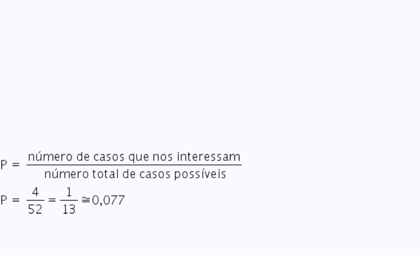Qual a probabilidade de tirar um ás ao retirar ao acaso uma carta de um baralho com 52 cartas possuindo quatro naipes (copas, paus, ouros e espadas) sendo 1 ás em cada naipe? Ver Resposta Resposta correta: 7,7% O evento de interesse é tirar um ás do baralho. Se há quatro naipes e cada naipe possui um ás, logo, o número de possibilidades de retirar um ás é igual a 4. O número de casos possíveis corresponde ao número total de cartas, que é 52. Substituindo na fórmula de probabilidade, temos: Multiplicando o resultado por 100, temos que a probabilidade de retirar uma bola azul é de 7,7%. image1.png