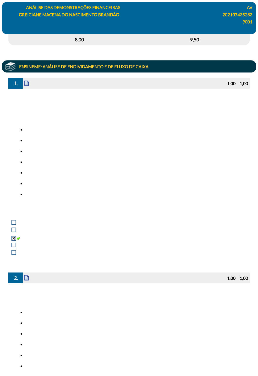 Disciplina: ANÁLISE DAS DEMONSTRAÇÕES FINANCEIRAS AV Aluno: GREICIANE MACENA DO NASCIMENTO BRANDÃO 202107435283 Turma: 9001 EGT0011_AV_202107435283 (AG) 06/04/2023 08:22:32 (F) Avaliação: 8,00 pts Nota SIA: 9,50 pts ENSINEME: ANÁLISE DE ENDIVIDAMENTO E DE FLUXO DE CAIXA 1. Ref.: 3991328 Pontos: 1,00 / 1,00 Além dos índices de cobertura de juros tradicionais, calculados com informações proveniente da demonstração do resultado do exercício, contemporaneamente analistas �nanceiros têm utilizado em seus pareceres sobre o risco de inadimplência das corporações indicadores de cobertura baseados na demonstração do �uxo de caixa, denominados índices de cobertura com caixa. Vamos supor que a RGN apresentou em seu último exercício os seguintes resultados: Dividendos = $200 Despesas Financeiras Líquidas = $150 Empréstimos e Financiamentos = $1.500 Imposto de Renda e Contribuição Social = $200 Depreciação e Amortização = $150 LAJI = $900 Fluxo de Caixa Operacional = $800 Com base nessas informações podemos dizer que o índice de cobertura de juros com caixa da RGN no último exercício foi de: 6,00 6,33 7,67 0,76 8,33 2. Ref.: 3991329 Pontos: 1,00 / 1,00 Uma das categorias de indicadores de �uxo de caixa é a dos retornos de �uxo de caixa. Esses indicadores seguem uma lógica similar aos índices de retorno baseados na DRE, utilizando, porém, informações provenientes do DCF. Vamos supor que a IUY apresentou em seu último exercício os seguintes resultados: Despesas Financeiras Líquidas = $ 100 Ativo Total = $ 2.000 Depreciação e Amortização = $150 Fluxo de Caixa Operacional = $ 500 Imposto de Renda e Contribuição Social = $ 80 Passivo Exigível = $ 800 27/05/2024, 11:03 EPS https://simulado.estacio.br/alunos/ 1/5 javascript:alert('C%C3%B3digo da quest%C3%A3o: 3991328.'); javascript:alert('C%C3%B3digo da quest%C3%A3o: 3991328.'); javascript:alert('C%C3%B3digo da quest%C3%A3o: 3991329.'); javascript:alert('C%C3%B3digo da quest%C3%A3o: 3991329.'); Com base nessas informações podemos dizer que o retorno do caixa sobre patrimônio líquido da IUY no último exercício foi de: 37% 42% 34% 63% 25% 3. Ref.: 3991326 Pontos: 1,00 / 1,00 Além do ICJ LAJI e o ICJ LAJIDA, um outro índice de cobertura considerado bastante robusto é o índice de cobertura do serviço da dívida, que se diferencia dos demais por: adicionar ao numerador do ICJ LAJIDA o pagamento do principal dos empréstimos e �nanciamento da empresa efetuado no período analisado. adicionar ao denominador do ICJ LAJIDA o pagamento do principal dos empréstimos e �nanciamentos da empresa efetuado no período analisado. adicionar ao numerador do ICJ LAJI o pagamento do principal dos empréstimos e �nanciamento da empresa efetuado no período analisado. deduzir do denominador do ICJ LAJIDA o pagamento do principal dos empréstimos e �nanciamento da empresa efetuado no período analisado. deduzir ao numerador do ICJ LAJI o pagamento do principal dos empréstimos e �nanciamento da empresa efetuado no período analisado. ENSINEME: ANÁLISE FINANCEIRA DE CURTO PRAZO 4. Ref.: 5429739 Pontos: 1,00 / 1,00 A LSN apresentou em seu último exercício contábil uma receita líquida de vendas de $14.000, um prazo médio de estoques (PME) de 30 dias, um prazo médio de pagamento de compras (PMC) de 40 dias e um prazo de recebimento (PMR) de 33 dias. Considerando que além das contas estoques, clientes e fornecedores não existam contas que in�uenciem o AOCP e o POCP da empresa, podemos estimar que a NCG da LSN seria de aproximadamente: $452 $894 $1.673 $4.006 $1.439 5. Ref.: 7703793 Pontos: 0,00 / 1,00 O crédito concedido aos clientes é um arti�cio bastante utilizado na tentativa de alavancar as vendas das empresas. Além das pessoas que têm acesso às informações gerencias, analistas externos podem estimar o prazo médio de recebimentos de clientes (PMR) pelo estudo de informações provenientes dos demonstrativos �nanceiros. Considere as seguintes informações �nanceiras provenientes da MNB, relativas ao ano de 20X1: Lucro Líquido = 130 Estoques = 250 27/05/2024, 11:03 EPS https://simulado.estacio.br/alunos/ 2/5 javascript:alert('C%C3%B3digo da quest%C3%A3o: 3991326.'); javascript:alert('C%C3%B3digo da quest%C3%A3o: 3991326.'); javascript:alert('C%C3%B3digo da quest%C3%A3o: 5429739.'); javascript:alert('C%C3%B3digo da quest%C3%A3o: 5429739.'); javascript:alert('C%C3%B3digo da quest%C3%A3o: 7703793.'); javascript:alert('C%C3%B3digo da quest%C3%A3o: 7703793.'); Fornecedores = 200 Custo dos Produtos Vendidos = 500 Clientes = 300 Receita bruta de vendas = 1.200 Com base nos dados �nanceiros de 20X1, podemos a�rmar que PMR da MNB foi de: 90 dias. 180 dias. 60 dias. 45 dias. 75 dias. ENSINEME: INDICADORES DA RENTABILIDADE E SITUAÇÃO ECONÔMICA DE EMPRESAS 6. Ref.: 6053752 Pontos: 1,00 / 1,00 No cálculo do lucro econômico é possível utilizar quatro tipos de formulações, que podem, por sua vez, ser divididas em dois grupos: a abordagem que se baseia nos recursos investidos pelos sócios da empresa (patrimônio líquido) e a abordagem que se baseia em todo capital investido (capital investido). Considerando essa distinção é possível a�rmar que: na abordagem do capital investido pelos sócios e credores o Ke não é considerado. na abordagem do patrimônio líquido o Ke é considerado. a abordagem do capital investido pelos sócios utiliza o WACC explicitamente no cálculo do lucro econômico. na abordagem do capital investido pelos sócios e credores o Kd é explicitamente considerado. a abordagem do capital investido pelos sócios e credores utiliza o Ke explicitamente no cálculo do lucro econômico. 7. Ref.: 3991281 Pontos: 1,00 / 1,00 Analistas corporativos e atuantes no mercado �nanceiro analisam demonstrativos contábeis de empresas visando avaliar a saúde econômico �nanceira dessas companhias. Para tanto, utilizam diferentes indicadores escolhidas em função 