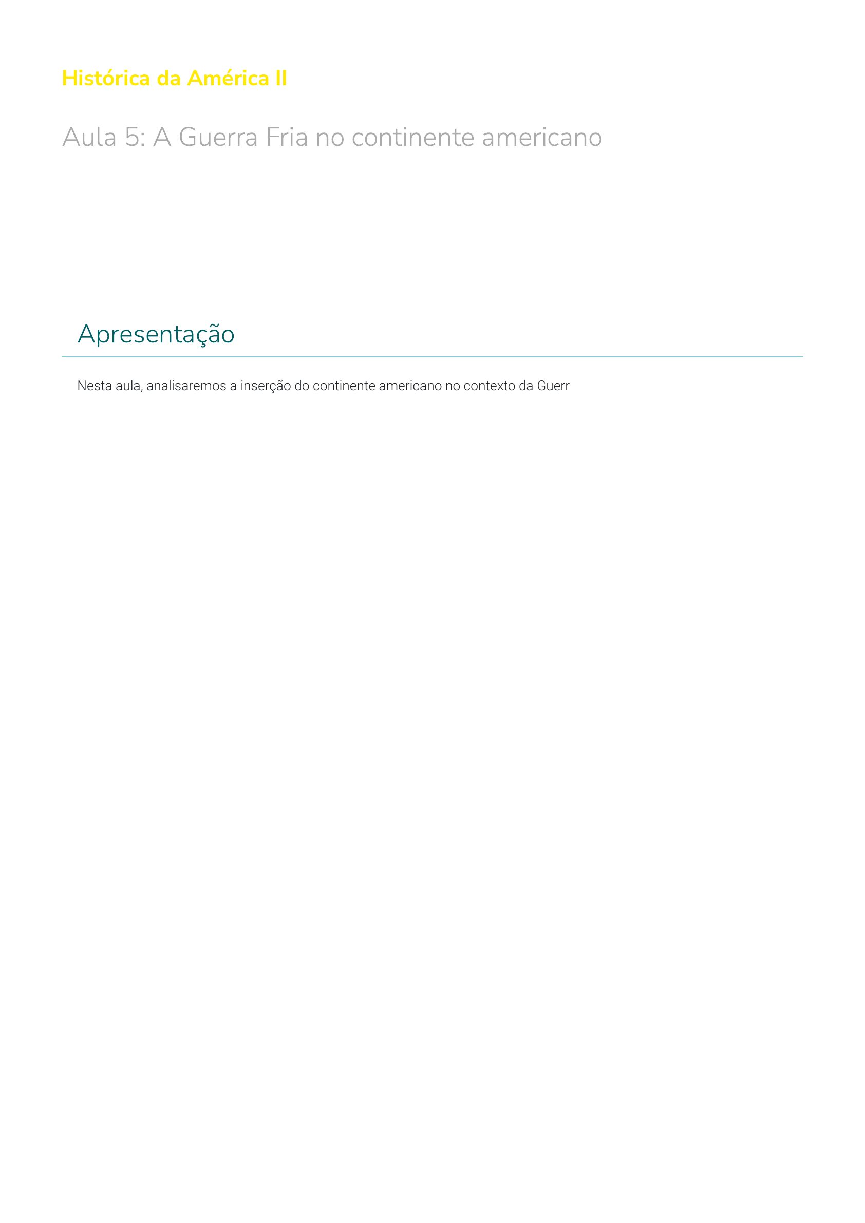 Histórica da América II Aula 5: A Guerra Fria no continente americano Apresentação Nesta aula, analisaremos a inserção do continente americano no contexto da Guerra Fria considerando como os países da região se posicionaram diante desse con�ito internacional. É importante destacar que a Guerra Fria foi um acontecimento praticamente global, deixando em lados opostos países de diferentes continentes, e teve como um de seus principais atores um país do continente americano ― os Estados Unidos da América. Consideraremos ainda o contexto político e econômico que a América Latina passou a compor com o término da Segunda Guerra Mundial e as mudanças que ocorreram na região, pois diversas ações adotadas na política da América Latina foram pautadas na existência da Guerra Fria e relacionadas aos acontecimentos que nortearam esse con�ito. Objetivos Analisar a inserção do continente americano na Guerra Fria; Identi�car as relações entre a América Latina e a Guerra Fria, compreendendo a inserção dessa região no con�ito; Relacionar ao contexto da Guerra Fria algumas mudanças políticas ocorridas na América Latina. A inserção do continente americano na Guerra Fria (Fonte: Shutterstock). Conforme estudamos em aula anterior, a Segunda Guerra Mundial constituiu um fenômeno global que envolveu direta ou indiretamente todos os países do mundo. O continente americano se viu envolvido diretamente no con�ito após o ataque japonês à base naval de Pearl Harbor, no Pací�co, em 1941. Atenção O envolvimento dos Estados Unidos na Segunda Guerra foi um fator de suma importância para a vitória dos Aliados e marcou a inserção do continente americano na política internacional que se organizou no pós-Segunda Guerra. A expansão do comunismo pelo mundo (Fonte: Shutterstock). Ao �m da guerra, a participação dos Estados Unidos e da União Soviética na vitória dos Aliados consolidou uma rivalidade que se estendeu por toda a segunda metade do século XX. Comentário Temos de considerar a posição da América Latina nesse contexto, sobretudo porque a participação da União Soviética nessa vitória fez com que o prestígio do comunismo aumentasse bastante e, com isso, houve também uma expansão dos partidos comunistas pelo mundo. Mudanças políticas na América Latina O historiador Leslie Bethell a�rma que o período entre 1944-1945 e 1947-1948 não foi um divisor de águas na América Latina, apesar das mudanças políticas ocorridas, e isso se deveu especialmente ao fato de a região estar passando por certo isolacionismo internacional. Comentário Temos de considerar, no entanto, que esse período foi marcado por questões internas muito fortes em vários de seus países, como a democratização que passou a existir na região, uma forte tendência à esquerda e à militância trabalhista. Houve a queda de ditadores e a mobilização das forças populares. Partidos progressistas e reformistas começavam a chegar ao poder. Atenção Em alguns países, por causa do prestígio obtido pelos soviéticos ao término da Segunda Guerra Mundial, os partidos comunistas passaram a ganhar um pouco mais de espaço. Podemos citar aqui o Brasil, que teve seu Partido Comunista do Brasil legalizado ao término do con�ito, podendo disputar cargos eleitorais. O principal fator por trás das mudanças políticas na América Latina durante os anos de 1944, 1945 e 1946 foi a vitória dos Aliados na Segunda Guerra Mundial. A despeito do poderio do Eixo, especialmente da Alemanha, dos interesses na América Latina e, de fato, das amplas simpatias pró-Eixo e pró-fascismo veri�cadas em toda a região no �nal da década de 1930 e começo da década de 1940, logo depois de Pearl Harbor todos os estados latino- americanos, com exceção do Chile e da Argentina, alinharam-se com os Estados Unidos e romperam relações com as potências do Eixo; ao �m, muitos deles, embora não até 1945, declararam guerra. Quando �cou óbvio que os Aliados venceriam a guerra ― a derrota alemã de Stalingrado, em fevereiro de 1943, assinalou a mudança da maré ―, evidenciando-se a natureza da ordem política e econômica internacional que iria imperar no pós-guerra e a posição hegemônica dos Estados Unidos no seio dela, os grupos dominantes da América Latina, inclusive os militares, reconheceram a necessidade de fazer alguns ajustes políticos e ideológicos, além de concessões. " - Bethell; Roxborough, 1996 A democracia – o novo caminho Ao �m da Segunda Guerra, a democracia passou a ser o caminho buscado pelos países em virtude de fortes pressões políticas internas e do novo rumo que estava sendo dado na região. A partir de 1947, a América Latina começou a passar por um processo de aprofundamento da Guerra Fria. O mundo do trabalho começou a ser mais fortemente controlado, e o alinhamento internacional com os estadunidenses se consolidou efetivamente, passando a ocupar um espaço central na política latino-americana em toda a segunda metade do século XX. (Fonte: Shutterstock). A vitória dos Aliados na guerra – consequências Com a vitória dos Aliados na guerra, houve uma expansão do comunismo em todo o mundo, com a ascensão dos partidos comunistas ao poder e sua inserção na vida política de alguns países. No entanto, após um curto período, esses partidos começaram a ser perseguidos, caíram no ostracismo, como o Partido Comunista da Argentina, ou foram postos na ilegalidade, como o Partido Comunista do Brasil. Cada país buscou se inserir na lógica da Guerra Fria de acordo com seus interesses, mas é fator consolidado que a América se alinhou com os Estados Unidos, e isso fez com que o continente passasse a estar sob a ótica capitalista, buscando repelir qualquer in�uência soviética. "A preocupação dos Estados Unidos em relação à América Latina no início da guerra fria se concentra especialmente nas posturas nacionalistas de alguns